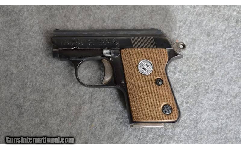 Description: This Colt Automatic is a very compact, lightweight automatic pistol of exceptional power and accuracy for its size. Designed primarily as a lightweight, easy-to-carry pocket handgun, it also incorporates those features which make it a good "plinker". All parts are carefully machined to close tolerances and only the finest steels and super-tough alloys are used in its construction. This pistol is in great condtion for its age. .25 ACP Chambers: 25 ACP Metal Condition: Excellent Wood Condition: Excellent Bore Condition: Bright and shiny Barrels: 2" barrel Triggers: Crisp Weight: lbs. Sights: Iron sights Item Location: Huntsville, AL Price: $499.99 Contact Seller |