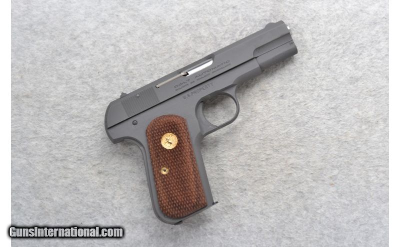 Description: This Colt Model 1903 "Hammerless" Pocket Pistol is a faithful reproduction of a historical firearm. The right side of the gun is stamped COLT AUTOMATIC, Calibre 32 Rimless Smokeless and U.S. Property. It comes in a grey Parkerized finish with diamond checkered wood grip panels. It was designed with manual and automatic safety devices. It comes with its original box and Owners Manual. SOLD Caliber Info: .32 Rimless Chambers: 8 shot magazine. Metal Condition: Excellent. Wood Condition: Excellent. Bore Condition: Excellent. Barrels: 3.75 inches. Grey Parkerized finish slide. Triggers: Solid. Stock: Diamond checkered grip flat finish walnut with golden Colt horse medallions. Grey Parkerized finish frame. Weight: 26 oz. Sights: Blade front. Notch rear. Item Location: Richfield, WI |