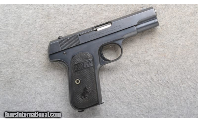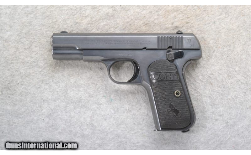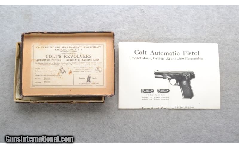 Description: This Colt Model Automatic is a right hand semi-auto pistol in .32 Rimless Cal. It has a 3.75 inch barrel with a rear serrated slide. A blade front sight and notch rear sight. The grip panels are a checkered hard black plastic with Colt and the Colt horse logo. S/N 407700 comes in its original box. .32 ACP SOLD Chambers: 7 round magazine. Metal Condition: Very Good. Bore Condition: Excellent. Barrels: 3.75 inch barrel with a rear serrated slide. Weight: 24 oz. Sights: Blade front. Notch rear. Item Location: Richfield, WI |