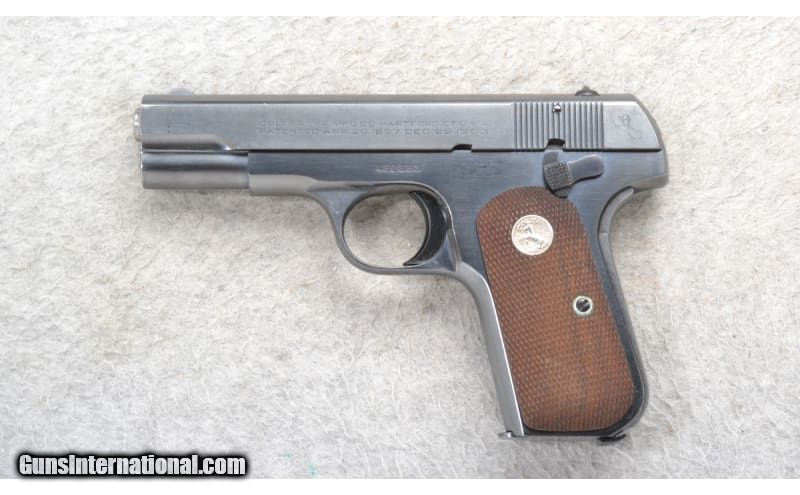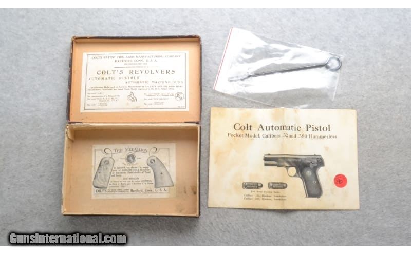 Description: This Colt Model Automatic is a right hand semi-auto pistol in .32 Rimless Cal. It has a 3.75 inch barrel with a rear serrated slide. A blade front sight and notch rear sight. The grip panels are a checkered grip hardwood with silver Colt horse medallions. Serial Number 491593 comes in its original box. .32 ACP SOLD Chambers: 7 shot magazine. Metal Condition: Very Good. Some minor handling/use marks. Wood Condition: Very Good. Bore Condition: Excellent. Barrels: 3.75 inch barrel with a rear serrated slide. Weight: 24 oz. Sights: Blade front. Notch rear. Item Location: Richfield, WI |