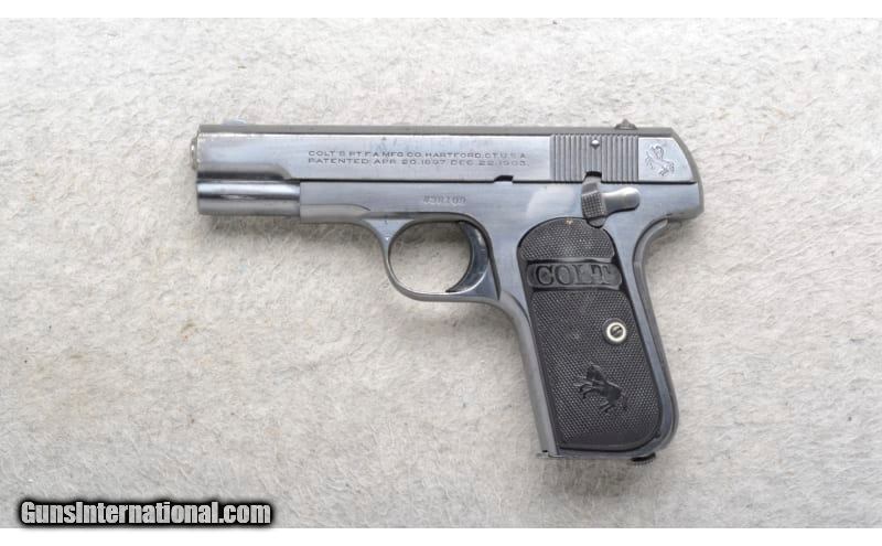 Description: This Colt Model Automatic is a right hand semi-auto pistol in .32 Rimless Cal. It has a 3.5 inch barrel with a rear serrated slide A blade front sight and notch rear sight. The grip is a checkered dark Bakelite with COLT and the Colt horse logo. Serial Number 438109. .32 ACP SOLD Chambers: 7 shot magazine. Metal Condition: Fair. Has many light handling/use marks. Bore Condition: very Good. Barrels: 3.5 inch barrel with a rear serrated slide. Weight: 26 oz. Sights: Blade front. Notch rear. Item Location: Richfield, WI |