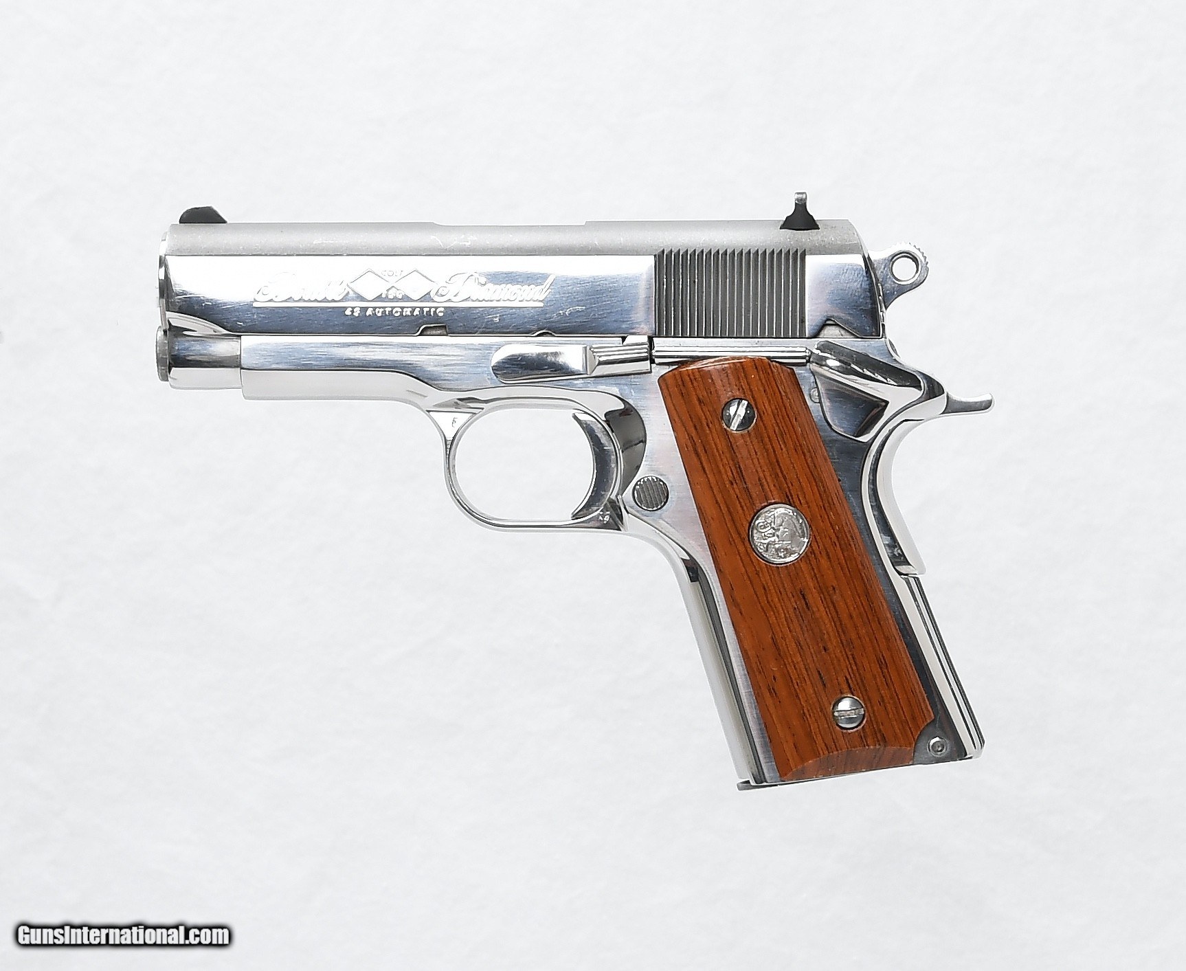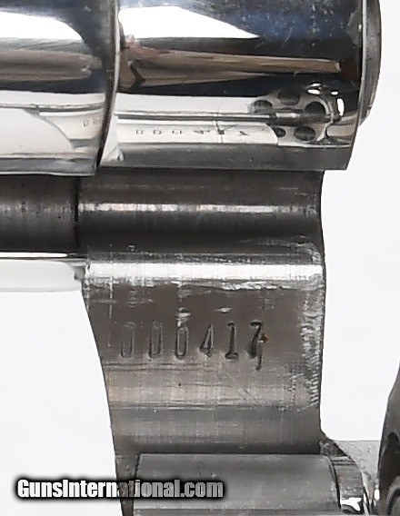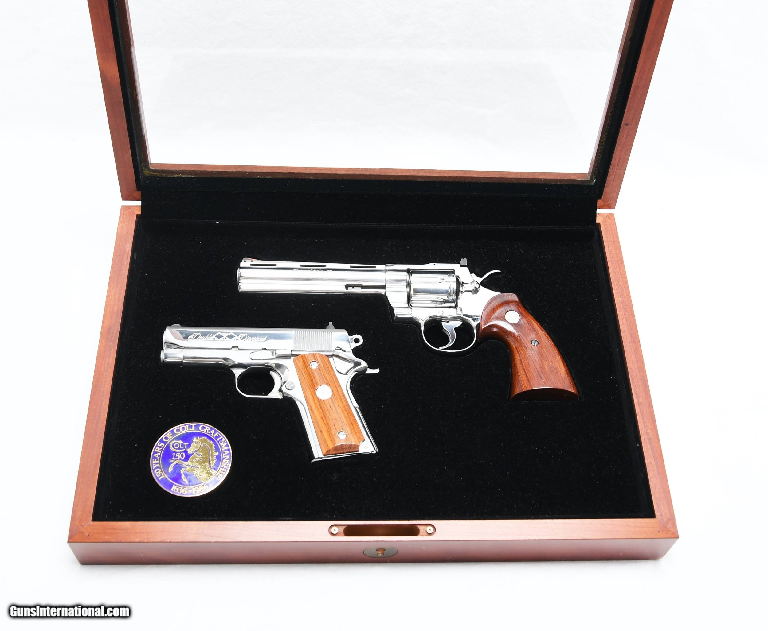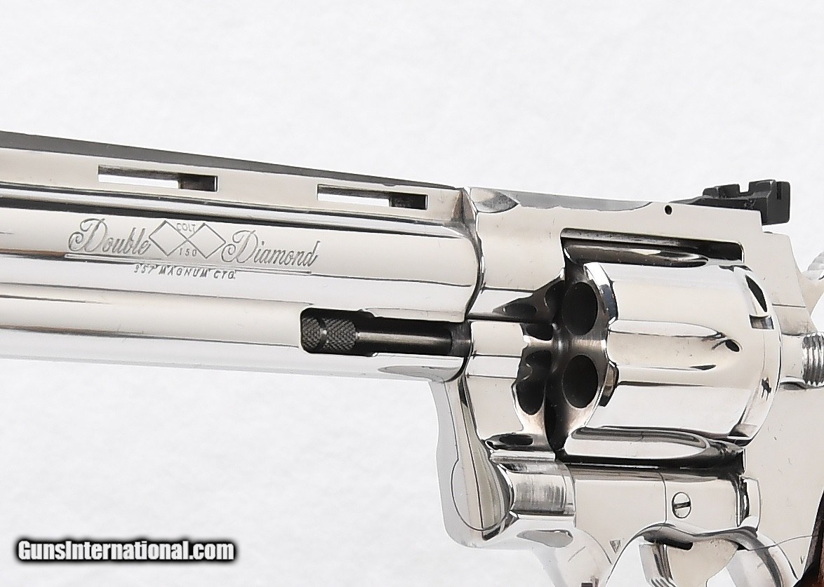 Description: Colt Double Diamond Set. 6” barreled bright stainless-steel Python and a bright stainless-steel 1911 Commander. Both guns are engraved with the Double Diamond logo and they are serial numbered: DD 0417 for the Python and 0417 DD for the Commander. This set is new and unfired but not perfect! The have sat in the factory display case and consequently there is a very, very small spot of pitting on the top, right behind the ejection port on the Commander and some other extremely small handling marks are both guns. Also, there is a “ding” or two on the grips on both handguns. Otherwise these present beautifully and they are a very collectible pair of guns. There are no boxes with this set. $6,200.00 SN: DD0417 & 0417DD SOLD |