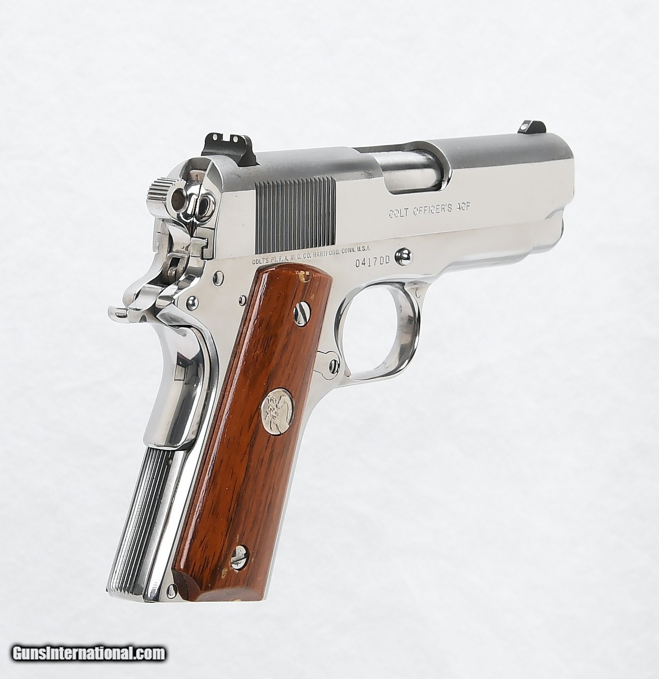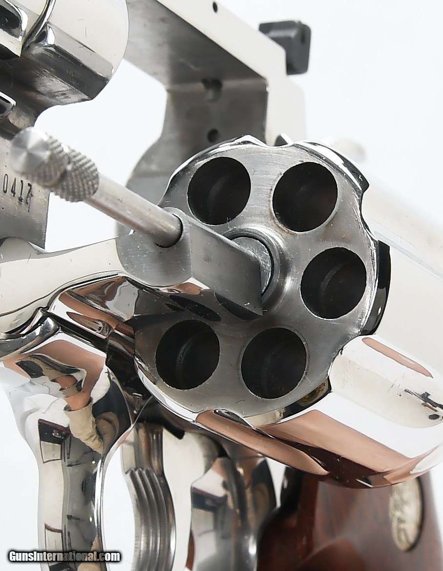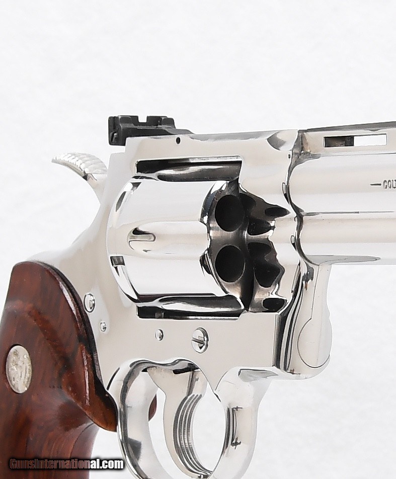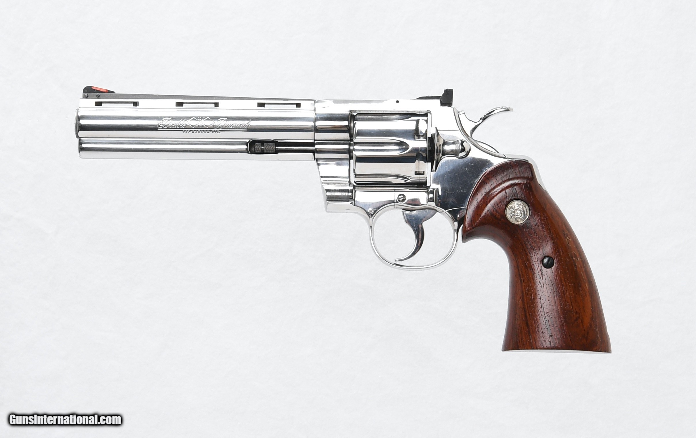 Description: Colt Double Diamond Set. 6” barreled bright stainless-steel Python and a bright stainless-steel 1911 Commander. Both guns are engraved with the Double Diamond logo and they are serial numbered: DD 0417 for the Python and 0417 DD for the Commander. This set is new and unfired but not perfect! The have sat in the factory display case and consequently there is a very, very small spot of pitting on the top, right behind the ejection port on the Commander and some other extremely small handling marks are both guns. Also, there is a “ding” or two on the grips on both handguns. Otherwise these present beautifully and they are a very collectible pair of guns. There are no boxes with this set. $6,200.00 SN: DD0417 & 0417DD SOLD |