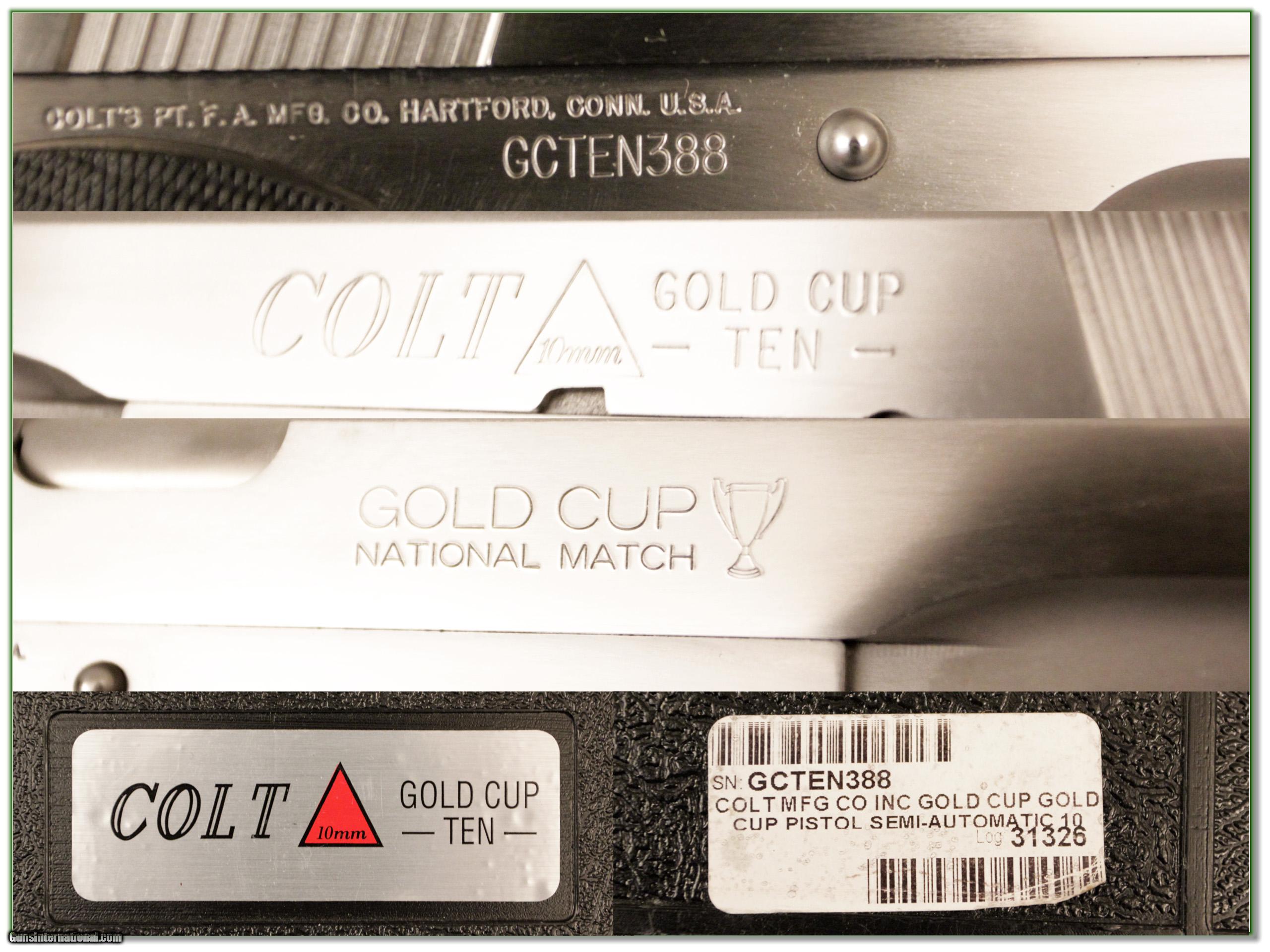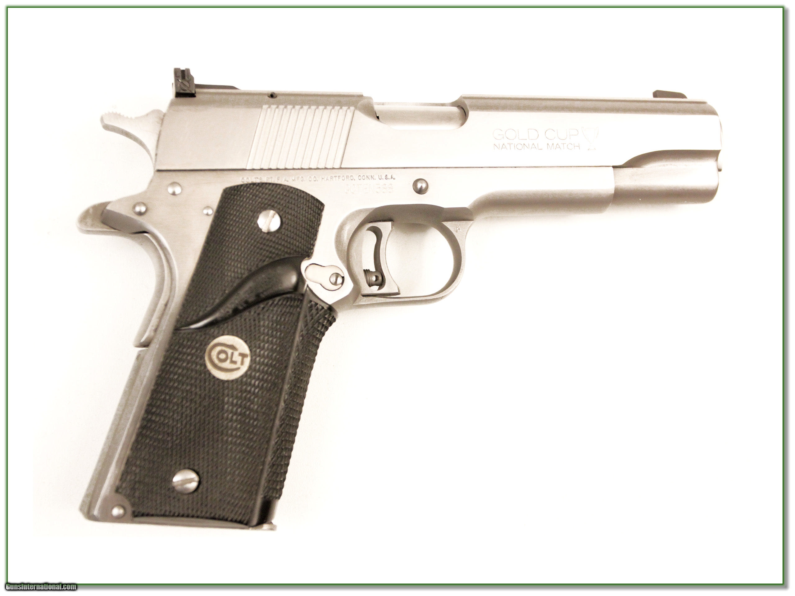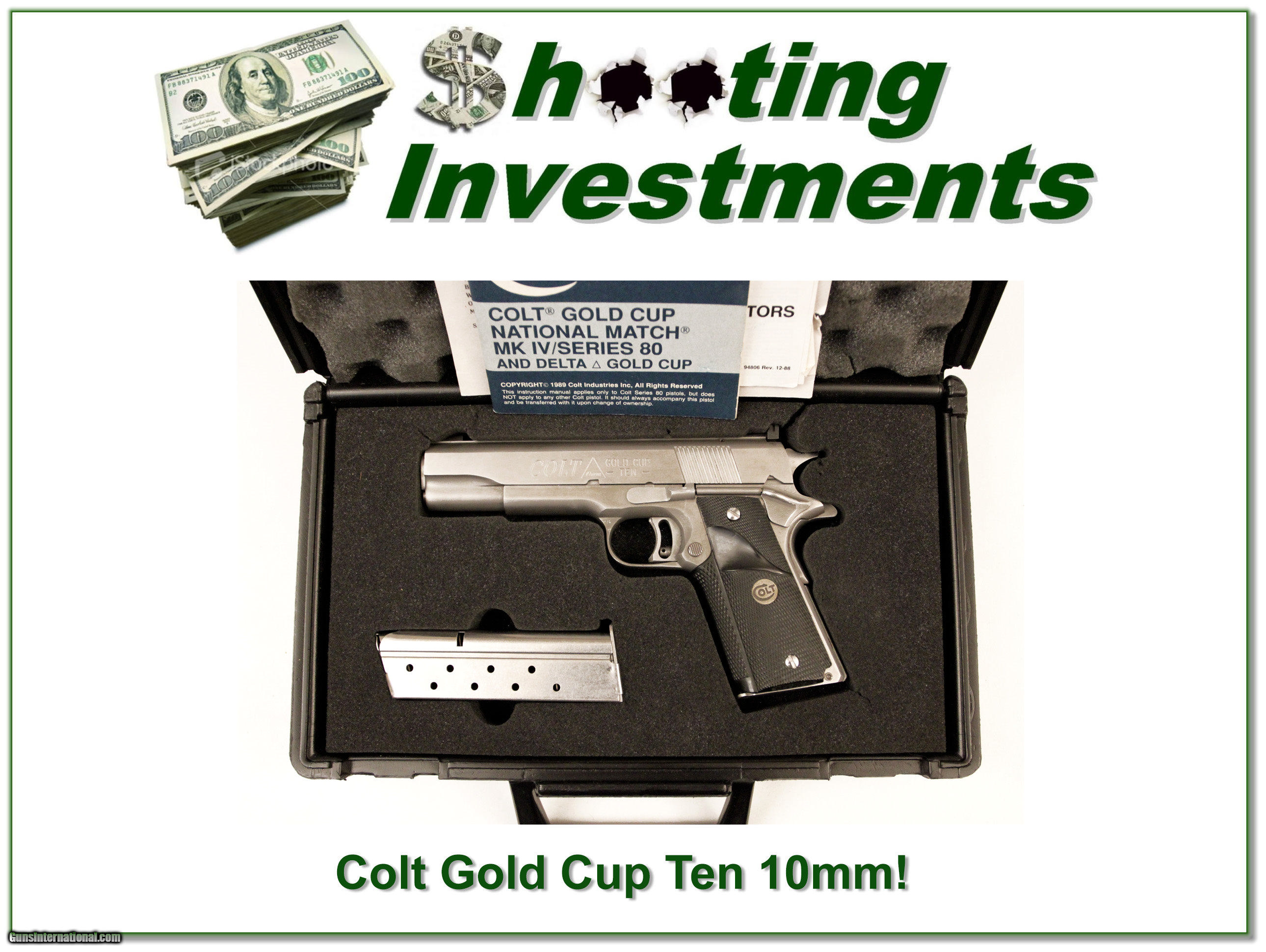 Description: This is a hard to find Colt Gold Cup Ten!. It is a 10mm and comes in original case with all papers. Owner says unfired since leaving the factory. It is very nice. I am selling this one on consignment and as such lay-a-way can’t be used. It does of course have the standard 3 day inspection. It is a Shooting Investment. Shipping and insurance is $55 or $15 more if you want it shipped in a new Plano hard case. Please email me with any questions or larger pictures. (I now consign quality firearms only 10%! Let me know if you have any you would like to sell!) [16-0365] Payment: Payment is by Money Order, Cashiers Check or Personal Check. I can now also accept MasterCard and Visa with a 3% convenience fee. PayPal can be used for some items but never firearms. Please let us know if you would like to pay via PayPal. Shipping: The shipping charge will be listed in each description. It is $35 for most guns. Some heavy guns or those insured for over $2000 will be higher. Shipments to Alaska and Hawaii are higher because air shipment is required. Most firearms are shipped within 5 days of receipt of payment. We prefer shipping at the beginning of the week to avoid firearms in transit over weekends. We package all shipments carefully and insure them for the full purchase price, rounded up to the next $100. In the unlikely event that damage occurs, it is important that you save all packaging material for the claims process. Optics are shipped Priority Mail and most other non-firearm shipments are shipped First Class. Returns: Our return policy is simple. If for any reason you are not pleased with your purchase, you may return your item for a refund. The only exception is ammunition, it cannot be returned. It is important to us that you are happy. Guns cannot be fired or dissembled before returning them and must be returned in the same condition as received. Notification of a return must occur with-in 3 days of receipt at your dealer. Shipping, convenience and dealer fees are not refundable and are the responsibility of the buyer. Lay-a-way: If needed, we offer a 60 day lay-a-way option on most firearms. It is 1/3 now, 1/3 in 30 days and 1/3 in 60 days. Lay-a-way firearm sales are final. Consigning your firearms with Shooting Investments: We will help you get top dollar for your firearms. While most local guns shops charge 20% or more, our fee is only 10% with a minimum of $50. At your local gun shop it might take months to sell. Selling on-line provides instant access to thousands of interested buyers. You won’t find any other on-line dealer willing to sell your firearms for only 10% or listing every gun on 4 separate s. Selling through an House typically costs the seller 15% and the buyer an addition 15% (so 30%) and you have to wait several months to sell and longer to receive funds. If properly priced, we will sell your firearms in a week or two. Send us an email or give us a call and we’ll explain how easy it is for you to get top dollar. Trading: We collect guns and usually just trade for guns we want to add to our collections. We often sell guns for others wanting to purchase one of ours. We find this the most fair to both of us. Our Commission is only 10% and we hold the gun you want until yours sells. Please contact us if you want to sell one of yours to buy one of ours. Help for California Buyers: We are happy to ship to California. It is the buyer’s responsibility to make sure any item you buy is legal in your state. We are also happy to help with your purchase of a firearm from someone other than us. If you see a gun you would like to buy but the seller can’t or won’t ship to California we can help. You buy the gun and have it shipped to us. We’ll then ship it to your California dealer. The cost for this service is only $30 + shipping. Let me know if we can help! SOLD |