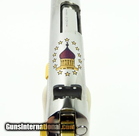 Description: Colt “Gold Stallion” Government .45 ACP caliber pistol. Special Edition with bright stainless finish, gold etched decorations and gold trim. A fancy piece, ready for the barbecue. Excellent condition with box.