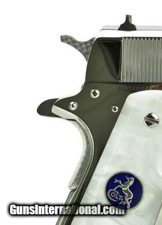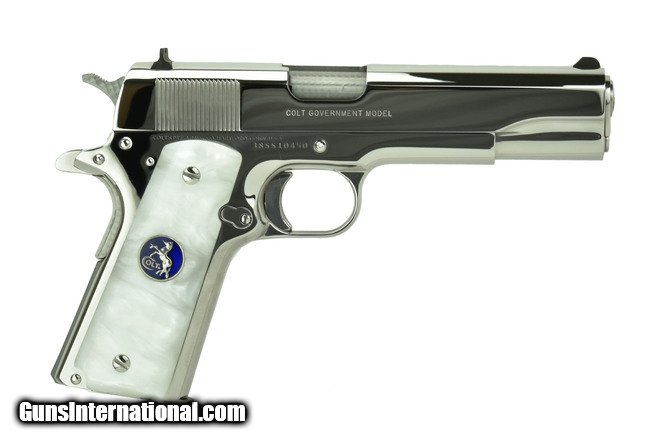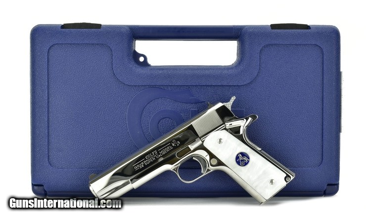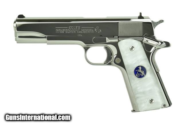 Description: Colt Government .38 Super caliber pistol. Bright stainless finish with jeweled parts and fancy grips. New.