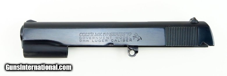 Colt Government .45 ACP caliber pistol. Series 70 model, customized with adjusted target sights. Has an extra Series 70 9mm slide and barrel. The 9mm slide shows some light carry wear, the rest is excellent. Has a total of 3 magazines in each caliber with box.