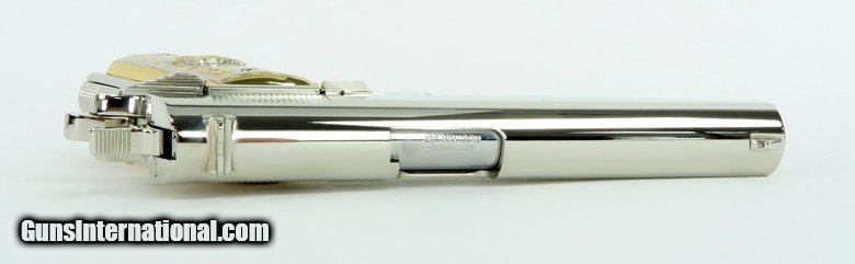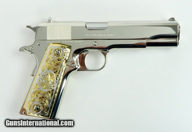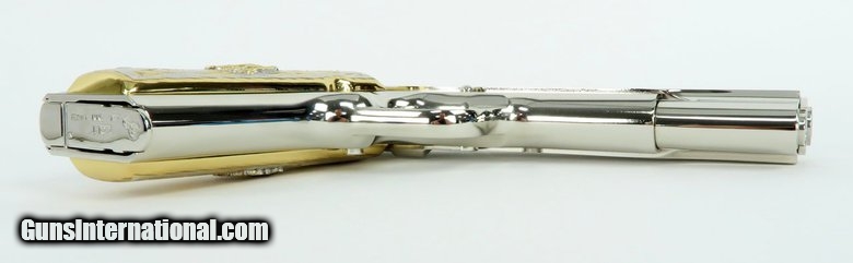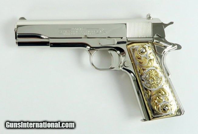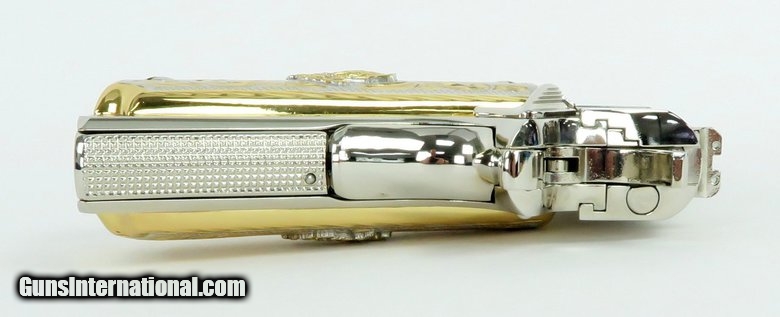 Description: Colt Government 9mm caliber pistol. Customized with bright nickel finish and Mexican style gold and silver plated grips. New