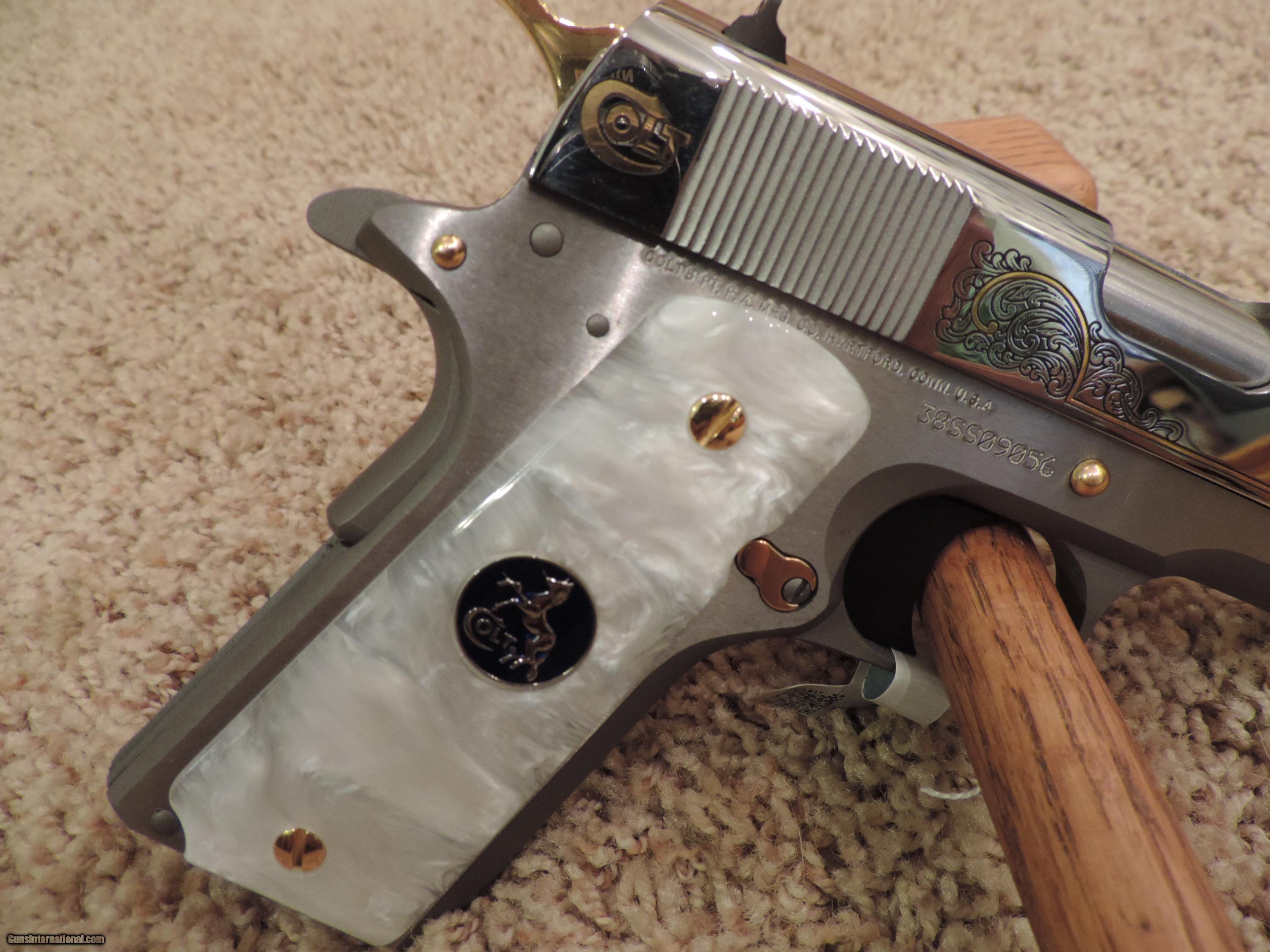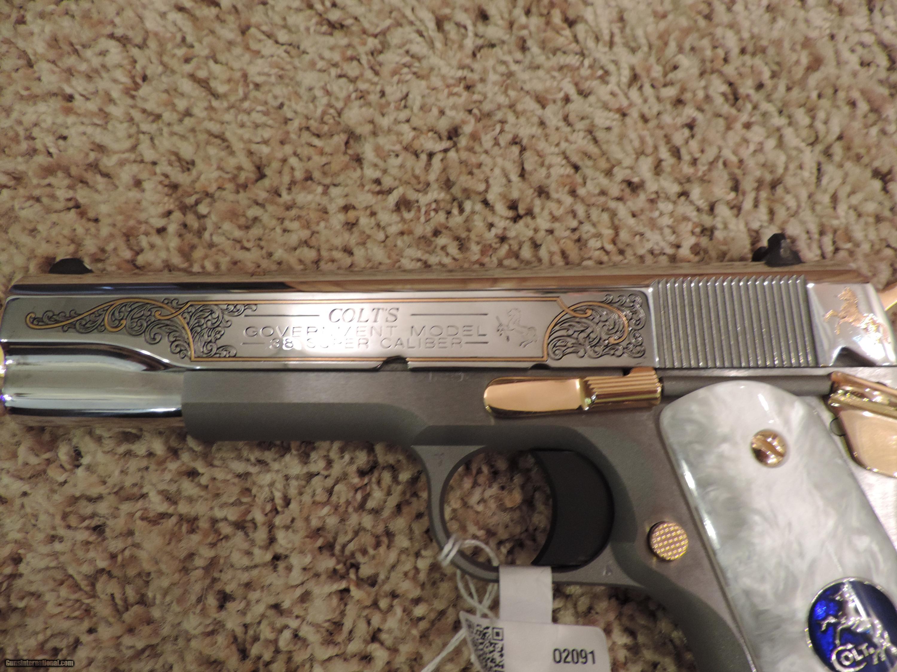 Description: COLT GOVERNMENT 1911 LEW HORTON EXCLUSIVE - LIMITED PRODUCTION 38 SUPER GOLD PREMIER EDITION - HIGH POLISHED STAINLESS STEEL ENGRAVED 5" BARREL WITH GOLD ACCENTS ON SAFETY, HAMMER, MAG RELEASE AND SLIDE RELEASE. COLT GOLD HORSE INSIGNIA ENGRAVED ON TOP OF BARREL. CUSTOM COLT PEARL GRIPS WITH BLUE/SILVER HORSE EMBLEM. GORGEOUS PISTOL! COMES WITH (2) 8 ROUND STAINLESS STEEL MAGS. NEW IN BOX. SUBJECT TO PRIOR STORE SALE. SHIP TO FFL ONLY. BUYER PAYS $60.00 SHIPPING TO LOWER 48 STATES. BUYER PAYS 3% FOR CREDIT CARD. BUYER REPONSIBLE TO DETERMINE IF FIREARM IS LEGAL IN HIS /HER STATE. ARIZONA RESIDENTS PAY 6.712% SALES TAX. SOLD Manufacturer: COLT Model: CLT02091GCP1 Serial Number: 38SS09056 Caliber Info: 38Super Condition: New in Box |