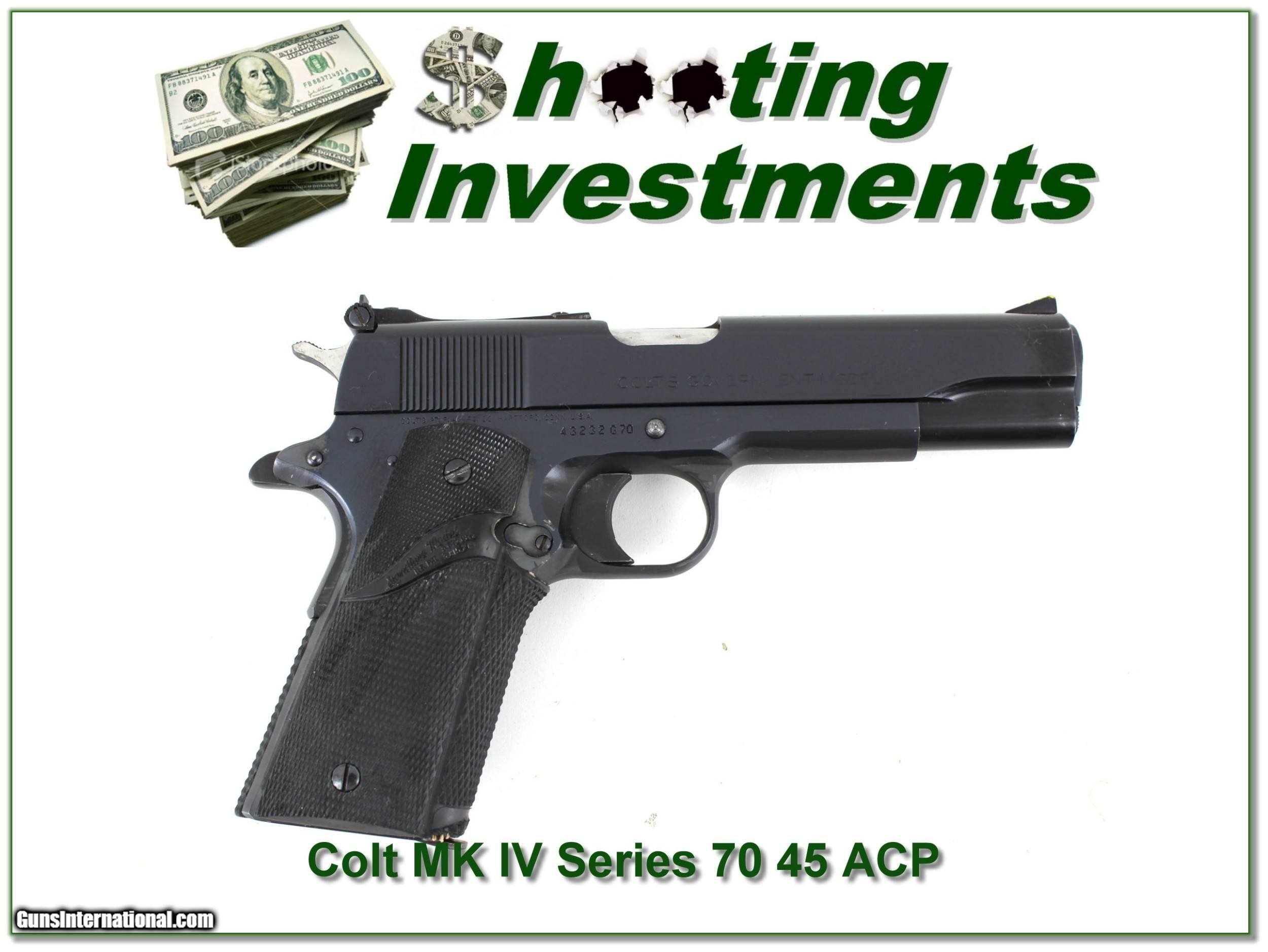 Description: This is a very nice Colt MK IV Series 70 Government 1911 in 45 ACP. It has some light use as seen and comes with 1 magazine. I am selling this one on consignment and as such lay-a-way can’t be used. It does of course have the standard 3-day inspection. Shipping with insurance is $39. Please email me with any questions or larger pictures. (Consign your quality firearms with Shooting Investments for only 12%! Let me know if you have any you would like to sell!) 20-0427 Payment: Payment is by Money Order, Cashiers Check or Personal Check. I can now also accept MasterCard and Visa with a 3% convenience fee. PayPal can be used for some items but never firearms. Please let us know if you would like to pay via PayPal. Shipping: The shipping charge will be listed in each description. It is $39 for most guns. Some heavy guns or those insured for over $2000 will be higher. Shipments to Alaska and Hawaii are higher because air shipment is required. Most firearms are shipped on Tuesday and Thursday and usually in 5 days of receipt of payment. We package all shipments carefully and insure them. Returns: Our return policy is simple. If for any reason you are not pleased with your purchase, you may return your item for a full refund of purchase price. Ammunition cannot be returned. It is important to us that you are happy. Guns cannot be fired or dissembled before returning them and they must be returned in the same condition as received. Notification of a return must occur with-in 3 days of receipt at your dealer. Shipping, convenience and dealer fees are not refundable and are the responsibility of the buyer. Lay-a-way: If needed, we offer a 60 day lay-a-way option on most firearms. It is 1/3 now, 1/3 in 30 days and 1/3 in 60 days. Lay-a-way firearm sales are final and if not completed the first payment cannot be returned. Consigning your firearms with Shooting Investments: We will help you get top dollar for your firearms. While most local guns shops charge 20% or more, our fee is only 12% with a minimum of $75. At your local gun shop it might take months to sell. Selling on-line provides instant access to thousands of interested buyers. You won’t find any other on-line dealer willing to sell your firearms for only 12% or listing every gun on 3 separate s. Selling through an House typically costs the seller 15% and the buyer an addition 15% (so 30%) and you have to wait several months to sell and longer to receive funds. If properly priced, we will sell your firearms in a few weeks. Send us an email or give us a call and we’ll explain how easy it is for you to get top dollar. Trading: Trading for use is really just buying your gun to re-sell. If you have a gun you want to trade, please email a picture and we will let you know what we can give or it. You will always get more if we sell it for you on consignment. Help for California Buyers: We are happy to ship to California. It is the buyer’s responsibility to make sure any item you buy is legal in your state. We are also happy to help with your purchase of a firearm from someone other than us. If you see a gun you would like to buy but the seller can’t or won’t ship to California they can ship to use and we’ll then ship it to your California dealer. The cost for this service is only $30 + shipping. Let us know if we can help! SOLD |