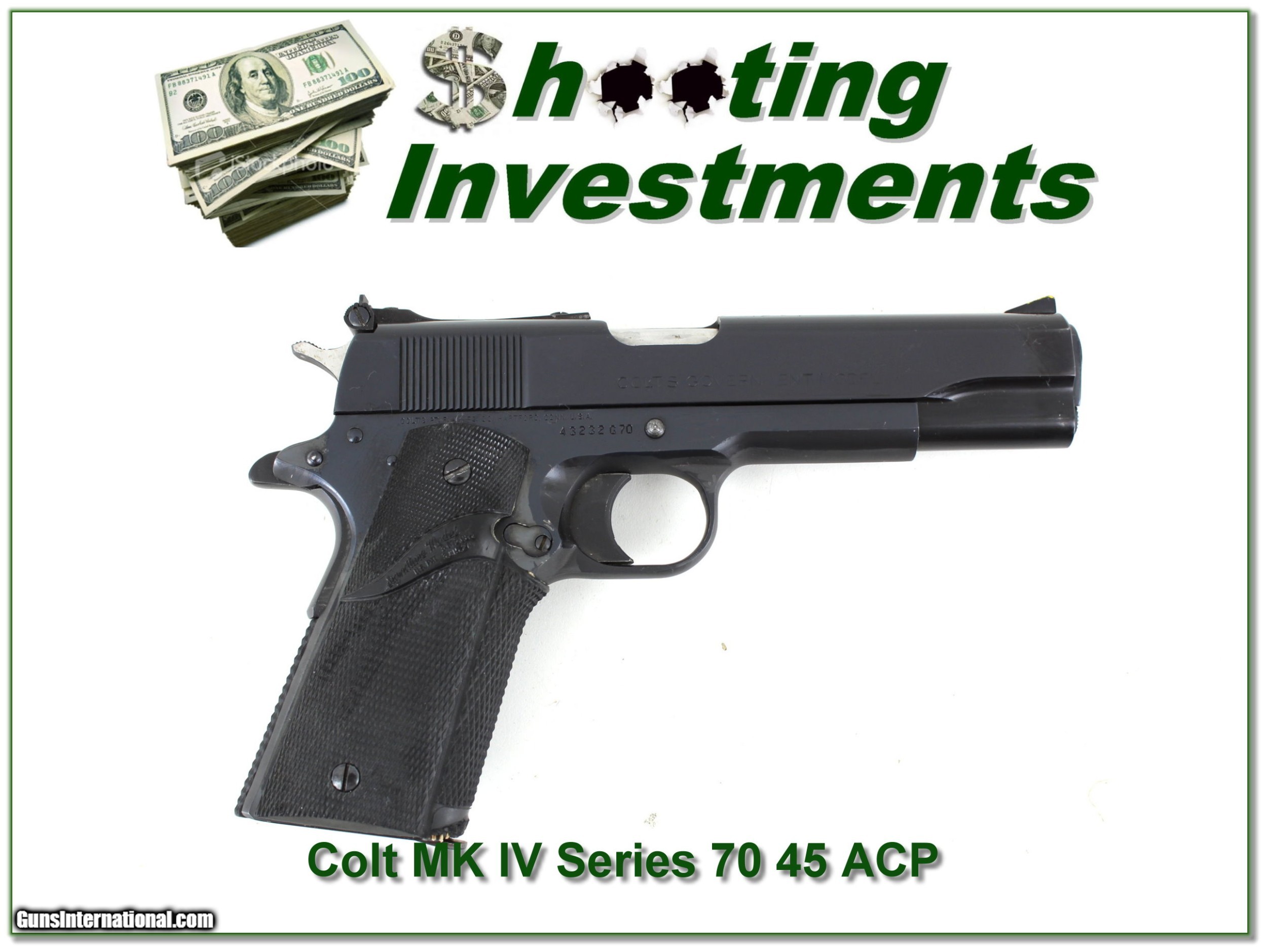 Description: This is a very nice Colt MK IV Series 70 Government 1911 in 45 ACP. It has some light use as seen and comes with 1 magazine. I am selling this one on consignment and as such lay-a-way can’t be used. It does of course have the standard 3-day inspection. Shipping with insurance is $39. Please email me with any questions or larger pictures. (Consign your quality firearms with Shooting Investments for only 12%! Let me know if you have any you would like to sell!) 20-0427 Payment: Payment is by Money Order, Cashiers Check or Personal Check. I can now also accept Credit Cards (MasterCard, Visa, Discover & American Express) with a 3% convenience fee. Shipping: The shipping charge will be listed in each description. It is $39 for most firearms. Some heavy guns or those insured for over $2000 will be higher. Shipments to Alaska and Hawaii are higher because air shipment is required. Most firearms are shipped on Tuesday and Thursday and usually in 5 days of receipt of payment. We package all shipments carefully and insure them. Optics are shipped Priority Mail and most other non-firearm shipments are shipped First Class. Returns: Our return policy is simple. If for any reason you are not pleased with your purchase, you may return your item for a full refund of purchase price. Ammunition cannot be returned. It is important to us that you are happy. Guns cannot be fired or dissembled before returning them and they must be returned in the same condition as received. Notification of a return must occur with-in 3 days of receipt at your dealer. Shipping, convenience and dealer fees are not refundable and are the responsibility of the buyer. Lay-a-way: If needed, we offer a 60 day lay-a-way option on most firearms. It is 1/3 now, 1/3 in 30 days and 1/3 in 60 days. Lay-a-way firearm sales are final and if not completed the first payment cannot be returned. Consigning your firearms with Shooting Investments: We will help you get top dollar for your firearms. While most local guns shops charge 20% or more, our fee is only 12% with a minimum of $75. At your local gun shop it might take months to sell. Selling on-line provides instant access to thousands of interested buyers. You won’t find any other on-line dealer willing to sell your firearms for only 12% or listing every gun on 3 separate s. Selling through an House typically costs the seller 15% and the buyer an addition 15% (so 30%) and you have to wait several months to sell and longer to receive funds. If properly priced, we will sell your firearms in a few weeks. Send us an email or give us a call and we’ll explain how easy it is for you to get top dollar. Trading: Trading for use is really just buying your gun to re-sell. If you have a gun you want to trade, please email a picture and we will let you know what we can give or it. You will always get more if we sell it for you on consignment. Help for California Buyers: We are happy to ship to California. It is the buyer’s responsibility to make sure any item you buy is legal in your state. We are also happy to help with your purchase of a firearm from someone other than us. If you see a gun you would like to buy but the seller can’t or won’t ship to California they can ship to use and we’ll then ship it to your California dealer. The cost for this service is only $30 + shipping. Let us know if we can help! Payment: Payment is by Money Order, Cashiers Check or Personal Check. I can now also accept Credit Cards (MasterCard, Visa, Discover & American Express) with a 3% convenience fee. Shipping: The shipping charge will be listed in each description. It is $39 for most firearms. Some heavy guns or those insured for over $2000 will be higher. Shipments to Alaska and Hawaii are higher because air shipment is required. Most firearms are shipped on Tuesday and Thursday and usually in 5 days of receipt of payment. We package all shipments carefully and insure them. Optics are shipped Priority Mail and most other non-firearm shipments are shipped First Class. Returns: Our return policy is simple. If for any reason you are not pleased with your purchase, you may return your item for a full refund of purchase price. Ammunition cannot be returned. It is important to us that you are happy. Guns cannot be fired or dissembled before returning them and they must be returned in the same condition as received. Notification of a return must occur with-in 3 days of receipt at your dealer. Shipping, convenience and dealer fees are not refundable and are the responsibility of the buyer. Lay-a-way: If needed, we offer a 60 day lay-a-way option on most firearms. It is 1/3 now, 1/3 in 30 days and 1/3 in 60 days. Lay-a-way firearm sales are final and if not completed the first payment cannot be returned. Consigning your firearms with Shooting Investments: We will help you get top dollar for your firearms. While most local guns shops charge 20% or more, our fee is only 12% with a minimum of $75. At your local gun shop it might take months to sell. Selling on-line provides instant access to thousands of interested buyers. You won’t find any other on-line dealer willing to sell your firearms for only 12% or listing every gun on 3 separate s. Selling through an House typically costs the seller 15% and the buyer an addition 15% (so 30%) and you have to wait several months to sell and longer to receive funds. If properly priced, we will sell your firearms in a few weeks. Send us an email or give us a call and we’ll explain how easy it is for you to get top dollar. Trading: Trading for use is really just buying your gun to re-sell. If you have a gun you want to trade, please email a picture and we will let you know what we can give or it. You will always get more if we sell it for you on consignment. Help for California Buyers: We are happy to ship to California. It is the buyer’s responsibility to make sure any item you buy is legal in your state. We are also happy to help with your purchase of a fi
