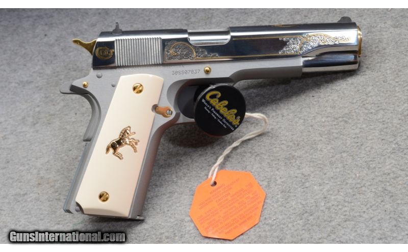 Description: Brushed stainless frame, accented with a bright stanless slide. Enhanced by nice engraving and gold-plated features. SOLD Caliber Info: .36 Super Chambers: 8 + 1 capacity Metal Condition: Excellent, Could pass for new... doesn't appear ro have been fired. Wood Condition: Excellent, Could pass for new... Bore Condition: Bright and shiny Barrels: 5 inch brushed stainless Triggers: Gold Stock: Smooth synthetic ivory Weight: 2 lb. - 7 oz. Sights: 3 dot sight system Extras: Blue plastic case, two mags (total), factory papers Item Location: Rogers,, MN |