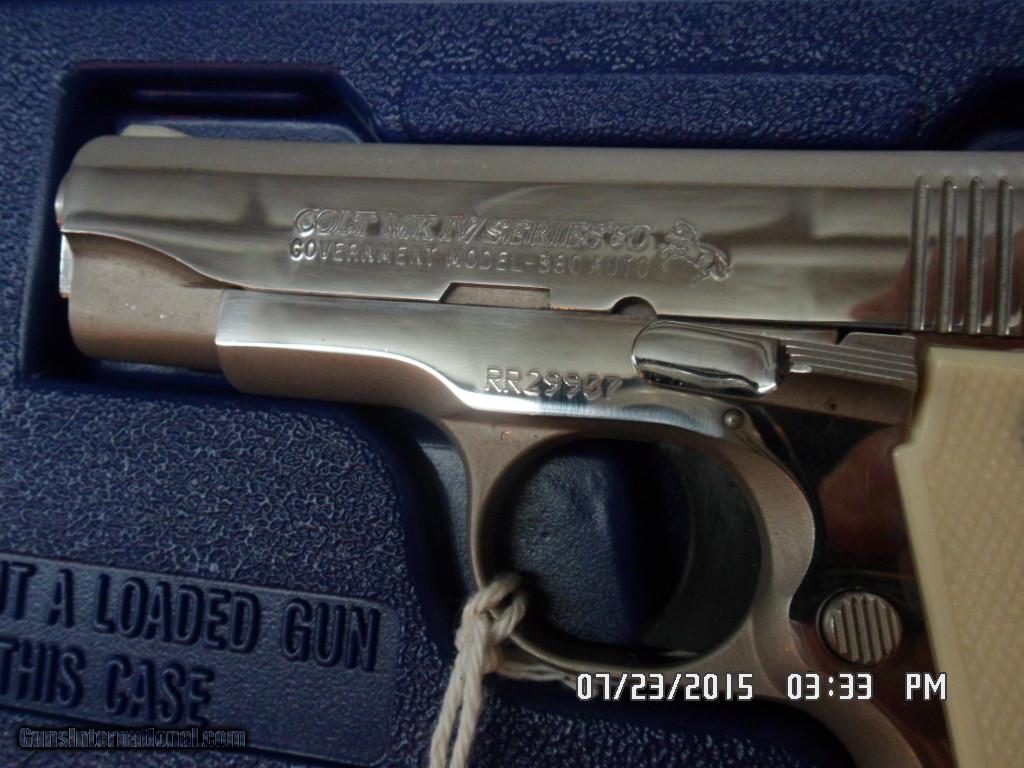 Description: COLT GOVERNMENT MODEL MK IV / SERIES 80 380 ACP,BRIGHT NICKEL NEW IN ORIGINAL BOX WITH ALL PAPERWORK AND HANG TAG. 3 1/4" BARREL WITH FIXED SIGHTS.WHITE COMPOSIT CHECKERED STOCKS.SINGLE ACTION SEMI-AUTO PISTOL.100% FACTORY BRIGHT NICKEL FINISH.EXTREMELY HSARD TO FIND,DISC,1994. ALL NEW IN ORIGINAL BOX AND UNFIRED.S/N RR299XX. 2195.00 PLUS 40.00 SHIPPING.CALL DANNY AT 828=698=8804 IF NEEDED.ALL CHECKS TAKE 10 DAYS TO CLEAR BANKS,M/O'S TAKE 5 DAYS TO CLEAR.CAN NOT TAKE CREDIT CARDS. GOD BLESS! SOLD |