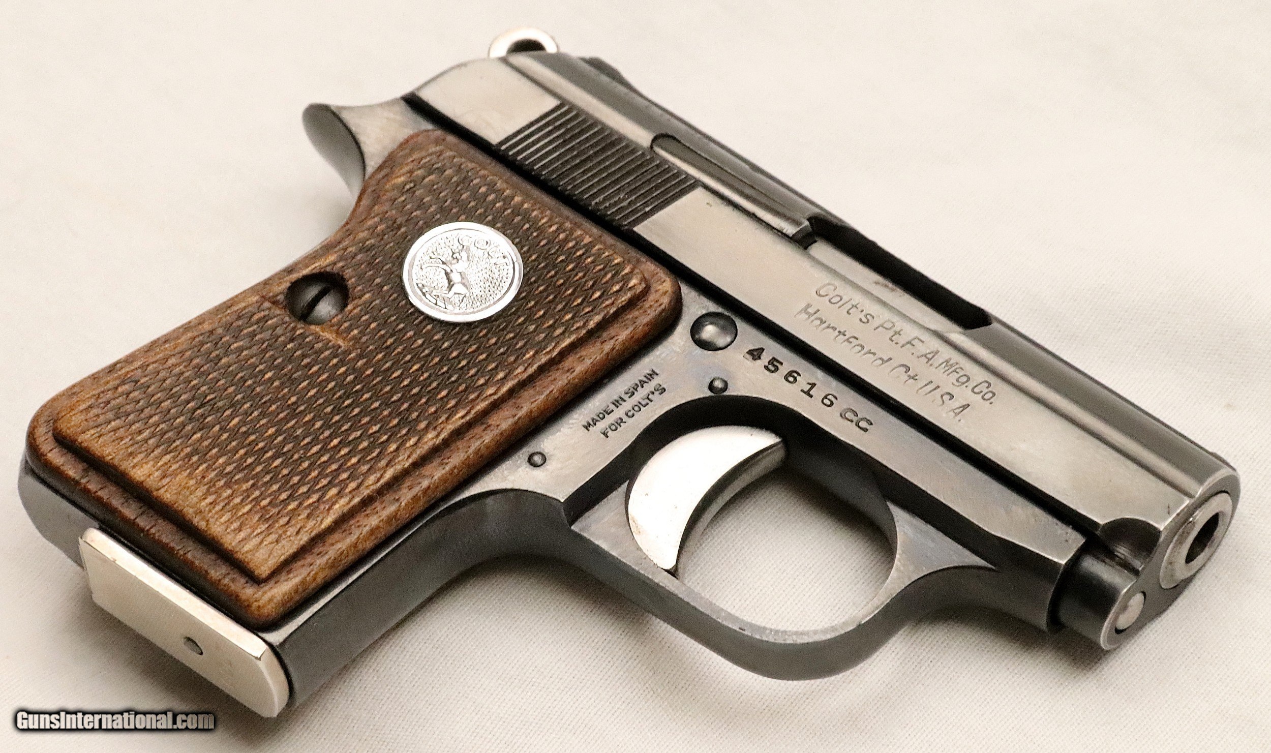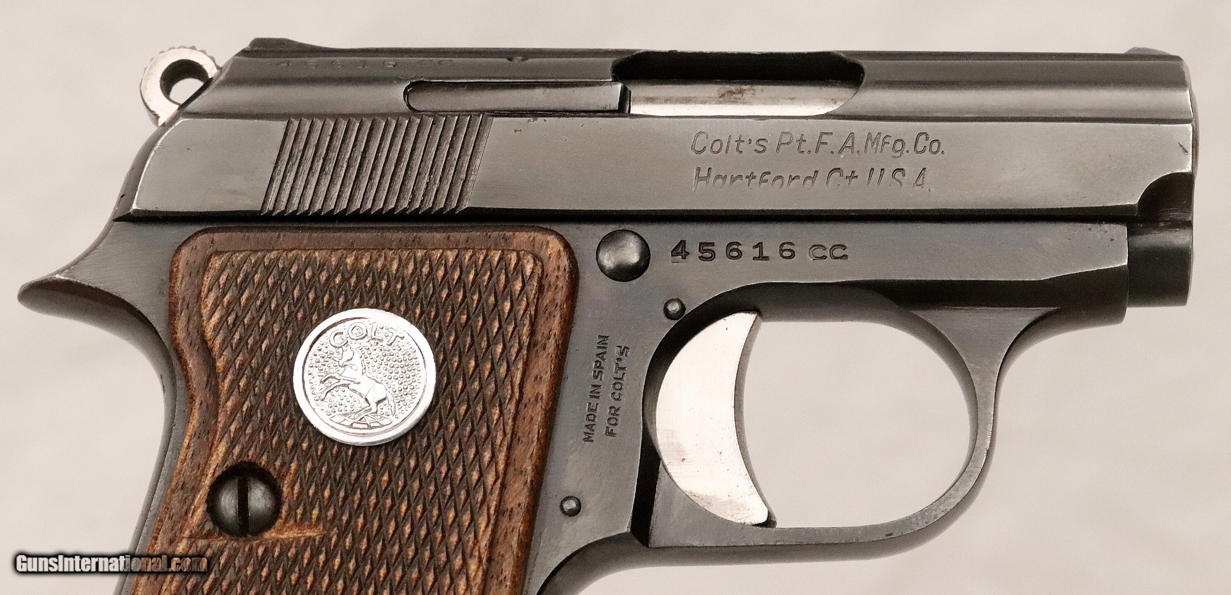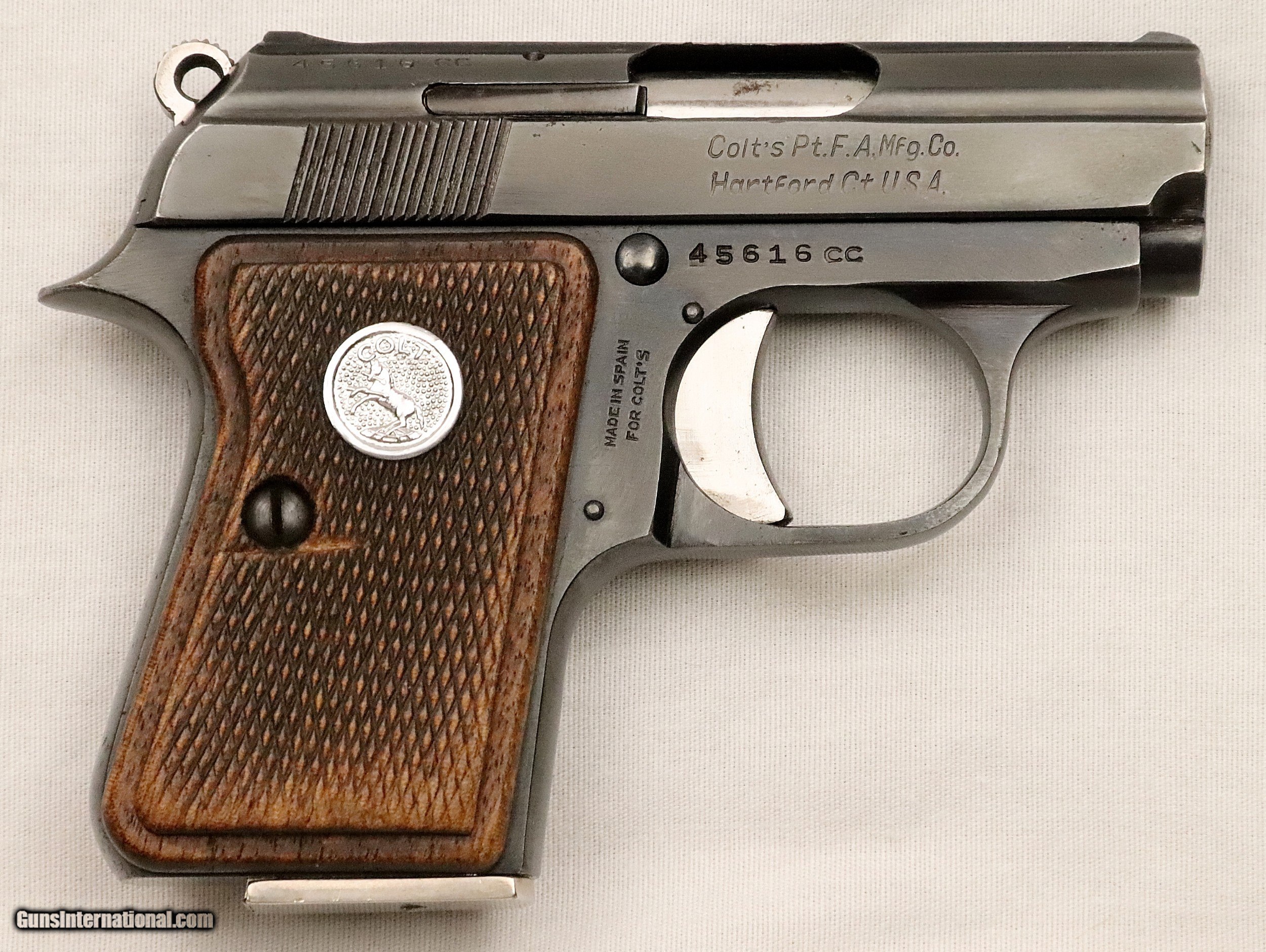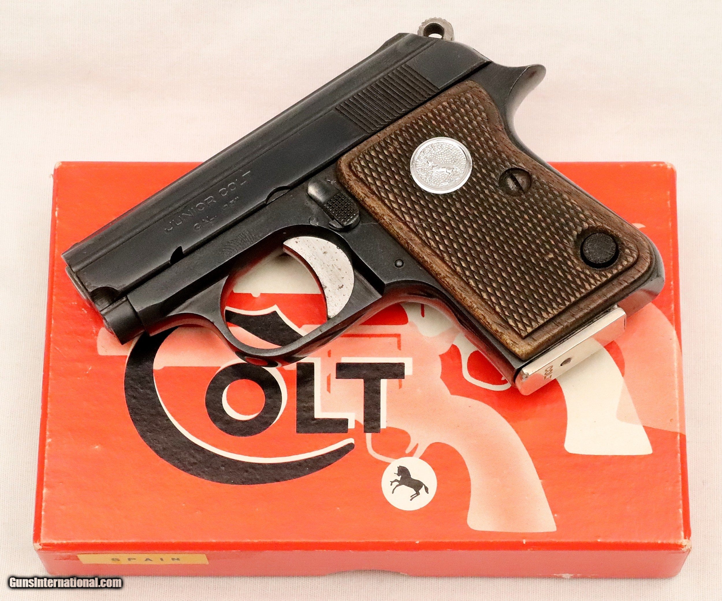 Description: SOLD..............................................This Colt Junior was manufactured in Spain under contract from Colt’s. It was manufactured in 1963 (59 Years Ago) and remains in excellent condition. It is fully functional and has an Exc. bore. (Perhaps Unfired) It has survived with its original box & sleeve, 2 Mags. and Cleaning Rod. This is an interesting variation for a Colt Collection. .25 ACP Caliber with a 2 ½” barrel. Serial number 45616 cc. FFL or C&R required. Beaver Creek Arms TERMS & CONDITIONS Objective: As a collector of 35 years and Licensed Firearms Dealer since 1989 I have a clear definition of a satisfactory transaction. I will be paid as we agreed to, and you will be satisfied with your purchase. My goal is to establish a client list of satisfied repeat customers who will recommend me to other collectors. It’s just that simple. Exiled Saudi princes with secret funds needing change from an over paid purchase need not apply. Notice: ALL Federal, State, & Local firearms laws will be followed. I will take NO shortcuts in the process of a legal sale or transfer, so please don’t ask. SHIPPING: Normally shipments are made via U.S.P.S. Priority Mail, Insured, with Signature required. Typical Packing, Shipping and Insurance cost for a handgun is $30.00. Checks to be made out to: Steve Clark Mailed to: 380 Beaver Creek Rd. Dillsburg PA 17019 FIREARMS: Modern firearms, post 1898, can only be shipped to a Type 01 Federal Firearms License address. Curio-Relic firearms, as defined by the BATF list, can usually be shipped to a Type 03 Collectors License address. Some states have additional restrictions such as CA, CT, DC, IL, NJ and NY. A signed valid FFL license copy either mailed or emailed will be required for shipment to only the license address. Antique firearms, pre 1898 do not require a Federal License. For purchase, a copy of a Government Issued Identification (Drivers License, Etc), showing date of birth and current address will be required. GUARANTEE: Your complete satisfaction is assured, see objective above. If you are not satisfied, please contact me within 3 days of receipt. Please don’t fire the weapon, safety, function and accuracy are NOT Guaranteed. Any weapon offered by Beaver Creek Arms is never test fired nor is there any representation the gun is functional and safe to fire. These guns are sold for collectors and only represented as used firearms that must be checked by a competent person, observe all the necessary safety precautions prior to attempting to load and fire one of these weapons RETURNS: Returns must be made within 3 days of receipt. They must be received in exactly the same condition with no parts exchanged. If it has been altered, damaged, or fired, a refund will not be made. Packing, shipping and insurance cost will not be refunded. All layaway purchases are returnable for merchandise credit only. PAYMENT: Bank check, Personal check, and Money Orders are preferred. Visa and MasterCard are accepted with a 3% processing fee. For Visa and MasterCard orders please provide the account number, code number, expiration date, name on card, phone number and card billing address. This information can be phoned in, or E-Mailed. All orders must be paid in advance, C.O.D. orders are not accepted. Checks, both Bank and Personal must clear before the order will be shipped, usually a 2 week delay. SALES TAX: Pennsylvania state sales tax is 6% for in state purchases. The payment of other states sales tax, if applicable, for shipped items is the buyers responsibility. DISCREET: Client information will remain Confidential. Your privacy is protected. . SOLD Curio/Relic: Yes |
