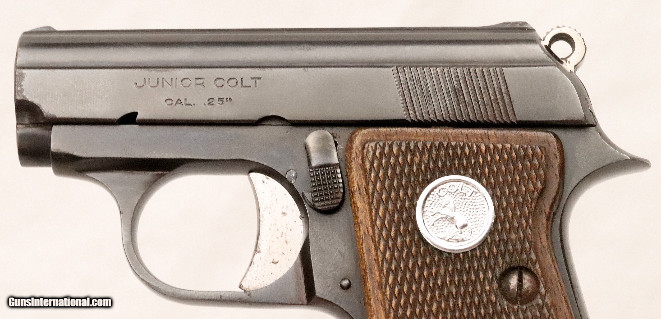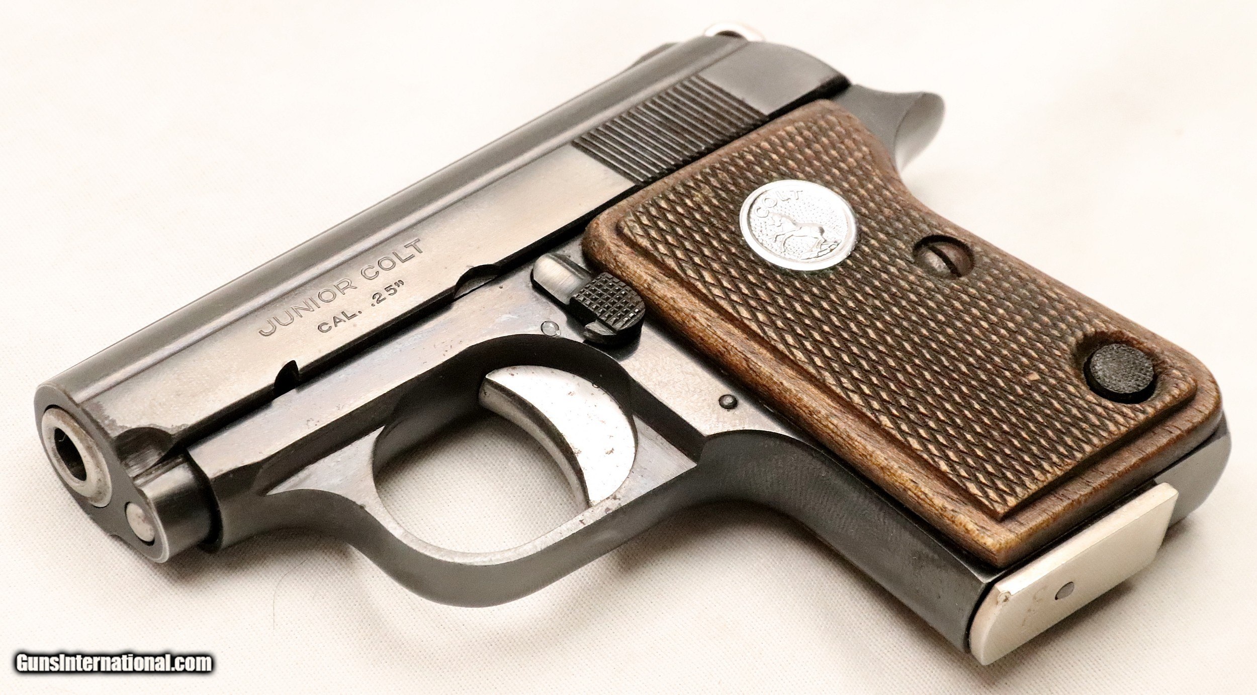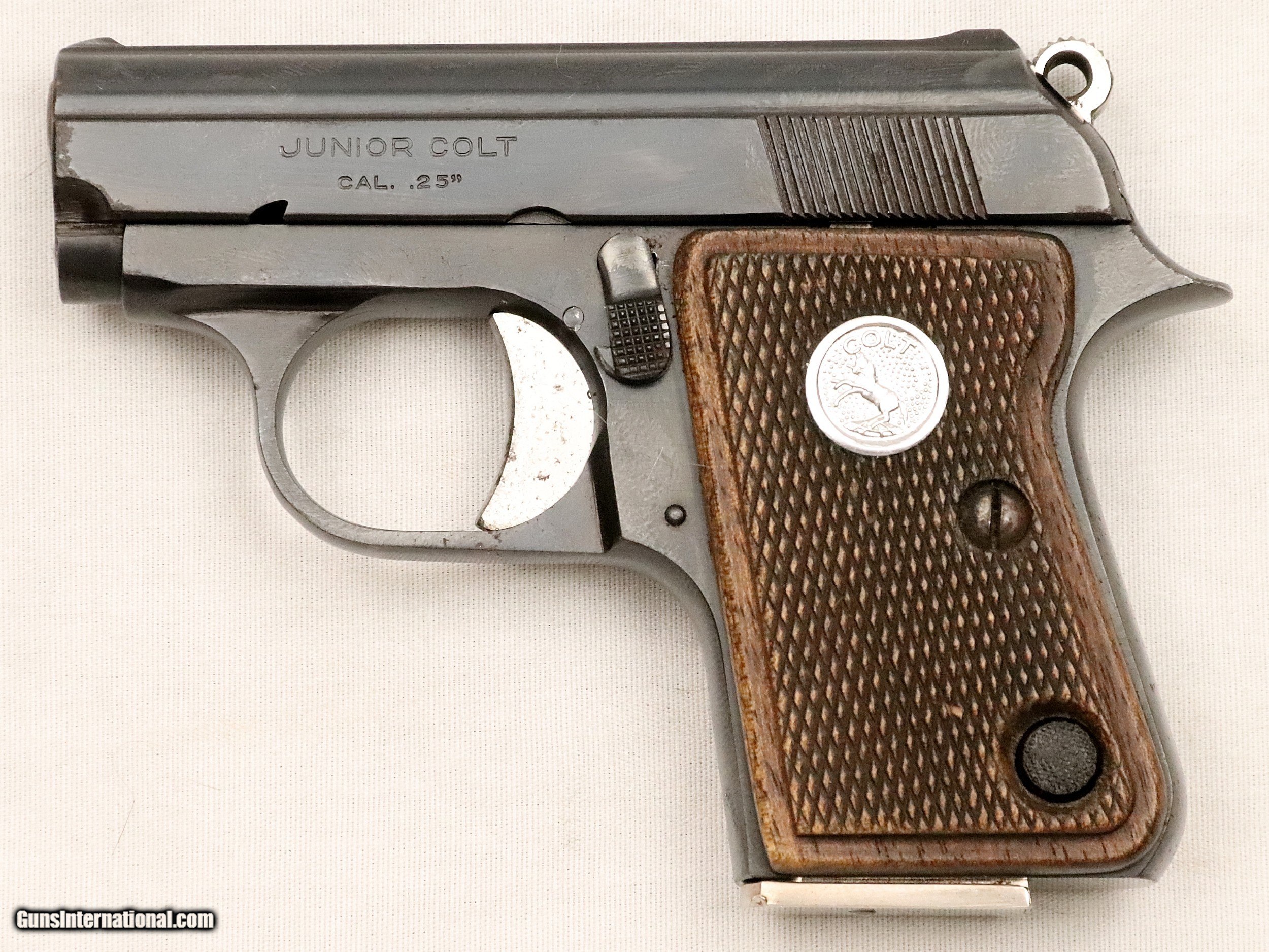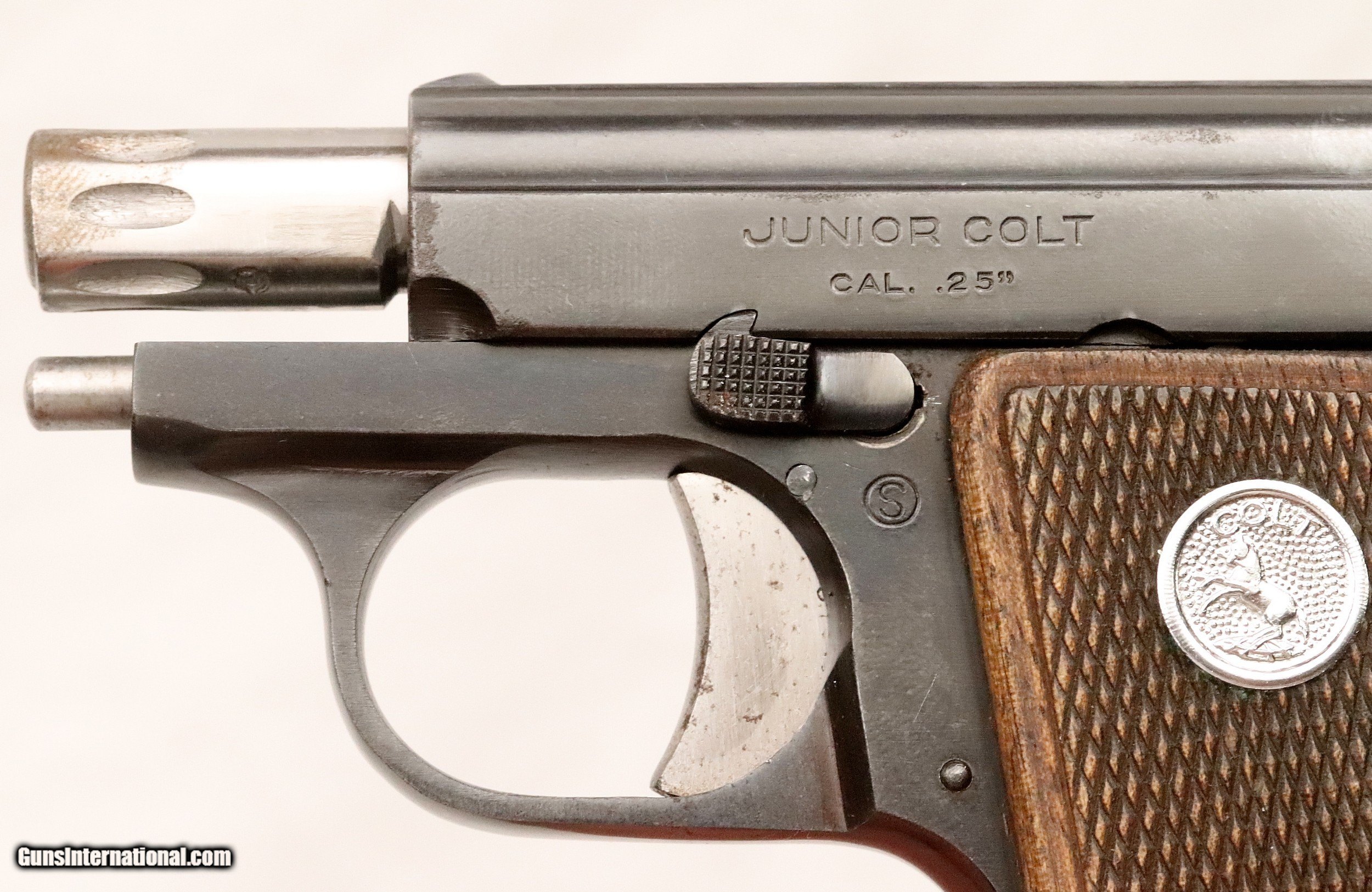 Description: SOLD..............................................This Colt Junior was manufactured in Spain under contract from Colt’s. It was manufactured in 1963 (59 Years Ago) and remains in excellent condition. It is fully functional and has an Exc. bore. (Perhaps Unfired) It has survived with its original box & sleeve, 2 Mags. and Cleaning Rod. This is an interesting variation for a Colt Collection. .25 ACP Caliber with a 2 ½” barrel. Serial number 45616 cc. FFL or C&R required. Beaver Creek Arms TERMS & CONDITIONS Objective: As a collector of 35 years and Licensed Firearms Dealer since 1989 I have a clear definition of a satisfactory transaction. I will be paid as we agreed to, and you will be satisfied with your purchase. My goal is to establish a client list of satisfied repeat customers who will recommend me to other collectors. It’s just that simple. Exiled Saudi princes with secret funds needing change from an over paid purchase need not apply. Notice: ALL Federal, State, & Local firearms laws will be followed. I will take NO shortcuts in the process of a legal sale or transfer, so please don’t ask. SHIPPING: Normally shipments are made via U.S.P.S. Priority Mail, Insured, with Signature required. Typical Packing, Shipping and Insurance cost for a handgun is $30.00. Checks to be made out to: Steve Clark Mailed to: 380 Beaver Creek Rd. Dillsburg PA 17019 FIREARMS: Modern firearms, post 1898, can only be shipped to a Type 01 Federal Firearms License address. Curio-Relic firearms, as defined by the BATF list, can usually be shipped to a Type 03 Collectors License address. Some states have additional restrictions such as CA, CT, DC, IL, NJ and NY. A signed valid FFL license copy either mailed or emailed will be required for shipment to only the license address. Antique firearms, pre 1898 do not require a Federal License. For purchase, a copy of a Government Issued Identification (Drivers License, Etc), showing date of birth and current address will be required. GUARANTEE: Your complete satisfaction is assured, see objective above. If you are not satisfied, please contact me within 3 days of receipt. Please don’t fire the weapon, safety, function and accuracy are NOT Guaranteed. Any weapon offered by Beaver Creek Arms is never test fired nor is there any representation the gun is functional and safe to fire. These guns are sold for collectors and only represented as used firearms that must be checked by a competent person, observe all the necessary safety precautions prior to attempting to load and fire one of these weapons RETURNS: Returns must be made within 3 days of receipt. They must be received in exactly the same condition with no parts exchanged. If it has been altered, damaged, or fired, a refund will not be made. Packing, shipping and insurance cost will not be refunded. All layaway purchases are returnable for merchandise credit only. PAYMENT: Bank check, Personal check, and Money Orders are preferred. Visa and MasterCard are accepted with a 3% processing fee. For Visa and MasterCard orders please provide the account number, code number, expiration date, name on card, phone number and card billing address. This information can be phoned in, or E-Mailed. All orders must be paid in advance, C.O.D. orders are not accepted. Checks, both Bank and Personal must clear before the order will be shipped, usually a 2 week delay. SALES TAX: Pennsylvania state sales tax is 6% for in state purchases. The payment of other states sales tax, if applicable, for shipped items is the buyers responsibility. DISCREET: Client information will remain Confidential. Your privacy is protected. . SOLD Curio/Relic: Yes |