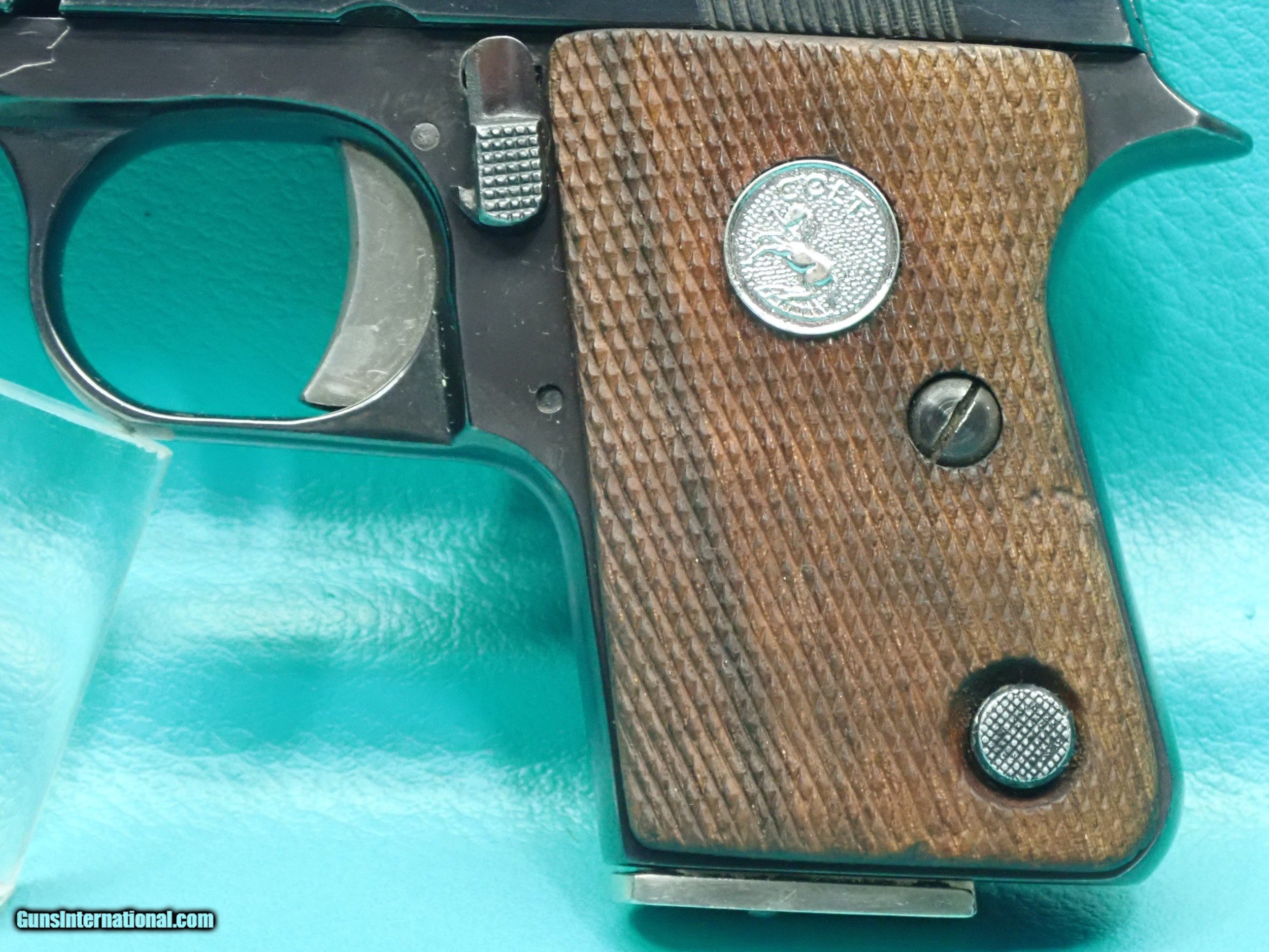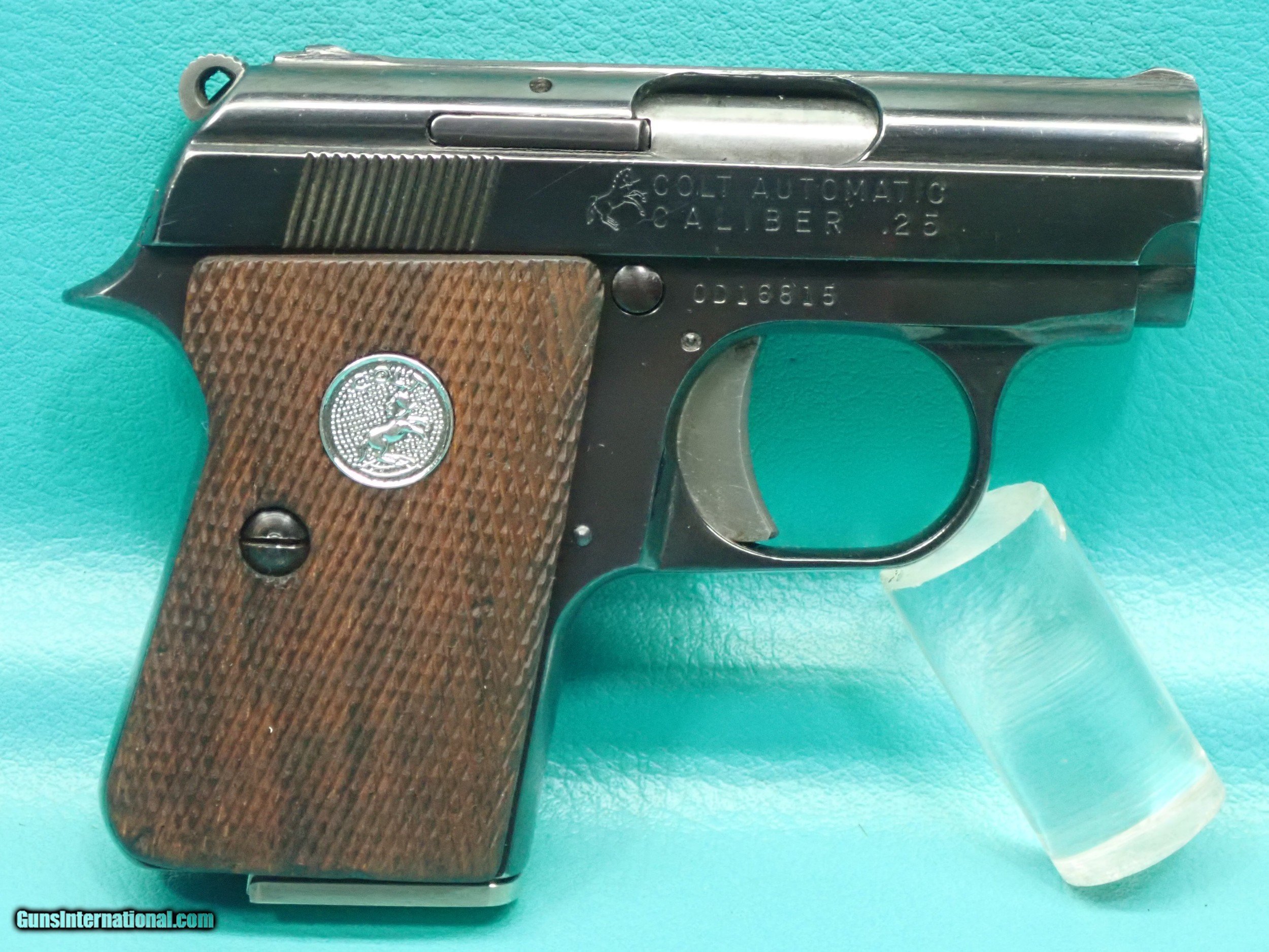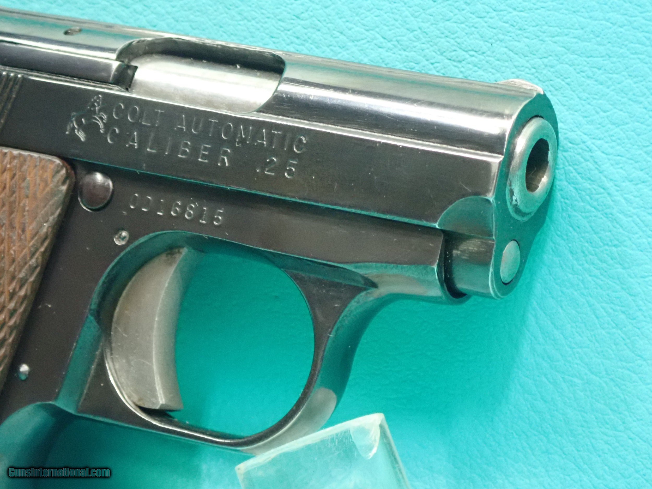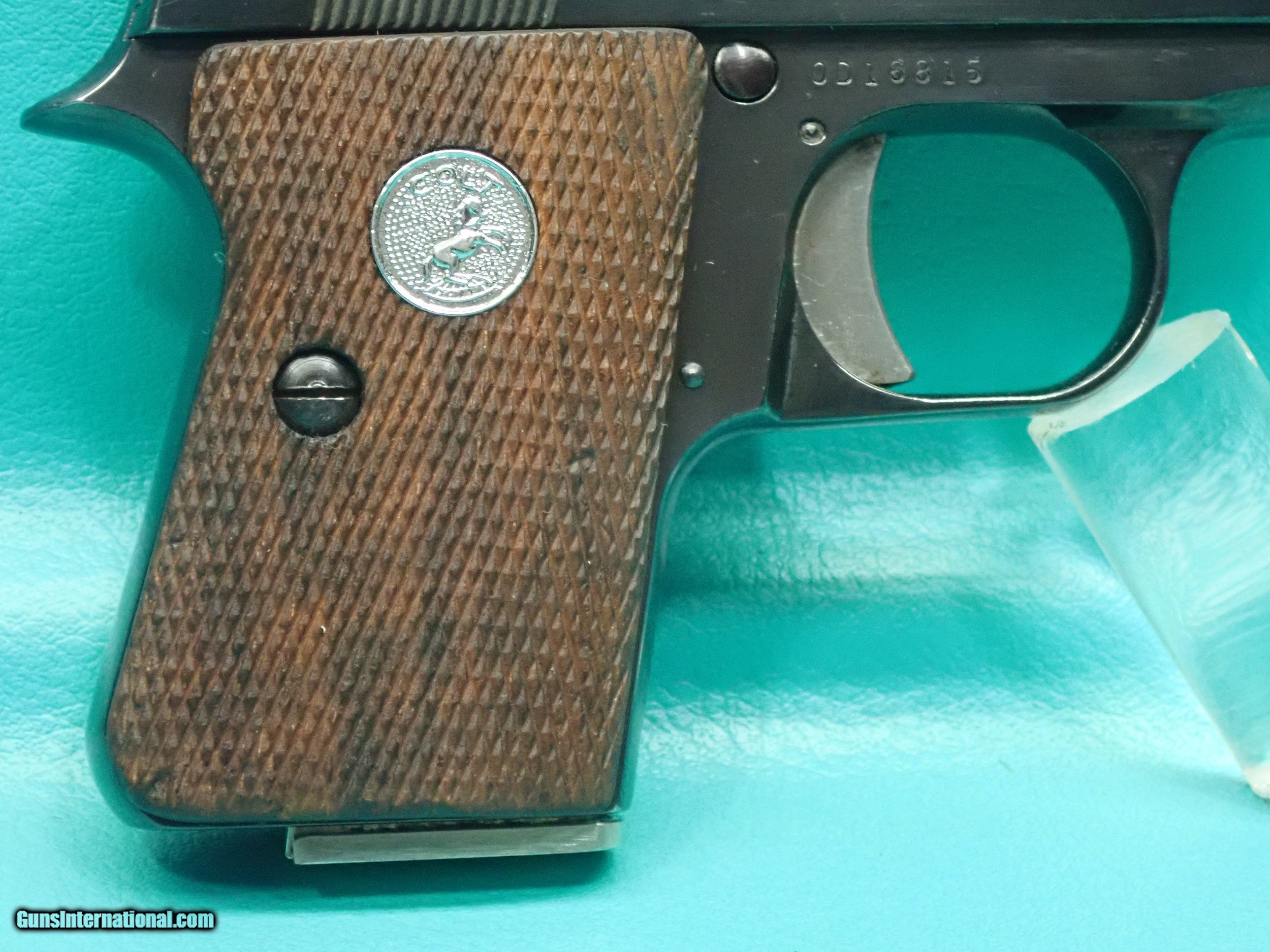 Description: ***SOLD*** Colt Junior "Automatic Caliber 25" .25acp 2 1/4" barrel blued semi auto pistol made in 1971. The pistol is made by Firearms International for Colt and features single action firing, checkered Walnut grips with silver medallion, exposed hammer, compact pocket size, One 7 round magazine, and bright blued finish. The finish is in great shape with only sign of very light use. The action is smooth with stong ejection. The stocks are solid with no cracks. The barrel has sharp rifling with a shiny bore. Great for any Colt collector! Please refer to the photos for the overall condition. Shipping is $25.00. No handguns sales in MA. FFL is required. SOLD Curio/Relic: Yes Handgun Caliber: .25 ACP (6.35mm Browning, 6.35×16mmSR) Manufacturer: Colt Model: Junior Serial Number: OD16815 |