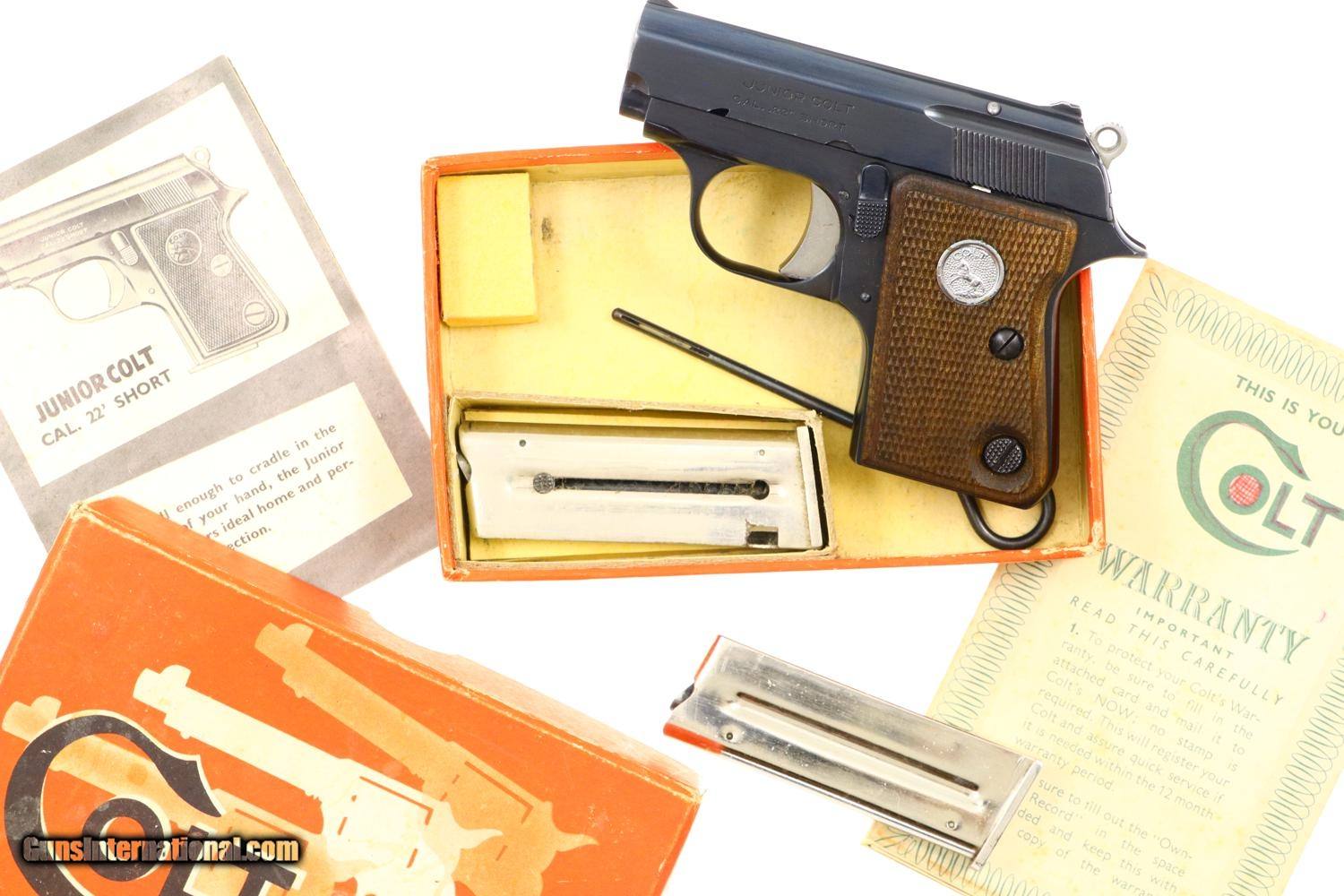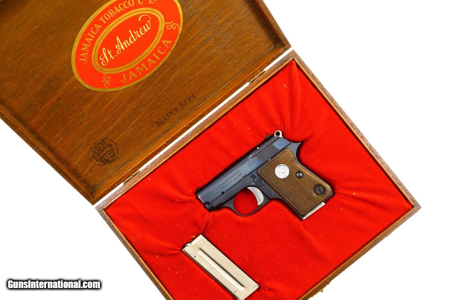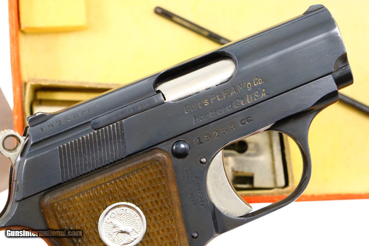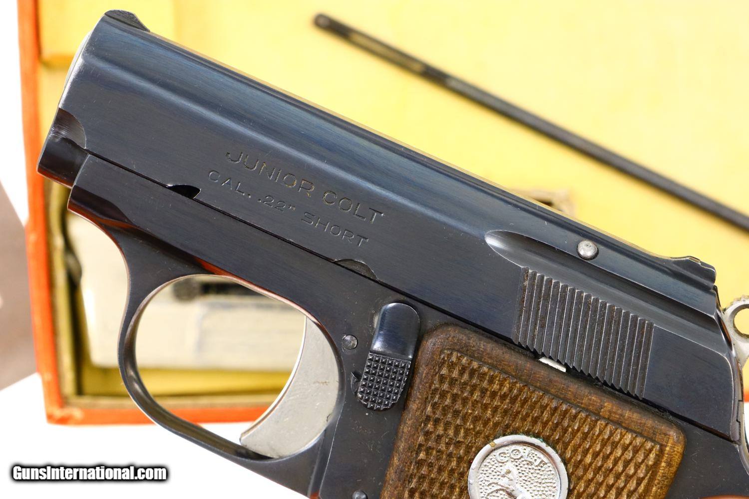 Description: Synopsis: Near new Colt, Junior Colt, boxed with accessories, 19258cc, FB01105 Description: Beautiful, nearly new junior Colt in .22 short, made by Astra for Colt, prior to 1968, this example falling in the first lot of 1100 .22 short pistols, serial range 14001cc-25000cc completed between 1959 – 1965. Total production in .22 short was 24000, 775 pistols. This early example has the Junior Colt and caliber marking on the side: Colt address on the right side of the slide; serial number and reference “MADE IN SPAIN FOR COLT’S” on the right side of the frame. Walnut checkered grips with chromed Colt medallions Complete with spare magazine, cleaning rod, instruction booklet, warranty card in original factory matching shipping box and customized cigar/presentation box. Condition: 99+% original salt blue with just the most minimal sharp edge wear. Grips slightly oil darkened. Comparable condition spare magazine and in tact box with usual exterior scuffing. A beautiful ensemble that would enhance any Colt collection. ~~Insured shipping fee of $55; most packages shipped using FedEx 2nd Day.~~ SOLD Manufacturer: Colt Serial Number: 19258cc Caliber Info: 0.22 short |