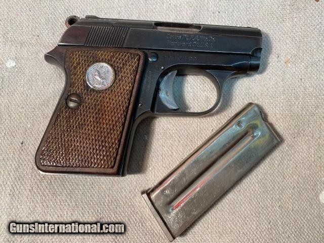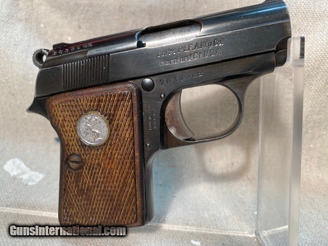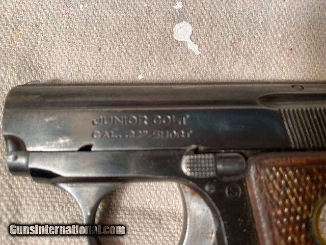 Description: SOLD *********************Colt Junior Colt Pocket Model .22 short caliber. 21/4 inch barrel, exposed, rounded spur hammer, 6 round magazine, checkered walnut grips, no slide stop, no grip safety, manual thumb safety on the left side is also slide lock used for disassembly, push button magazine release button on left grip panel at bottom, very low recoil, includes magazine disconnect safety feature (magazine must be inserted in the gun in order to pull the trigger). Includes a beavertail on the top of the grip to protect the firing hand from "slide bite". Sometimes referred to as a "mouse gun". This is a single action only gun. The hammer must be pulled back for the first shot. Simple "blowback" action. Designed for concealed carry. Produced between 1958 and 1968. The 1968 Gun Control Act stopped guns of this size from being imported, so production in Spain was stopped at that time. Originally produced only in .25 ACP caliber. In 1959, the .22 short caliber was added. Approximately 40,000 were made. This gun was made in 1962. Serial number = 20,386CC. Serial number on the top of the slide matches the serial number on the frame. The "CC" suffix to the serial number indicates the gun was made in Spain by the Astra Unceta Cia Company under license from Colt. This is the same gun as the Astra Model 2,000 Cub with plastic grips that was sold in Europe. One original Colt magazine included. Shipping to your FFL or C&R license only. Inspection must be done on the premises of the receiving FFL or C&R license only. Do not remove firearm from receiving FFL before inspection is completed and firearm is accepted. We provide a 3 day window to complete reasonable inspection. Inspection starts on date of delivery to receiving FFL. Do not disassemble. If you are unsatisfied, do not complete transfer. Promptly return item using original packaging. We do not refund shipping cost from the seller to the buyer. We also do not reimburse return shipping cost. Add shipping cost of $35. SOLD Curio/Relic: Yes Handgun Caliber: .22 Short |