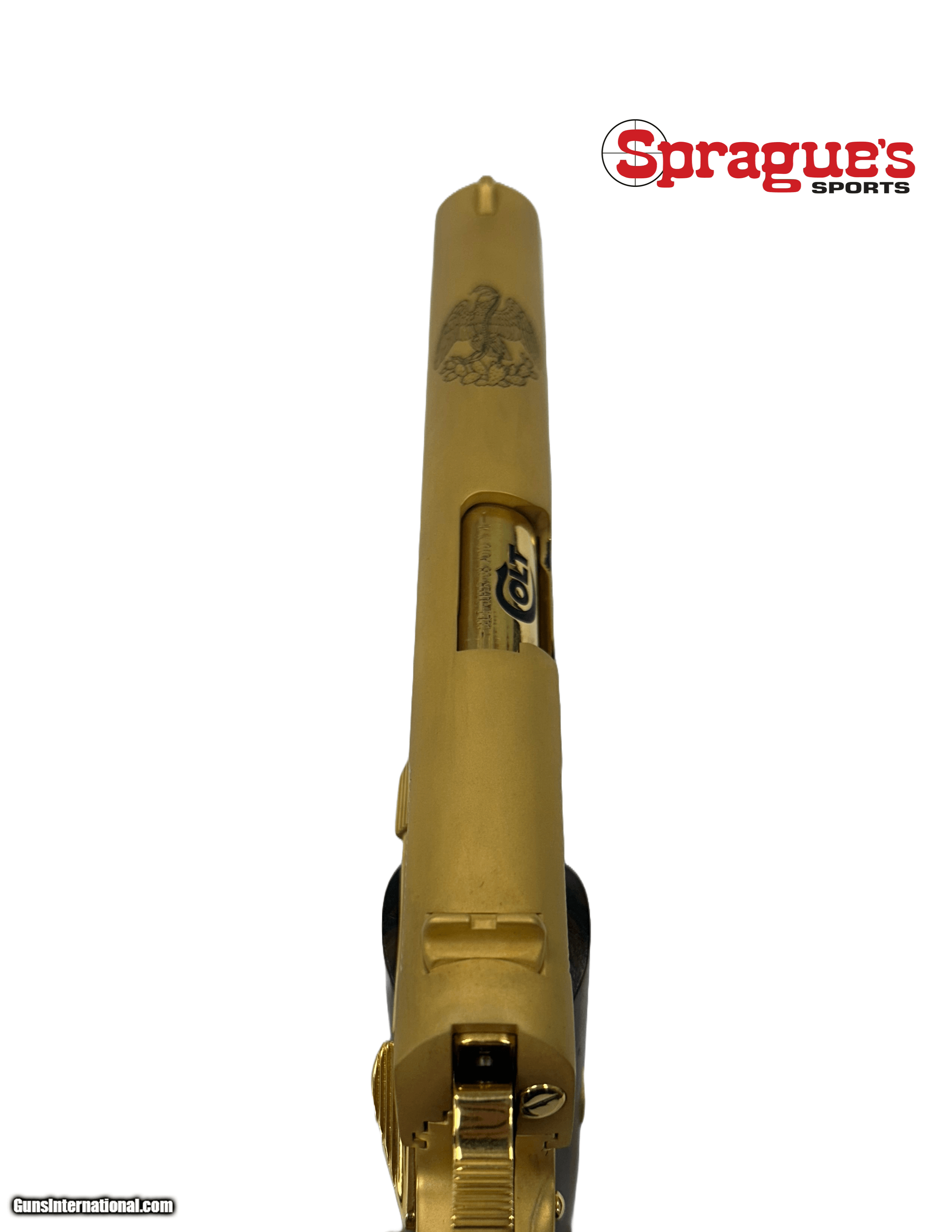 Description: Colt "La Patria" custom one of a kind fully engraved 1911 in .38 Super in gold Description Fully engraved custom Colt 1911. Finished in frosted and bright polished gold. The deep scroll engraving is blacked in the reliefs to highlight the artistry. An on each side, an eagle is cut out from the slide. The Mexican Coat of Arms (Escudo Nacional de México) is engraved on the top of the slide. Walnut stocks, with Gold Colt emplems compliment the Black and Gold colors. Chambered in .38 Super this unique pistol is sure to add to your collection. Manufacturer: Colt Model: 1911 Calibre .38 Super Barrel:5" Condition:New Add 3% for Credit Card Shipping $45.00 in the 48 contiguous United States Shipping Insurance will be added at actual cost SOLD Handgun Caliber: .38 Super Auto |