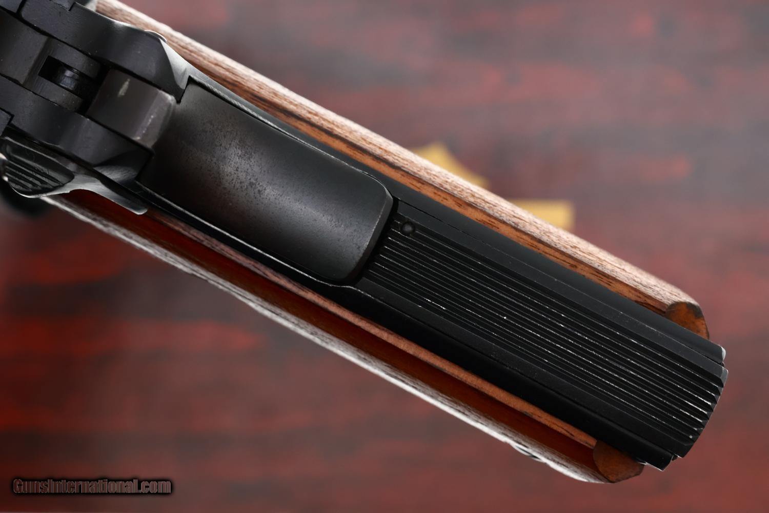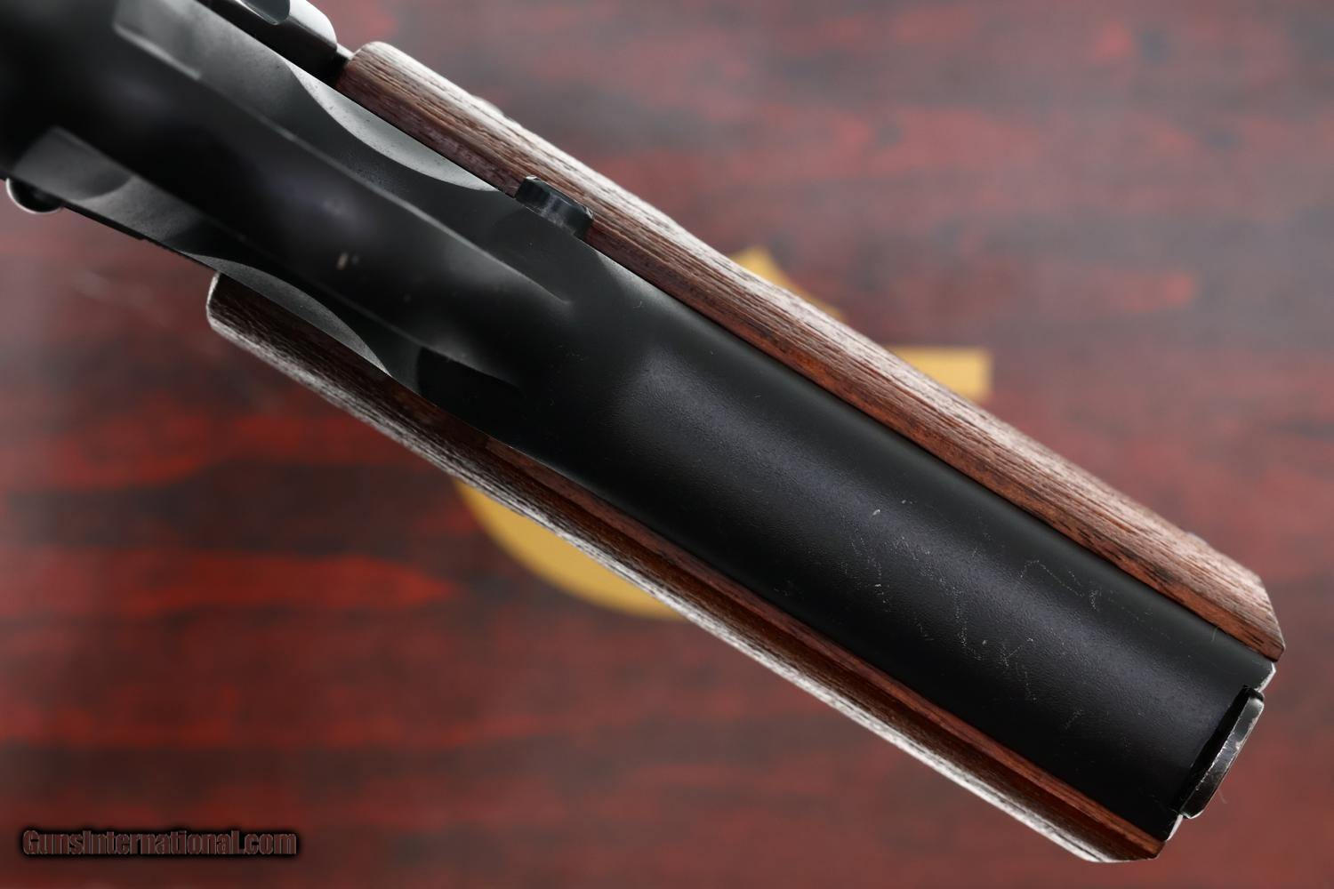 Bright 98-99% original blue/black anodized finish with wear largely limited to operational scuffing on the nose of the slide and a few very light scuffs on the front / backstrap. Light staining on either side of the brightly polished hammer. Comparable condition grips and magazine that shows insertional wear. Mirror bore. Correct manual mechanics. EXC box, styrofoam inserts, and associated literature.