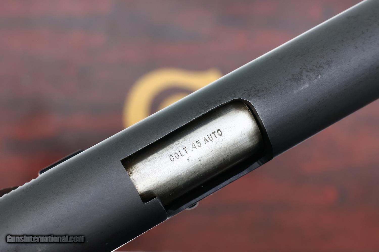 Description: Synopsis: Attractive and desirable Colt Lightweight Commander .45, made 1976, with a fixed front sight, drift adjustable rear sight, and smooth walnut grips, representing Colt's post-WWII innovation aimed at providing a lighter alternative to the M1911. Description: High original condition Colt Commander Lightweight pistol cal. .45ACP, manufactured in 1976, SN: CLW024458, with fixed front sight and drift adjustable rear sight. Left side of slide marked "COMMANDER" MODEL" with "COLT AUTOMATIC CALIBER .45" followed by the rampant Colt logo. The right side of slide is stamped "COLTS PT. F. A MFG CO. HARTFORD CONN. U. S. A" with serial number "CLW024458" on the frame below the slide. Fitted with smooth walnut grips secured with Colt medallions on each panel, secured with standard slotted screws. Blued magazine with 5 cartridge indicator holes on side marked "COLT .45 AUTO." on fixed floorplate. Complete with matching box, likely a reproduction, with appropriate reprinted literature to include hanging tag. A classic pistol representing Colt's post-war effort to find a lighter replacement for the M1911 pistol. Condition: Bright 98-99% original blue/black anodized finish with wear largely limited to operational scuffing on the nose of the slide and a few very light scuffs on the front / backstrap. Light staining on either side of the brightly polished hammer. Comparable condition grips and magazine that shows insertional wear. Mirror bore. Correct manual mechanics. EXC box, styrofoam inserts, and associated literature. Manufacturer: Colt Model: Commander Serial Number: CLW024458 Caliber Info: 32-20 Condition: EXC Price: $1,695.00 Contact Seller |