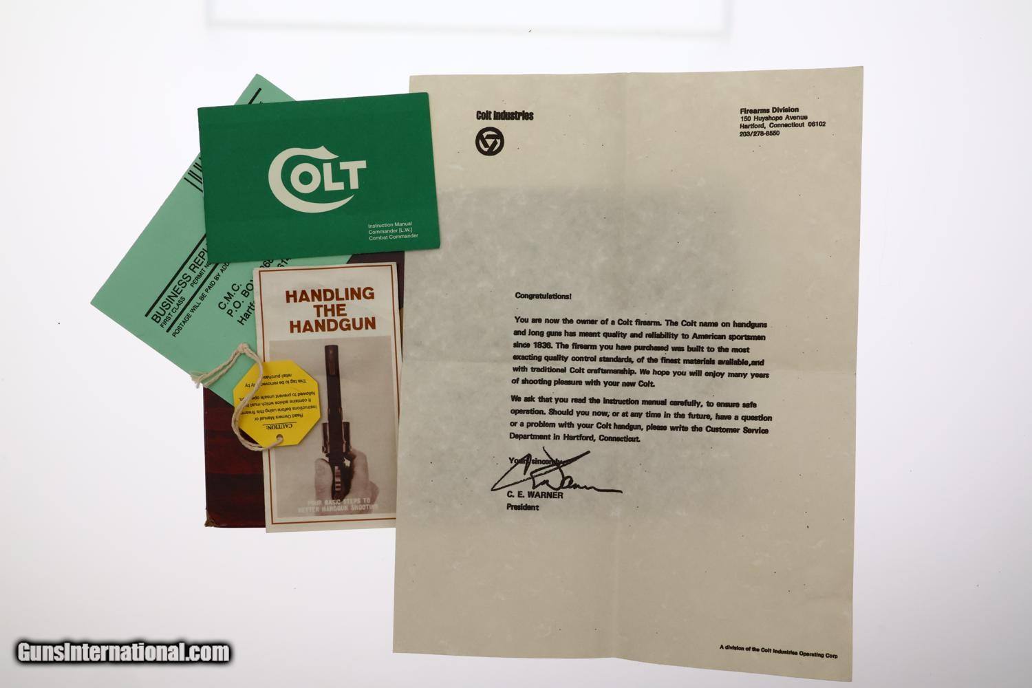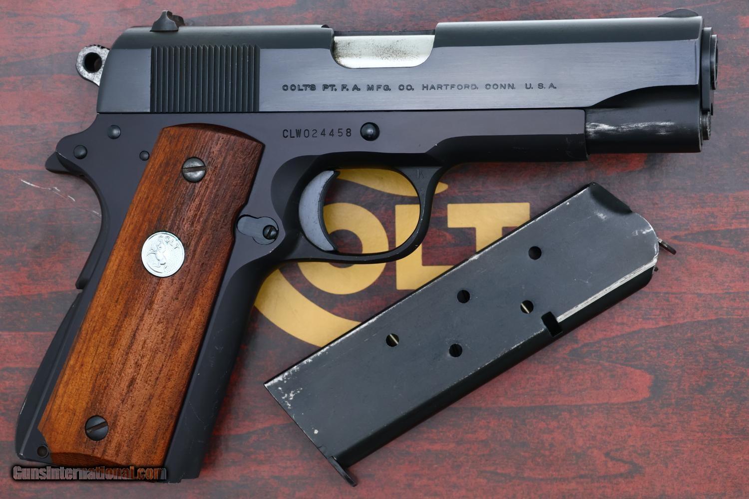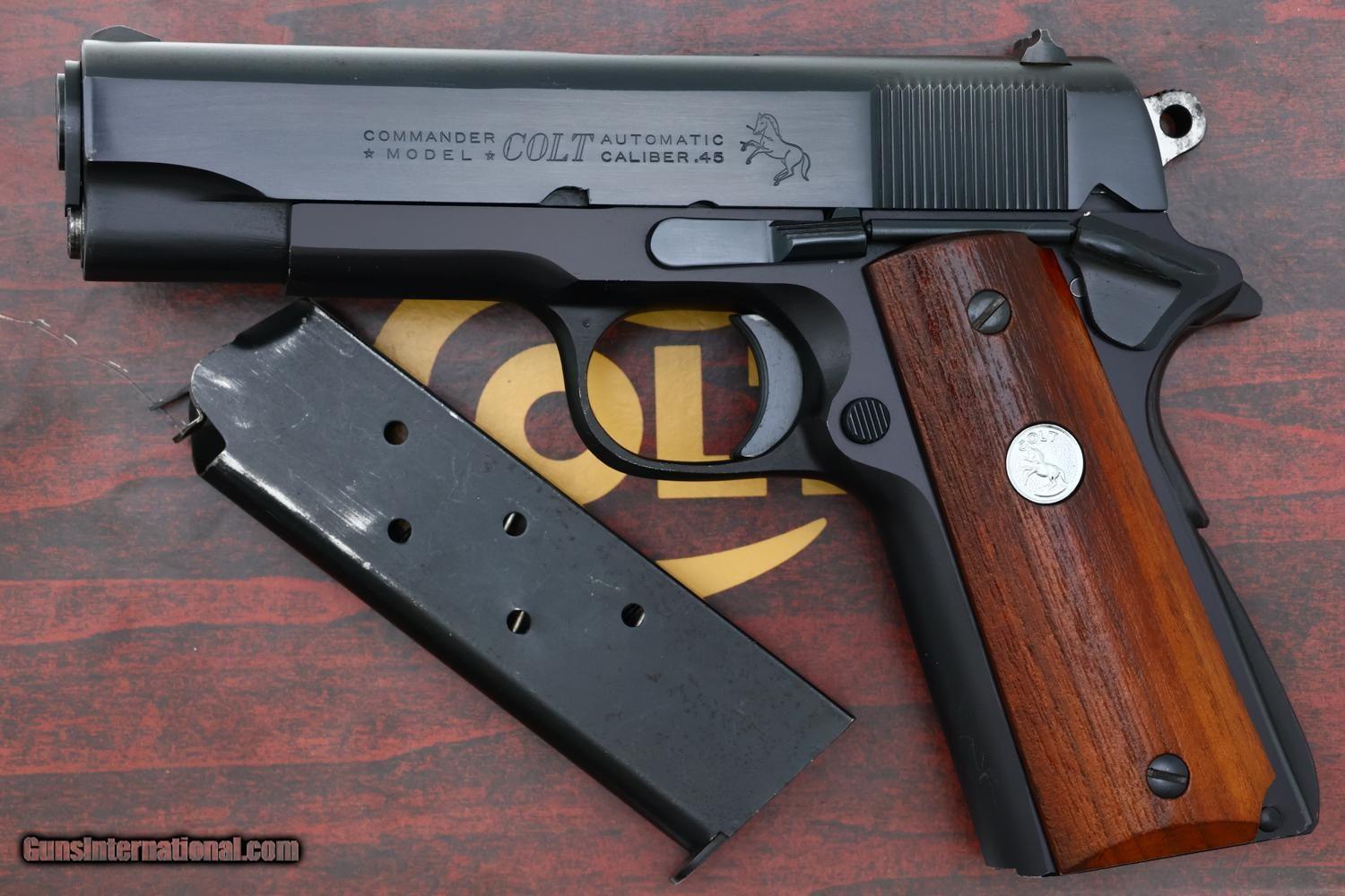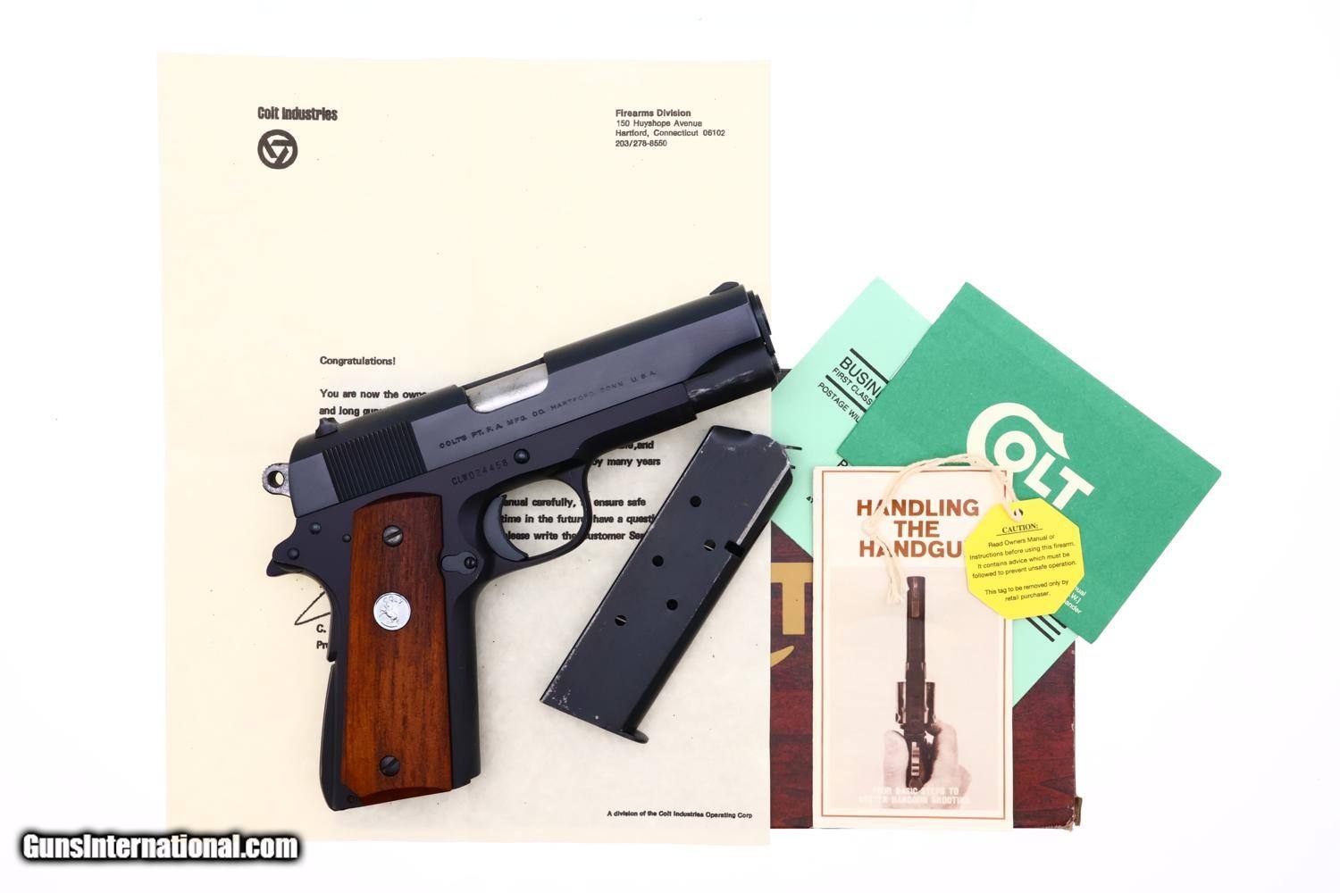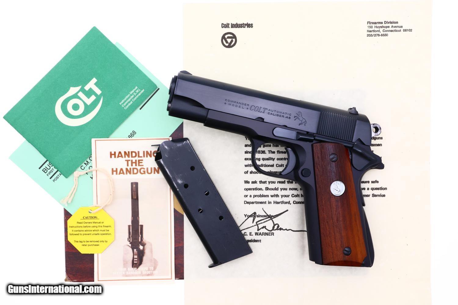 High original condition Colt Commander Lightweight pistol cal. .45ACP, manufactured in 1976, SN: CLW024458, with fixed front sight and drift adjustable rear sight. Left side of slide marked "COMMANDER" MODEL" with "COLT AUTOMATIC CALIBER .45" followed by the rampant Colt logo. The right side of slide is stamped "COLTS PT. F. A MFG CO. HARTFORD CONN. U. S. A" with serial number "CLW024458" on the frame below the slide. Fitted with smooth walnut grips secured with Colt medallions on each panel, secured with standard slotted screws. Blued magazine with 5 cartridge indicator holes on side marked "COLT .45 AUTO." on fixed floorplate. Complete with matching box, likely a reproduction, with appropriate reprinted literature to include hanging tag. A classic pistol representing Colt's post-war effort to find a lighter replacement for the M1911 pistol.