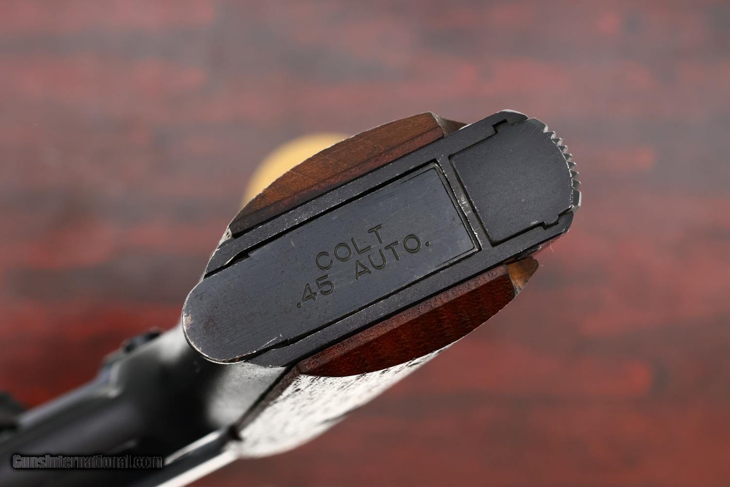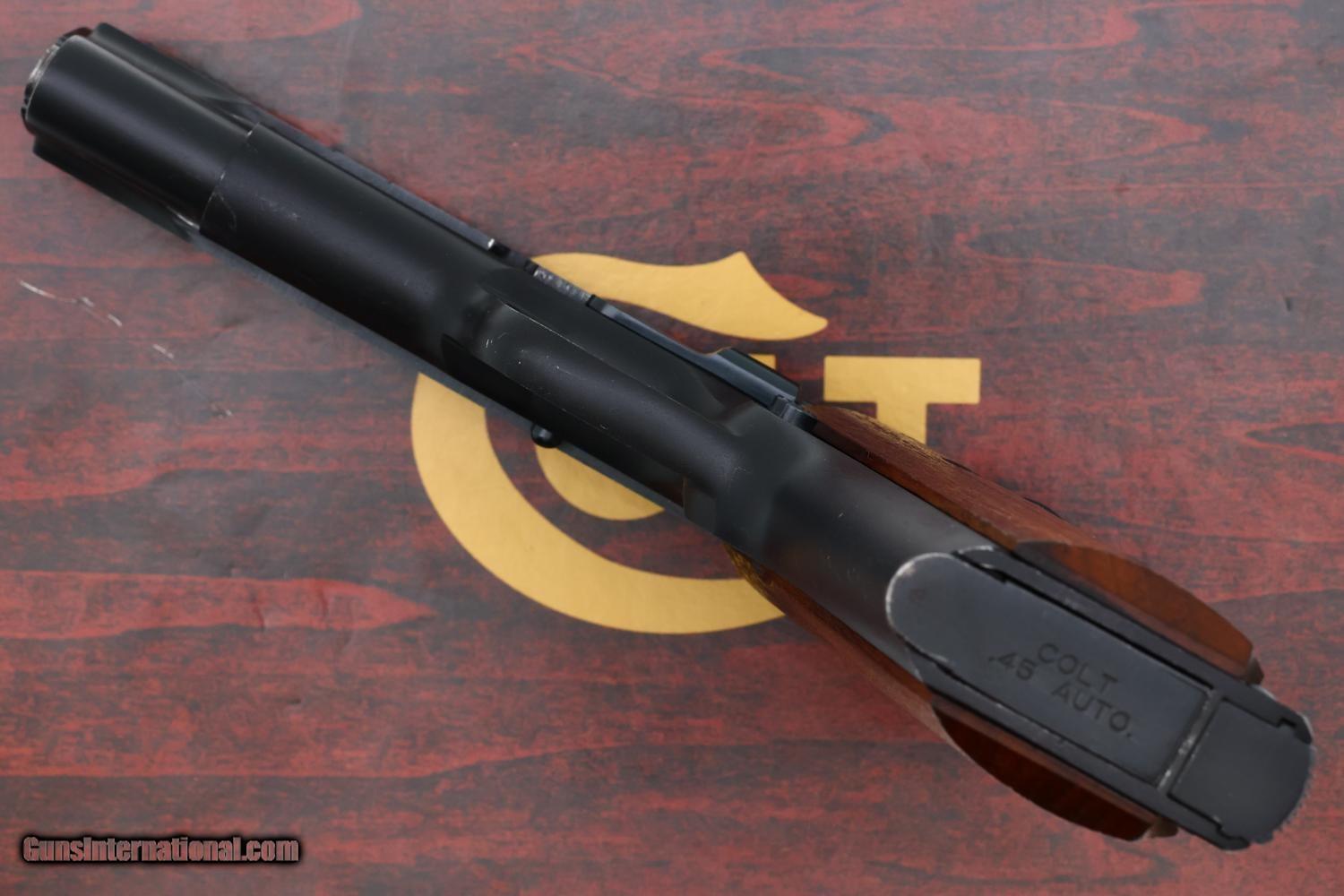 Attractive and desirable Colt Lightweight Commander .45, made 1976, with a fixed front sight, drift adjustable rear sight, and smooth walnut grips, representing Colt's post-WWII innovation aimed at providing a lighter alternative to the M1911.