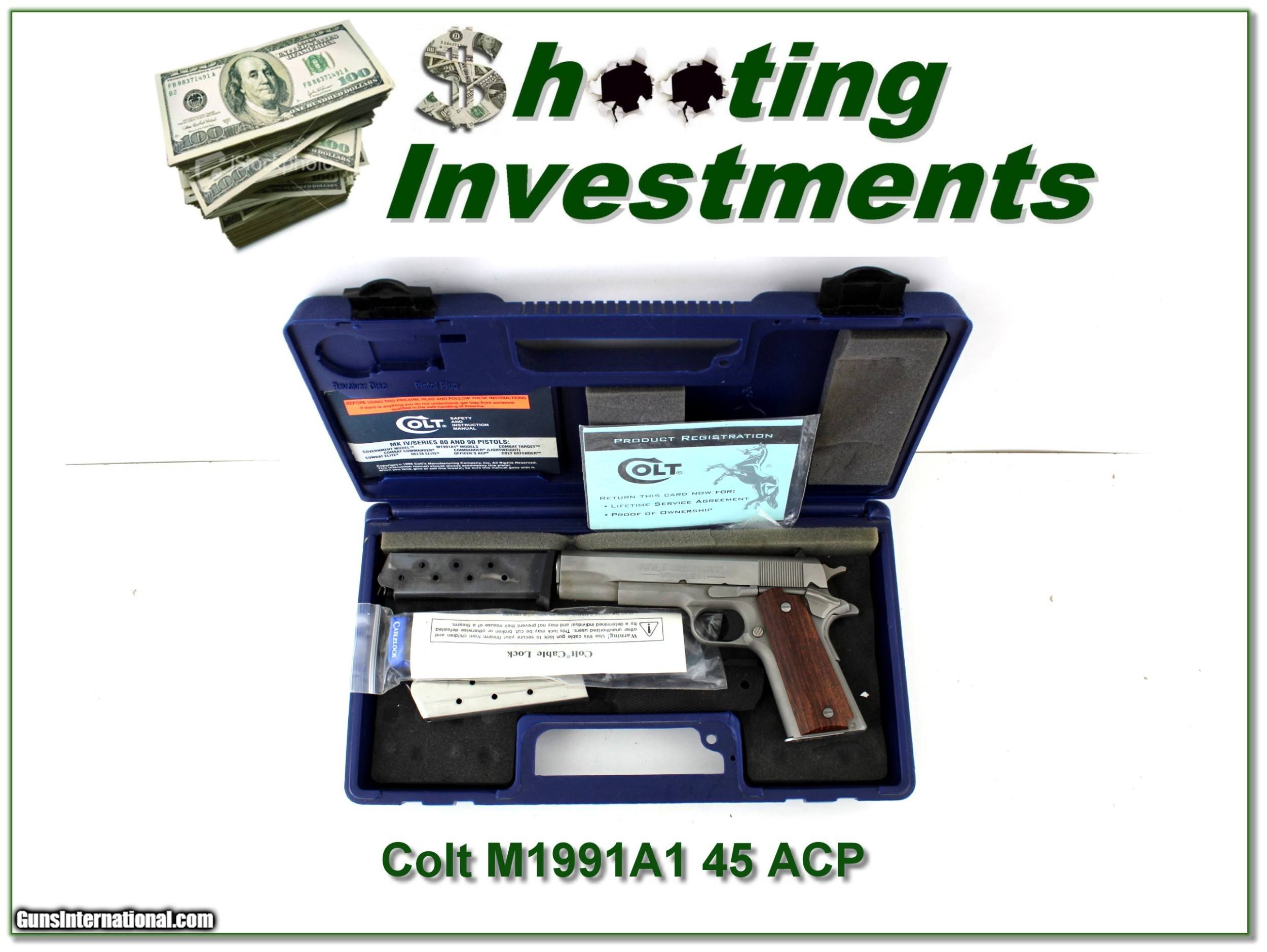 Description: Shooters, this is an excellent condition Colt M1991 A1 45 ACP. It is stainless and comes as seen with both walnut grips and original black grips. It has 3 magazines and original case with papers. I am selling this one on consignment and as such lay-a-way can’t be used. It does of course have the standard 3-day inspection. Shipping and insurance is $49. Please email me with any questions or larger pictures. (Consign your quality firearms with Shooting Investments for only 12%! Let me know if you have any you would like to sell!) 22-0766 Payment: Payment is by Money Order, Cashiers Check or Personal Check. I can now also accept Credit Cards (MasterCard, Visa, Discover & American Express) with a 3% convenience fee. Shipping: The shipping charge will be listed in each description. It is $49 for most long guns. Some heavy guns, over 48in boxes or those insured for over $2000 will be higher. Shipments to Alaska and Hawaii are higher because air shipment is required. Most firearms are shipped on Tuesday and Thursday and usually in 5 days of receipt of payment. We package all shipments carefully and insure them. Optics are shipped Priority Mail and most other non-firearm shipments are shipped First Class. Returns: Our return policy is simple. If for any reason you are not pleased with your purchase, you may return your item for a full refund of purchase price. Ammunition cannot be returned. It is important to us that you are happy. Guns cannot be fired or dissembled before returning them and they must be returned in the same condition as received. Notification of a return must occur with-in 3 days of receipt at your dealer. Shipping, convenience and dealer fees are not refundable and are the responsibility of the buyer. Lay-a-way: If needed, we offer a 60 day lay-a-way option on most firearms. It is 1/3 now, 1/3 in 30 days and 1/3 in 60 days. Lay-a-way firearm sales are final and if not completed the first payment cannot be returned. Consigning your firearms with Shooting Investments: We will help you get top dollar for your firearms. While most local guns shops charge 20% or more, our fee is only 12% with a minimum of $75. At your local gun shop it might take months to sell. Selling on-line provides instant access to thousands of interested buyers. You won’t find any other on-line dealer willing to sell your firearms for only 12% or listing every gun on 3 separate s. Selling through an House typically costs the seller 15% and the buyer an addition 15% (so 30%) and you have to wait several months to sell and longer to receive funds. If properly priced, we will sell your firearms in a few weeks. Send us an email or give us a call and we’ll explain how easy it is for you to get top dollar. Trading: Trading for use is really just buying your gun to re-sell. If you have a gun you want to trade, please email a picture and we will let you know what we can give or it. You will always get more if we sell it for you on consignment. Help for California Buyers: We are happy to ship to California. It is the buyer’s responsibility to make sure any item you buy is legal in your state. We are also happy to help with your purchase of a firearm from someone other than us. If you see a gun you would like to buy but the seller can’t or won’t ship to California they can ship to use and we’ll then ship it to your California dealer. The cost for this service is only $30 + shipping. Let us know if we can help! SOLD |
