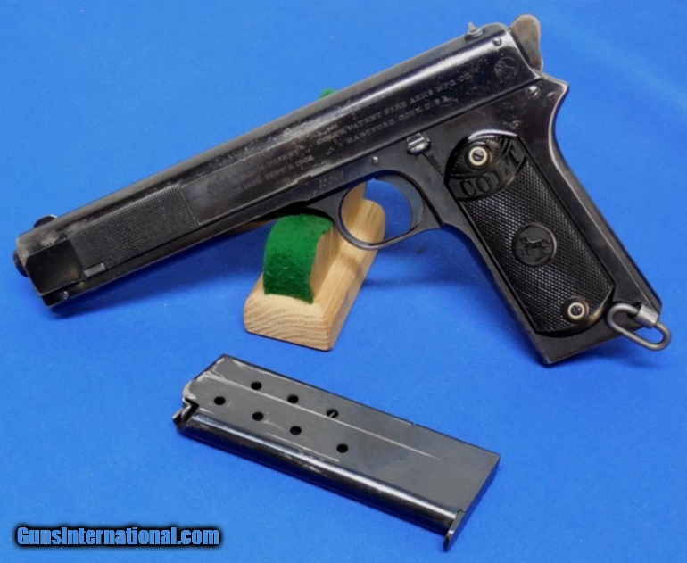 Description: Colt Military Model 1902 Semi-Auto Pistol, serial # 12240, cal. 38 ACP, 6” barrel with a very lightly frosted bore. The original factory blue finish on this crisp 1906 made pistol is in very good to excellent condition with about 90%+ remaining. The grip frame has started to silver from handling wear and there is light silvering on the high edges from holster wear. A few scattered scratches but nothing drastic or alarming, thinning bluing also present. The rounded hammer retains strong case-hardened colors with light wear. The checkered hard rubber grips are in beautiful condition and exhibit only light handling wear. They feature the Rampant Colt in a circle, the word Colt in a banner and decorative motifs. This early pistol has the checkering on the forward end of the slide, split slide lock and a lanyard loop swivel. A single unmarked magazine is included with the gun. The overall condition as described is very good. Inv.: # 1-1233 SOLD Curio/Relic: Yes |
