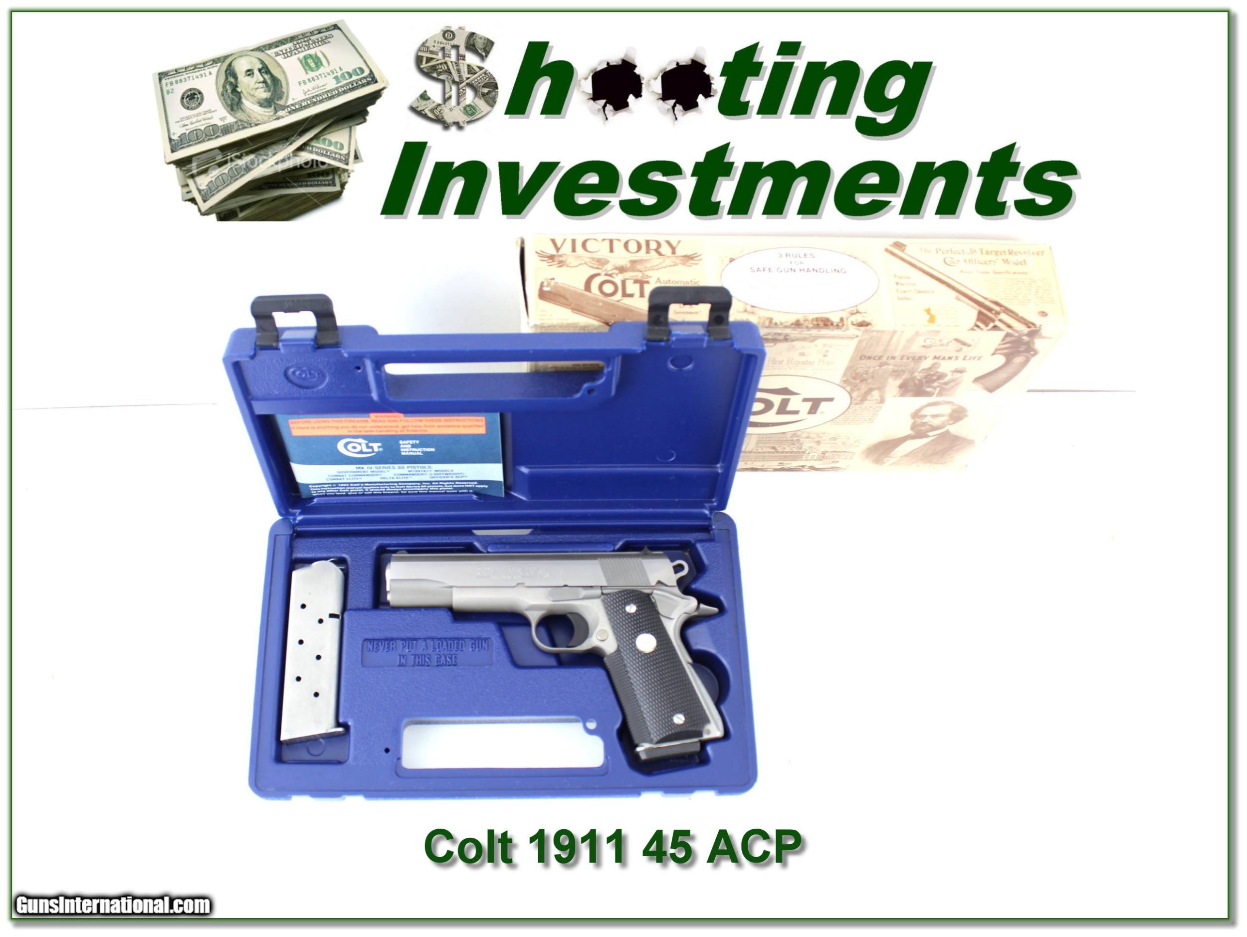 Description: This is a hard to find and excellent condition Colt MK IV Enhanced Stainless. It has been factory enhanced over a standard Government model with a skeletonized hammer, beavertail grip safety, ribbed slide and wraparound rubber grips. It comes as seen in original case with manual and 2 magazines. I am selling this one on consignment and as such lay-a-way can’t be used. It does of course have the standard 3-day inspection. Shipping and insurance is $39. Please email me with any questions or larger pictures. (Consign your quality firearms with Shooting Investments for only 12%! Let me know if you have any you would like to sell!) 21-0782 Payment: Payment is by Money Order, Cashiers Check or Personal Check. I can now also accept Credit Cards (MasterCard, Visa, Discover & American Express) with a 3% convenience fee. Shipping: The shipping charge will be listed in each description. It is $39 for most firearms. Some heavy guns or those insured for over $2000 will be higher. Shipments to Alaska and Hawaii are higher because air shipment is required. Most firearms are shipped on Tuesday and Thursday and usually in 5 days of receipt of payment. We package all shipments carefully and insure them. Optics are shipped Priority Mail and most other non-firearm shipments are shipped First Class. Returns: Our return policy is simple. If for any reason you are not pleased with your purchase, you may return your item for a full refund of purchase price. Ammunition cannot be returned. It is important to us that you are happy. Guns cannot be fired or dissembled before returning them and they must be returned in the same condition as received. Notification of a return must occur with-in 3 days of receipt at your dealer. Shipping, convenience and dealer fees are not refundable and are the responsibility of the buyer. Lay-a-way: If needed, we offer a 60 day lay-a-way option on most firearms. It is 1/3 now, 1/3 in 30 days and 1/3 in 60 days. Lay-a-way firearm sales are final and if not completed the first payment cannot be returned. Consigning your firearms with Shooting Investments: We will help you get top dollar for your firearms. While most local guns shops charge 20% or more, our fee is only 12% with a minimum of $75. At your local gun shop it might take months to sell. Selling on-line provides instant access to thousands of interested buyers. You won’t find any other on-line dealer willing to sell your firearms for only 12% or listing every gun on 3 separate s. Selling through an House typically costs the seller 15% and the buyer an addition 15% (so 30%) and you have to wait several months to sell and longer to receive funds. If properly priced, we will sell your firearms in a few weeks. Send us an email or give us a call and we’ll explain how easy it is for you to get top dollar. Trading: Trading for use is really just buying your gun to re-sell. If you have a gun you want to trade, please email a picture and we will let you know what we can give or it. You will always get more if we sell it for you on consignment. Help for California Buyers: We are happy to ship to California. It is the buyer’s responsibility to make sure any item you buy is legal in your state. We are also happy to help with your purchase of a firearm from someone other than us. If you see a gun you would like to buy but the seller can’t or won’t ship to California they can ship to use and we’ll then ship it to your California dealer. The cost for this service is only $30 + shipping. Let us know if we can help! SOLD |