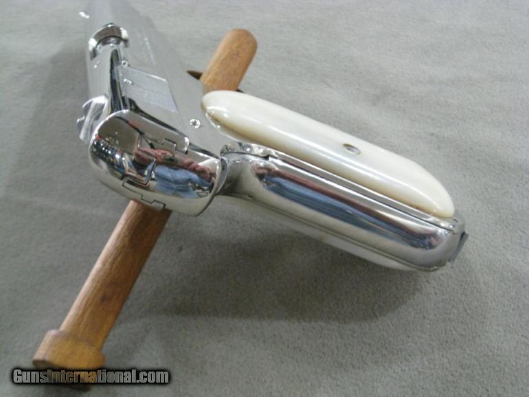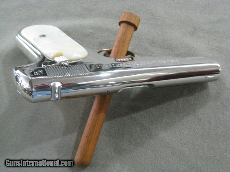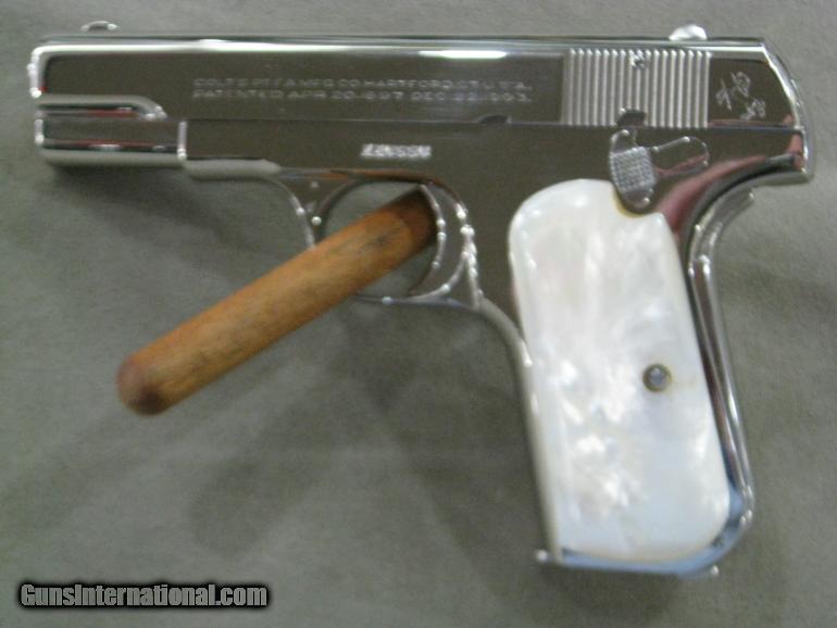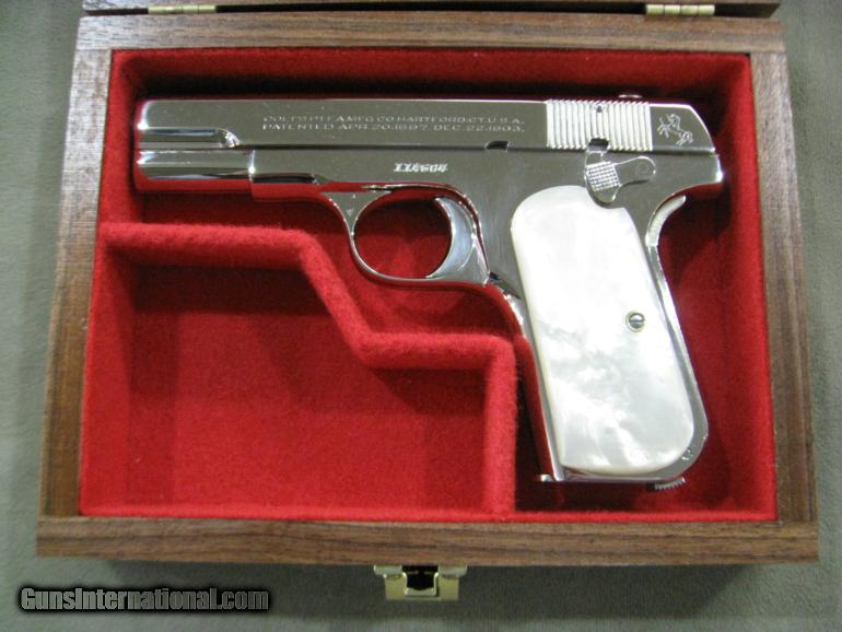 In 1932 Colt shipped this pistol to Western Cartridge Company which they had special ordered for reasons no longer known, Judging from the condition of this gun today, I believe we may surmise that they didn't buy it to test new cartridges, as it appears not to have been fired at all. In any event to my fermented mind, this appears to be the perfect pistol to slip into your pocket the next time you're invited to an event requiring a tuxedo or white tie. The gun comes with the walnut presentation case, to keep it in while awaiting that special invitation. Oh, need I mention, of course those are genuine Mother Of Pearl grips. You wouldn't be caught dead with anything less. Factory letter included.