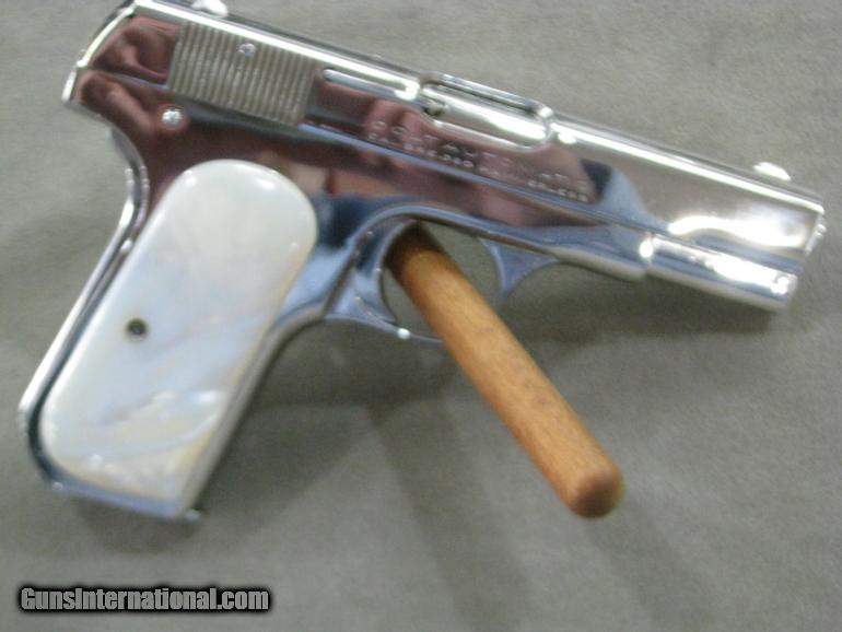 Description: In 1932 Colt shipped this pistol to Western Cartridge Company which they had special ordered for reasons no longer known, Judging from the condition of this gun today, I believe we may surmise that they didn't buy it to test new cartridges, as it appears not to have been fired at all. In any event to my fermented mind, this appears to be the perfect pistol to slip into your pocket the next time you're invited to an event requiring a tuxedo or white tie. The gun comes with the walnut presentation case, to keep it in while awaiting that special invitation. Oh, need I mention, of course those are genuine Mother Of Pearl grips. You wouldn't be caught dead with anything less. Factory letter included. SOLD Curio/Relic: Yes |