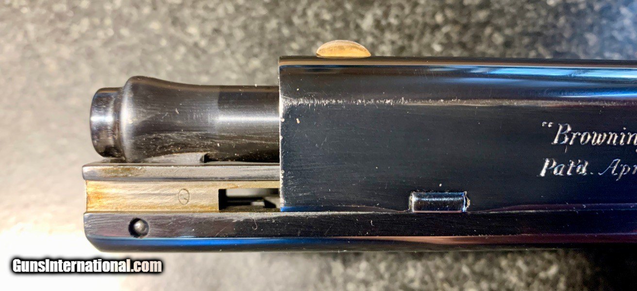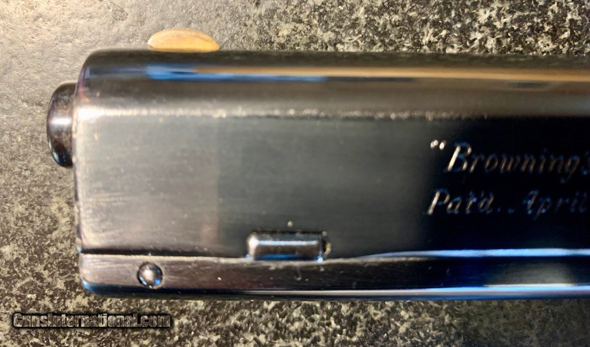 Description: This is a unusal example of the first automatic pistol ever marketed and manufactured in the United States. It is a prototype recoil operated handgun designed by John Browning and licensed to Colt for production. Approximately 4274 of these early semi-auto pistols were manufactured by Colt from 1900 to 1903. Because it is truly a protoype handgun, numerous changes and variations in the firearm occured over it's production period. This is a three digit serial number gun, produced in 1900, the first year of production. This example is truly in collector/museum condition with a high lustre blued finish, fired blue screws and small parts and a case hardened hammer and front sight. Originally this gun was produced with a rear sight safety. Around serail number 2200-2450, Colt changed the rear sight safety to a fixed sight and offered to alter the original rear sight safety to fixed sights for all earlier guns. Any gun sent to Colt for the rear sight alteration was factory refinished by Colt. This gun was sent back to Colt for the rear sight conversion (and refinish). This unit is very unusual as the markings on the slide appear to be engraved, rather than roll stamped. The gun was part of the collection of John (Jake) Grady of Horsham, PA. Upon his death, his widow consigned the collection to us for public sale. When she later passed away, the estate found a few additonal pieces in the home and asked us to sell them as well. As such, I have no information, history or provenance on the offered pieces. The included magazine may well not be original since most of these were nickel plated, and this one is blued. Nonetheless, an absolutely gorgeous piece in exceptional condition. SOLD Curio/Relic: Yes Handgun Caliber: .38 AMU (rimless .38 Special) Manufacturer: Colt Model: 1900 Serial Number: 566 Barrel Length: 6 Condition: NRA Excellent Metal Condition: NRA Excellent Wood Condition: Excellent Bore Condition: Excellent Action: Semi-auto/recoil operated Finish: High Lustre Blue Sights: Fixed |