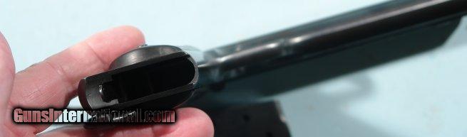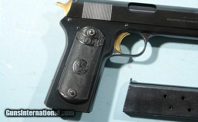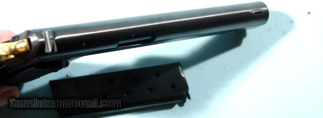 Description: COLT MODEL 1902 MILITARY .38 RIMLESS CALIBER SEMI-AUTO PISTOL. Serial number "39XXX" circa 1916. 6" barrel. Original magazine stamped "Cal .38/ Colt" on butt. Professionally reblued overall with gold plated trugger and hammer. Left grip panel original and right an excellent replacement. Excellent rifling. Perfect working order will make it a good shooter and affordable collector's piece. SOLD Curio/Relic: Yes |