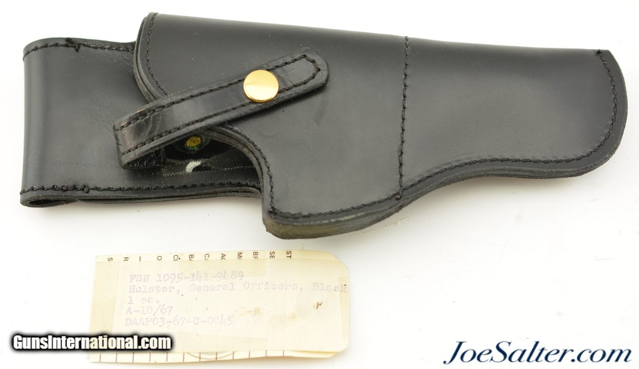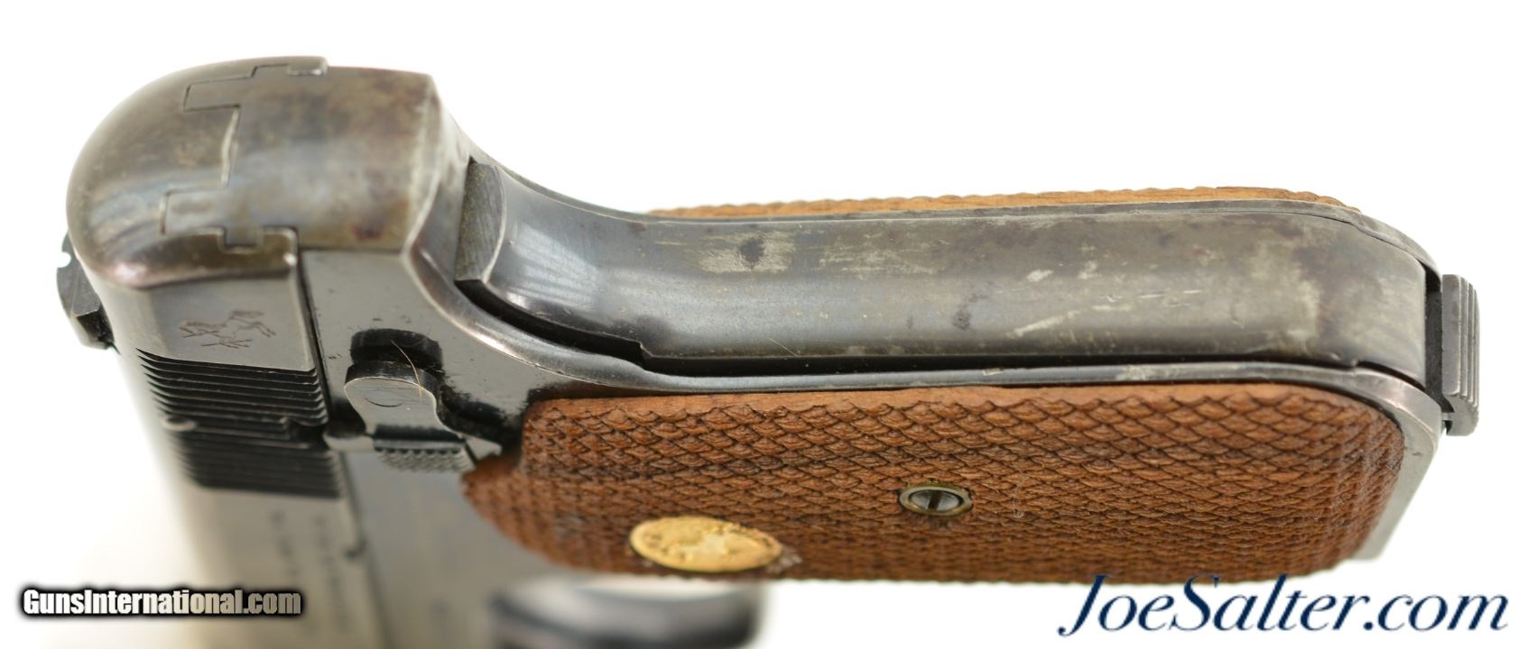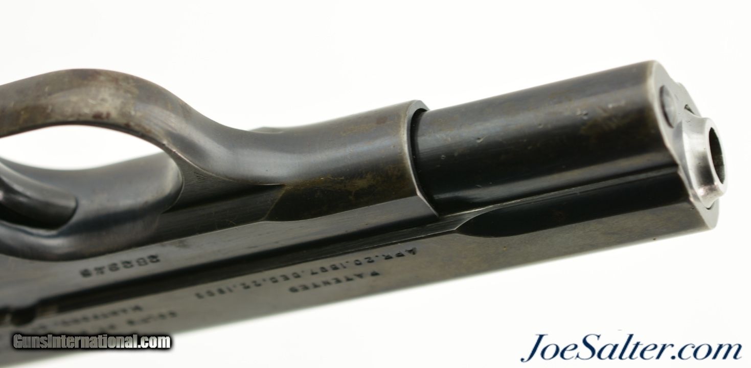 Description: Serial #282946, .32 ACP, 3 ¾ inch barrel with a very fine bore with light frosting in the grooves. This is the model 1903 Pocket Hammerless pistol manufactured by Colt in 1918. The Type III pistol retains about 80-85% thinning blue most prominent on the grip frame with areas of freckling and some surface roughness on the rear of the frame and along the parts of the slide. It The later gold emblem Colt grips remain excellent with crisp checkering. It comes in an original leather standard issue holster with the FSN tag that is in like new condition. A great looking WWI era civilian Colt 1903. FFL or C&R Curio/Relic: Yes Price: $995.00 Contact Seller |