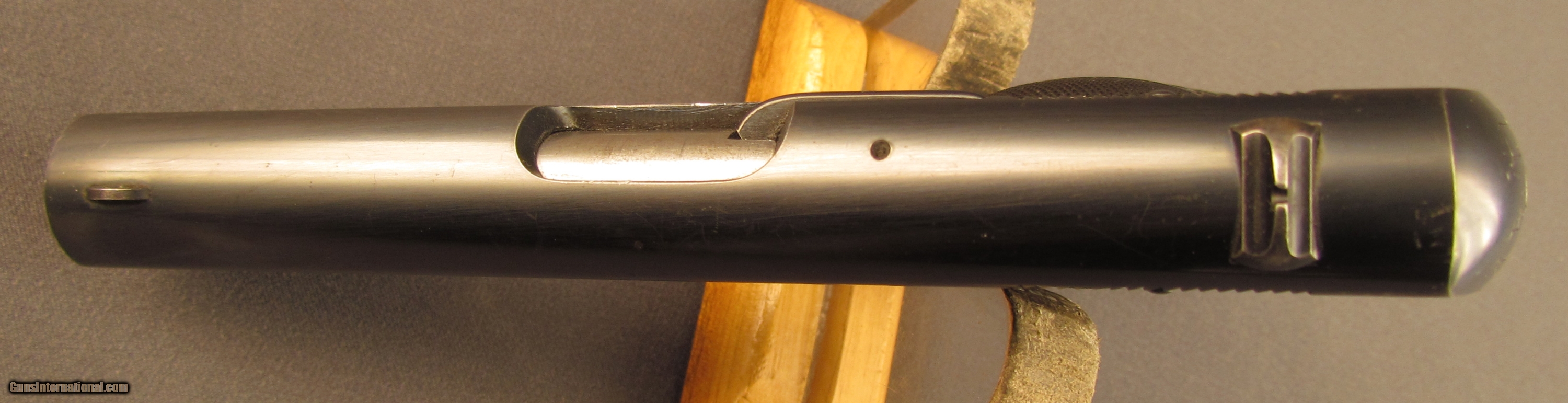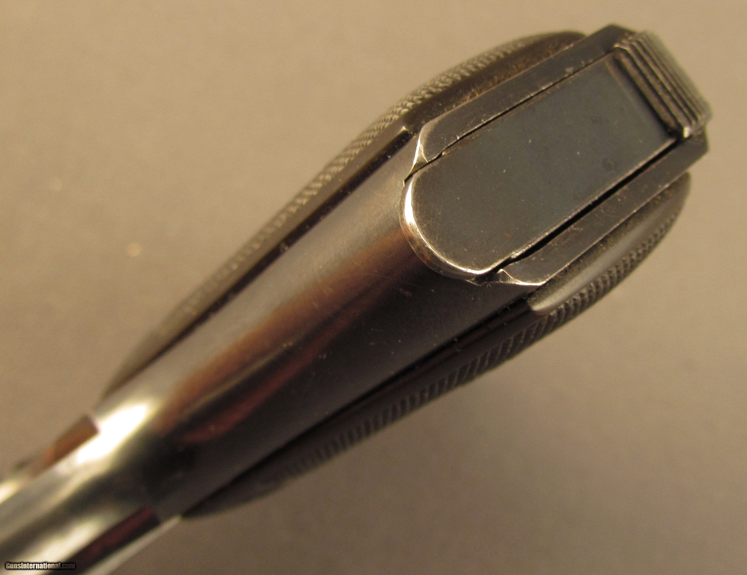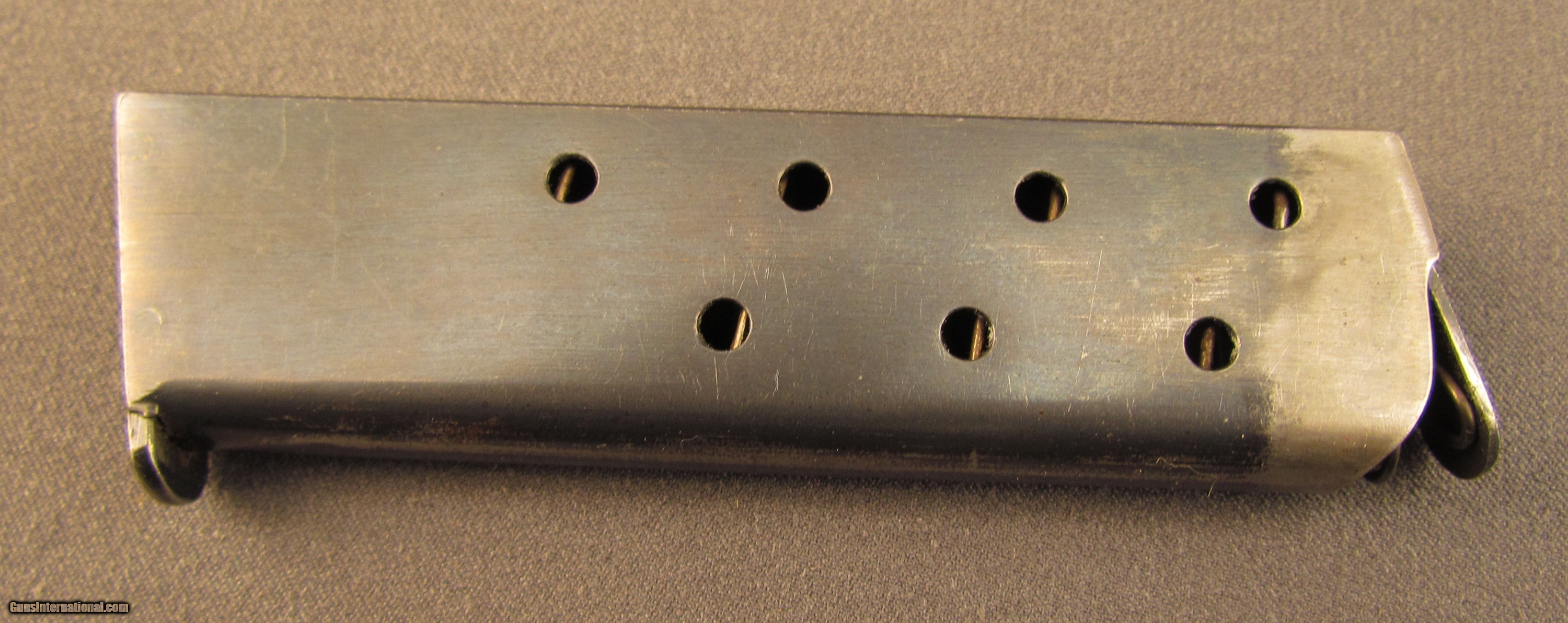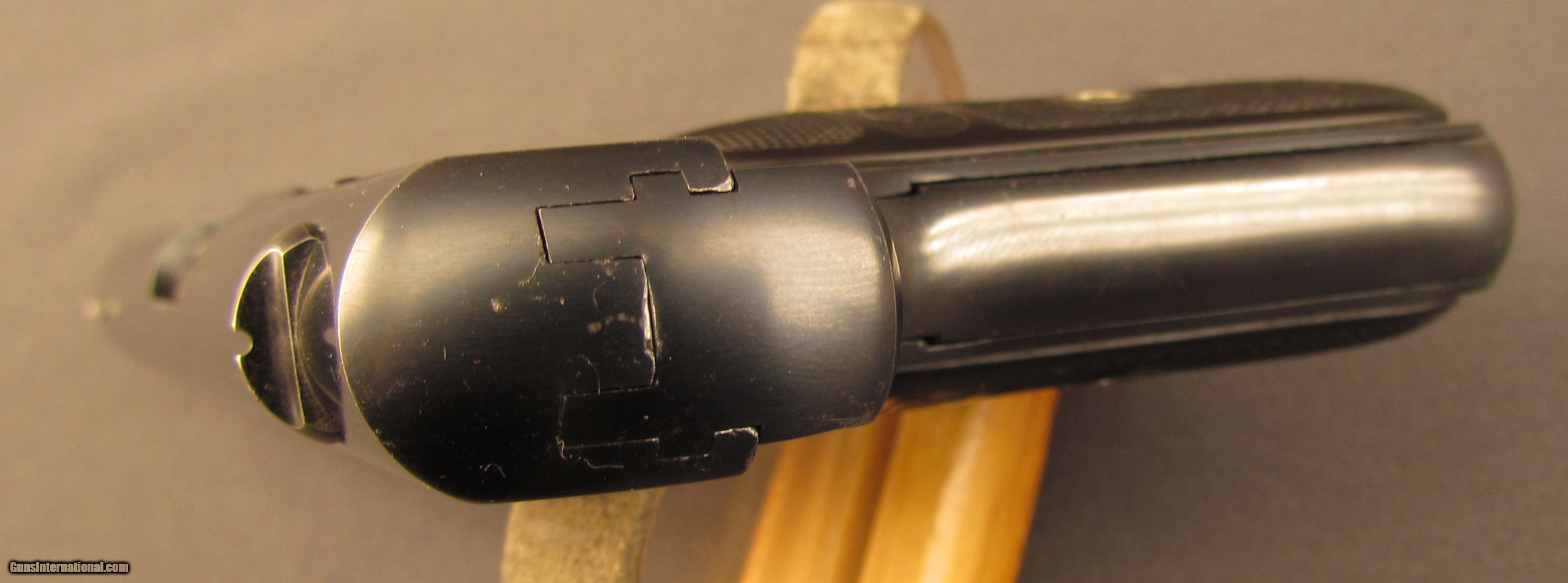 Description: Serial #446115, .32 ACP, 3 3/4” barrel with an excellent, bright bore. This is a Type III pistol that has matching numbers on the frame and slide. The metal retains 98-99% of the original commercial blue finish with some mild silvering along the edges and projections. The safety and trigger retain a commensurate amount of their high polish blue finish and the checkered, hard rubber grips are in excellent shape as well. The checkering is still sharp with only some very mild flattening of the points and a few negligible surface scuffs. The pistol comes with an earlier, but still correct, two-tone, unmarked, pinned-base magazine. This is an excellent condition pistol that would make a great addition to any collection. FFL or C&R SOLD Curio/Relic: Yes Manufacturer: Colt Model: 1903 Serial Number: 446115 Caliber Info: .32 ACP Gauge Info: .32 ACP |