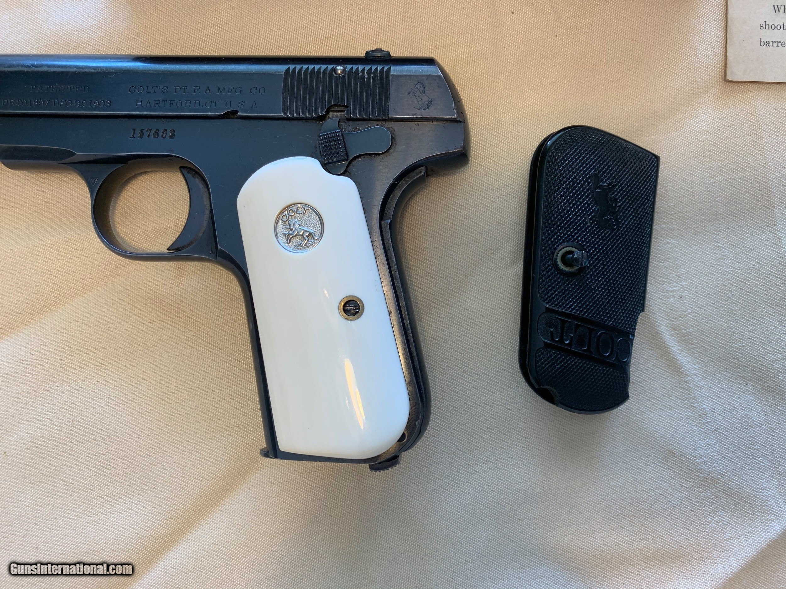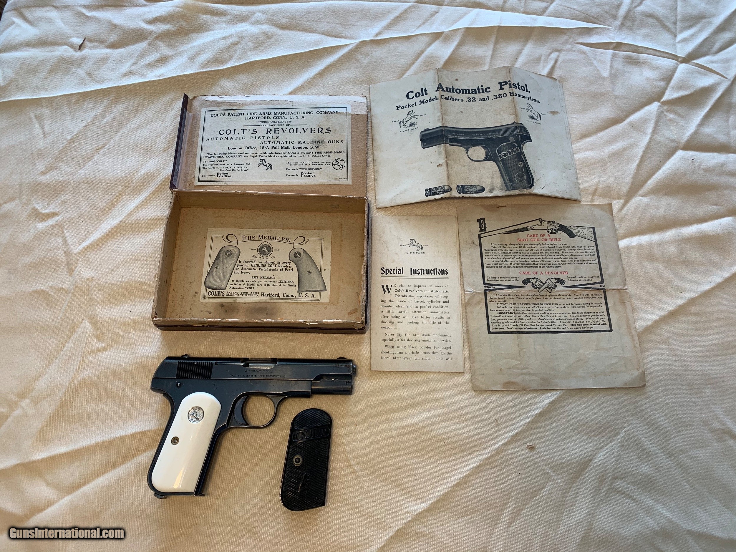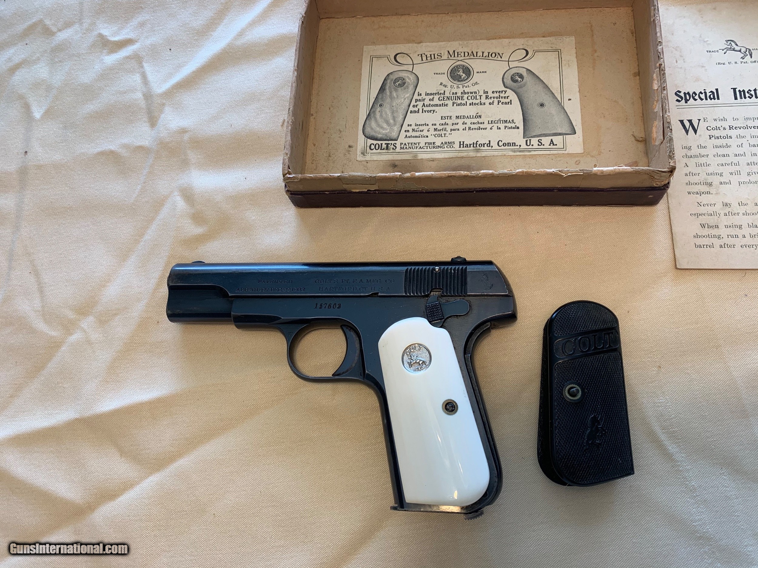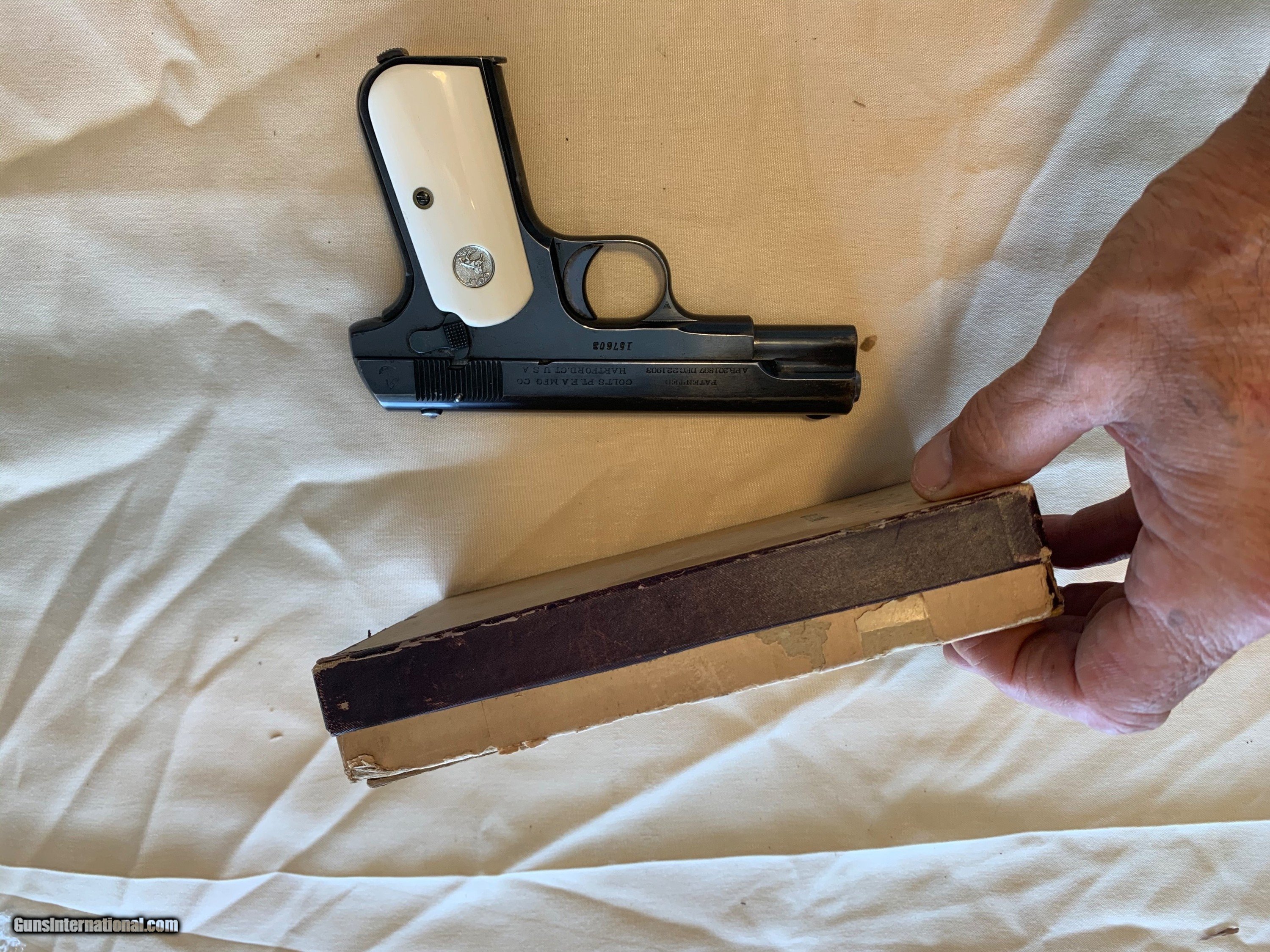 Description: Heres a very nice Colt 1903 . 32 caliber . Comes with original box and paperwork also has original cleaning rod . Gun comes with original grips and Colt grips on gun . Gun is in Excellent Plus Condition. Bore and mechanics are Excellent Plus . Most all of its original luster blue Finish still remains . Gun is un used . Please review my photos and email me with any questions? 3 day inspection as allways . Thank you for looking Little Jo SOLD Curio/Relic: Yes Manufacturer: Colt |