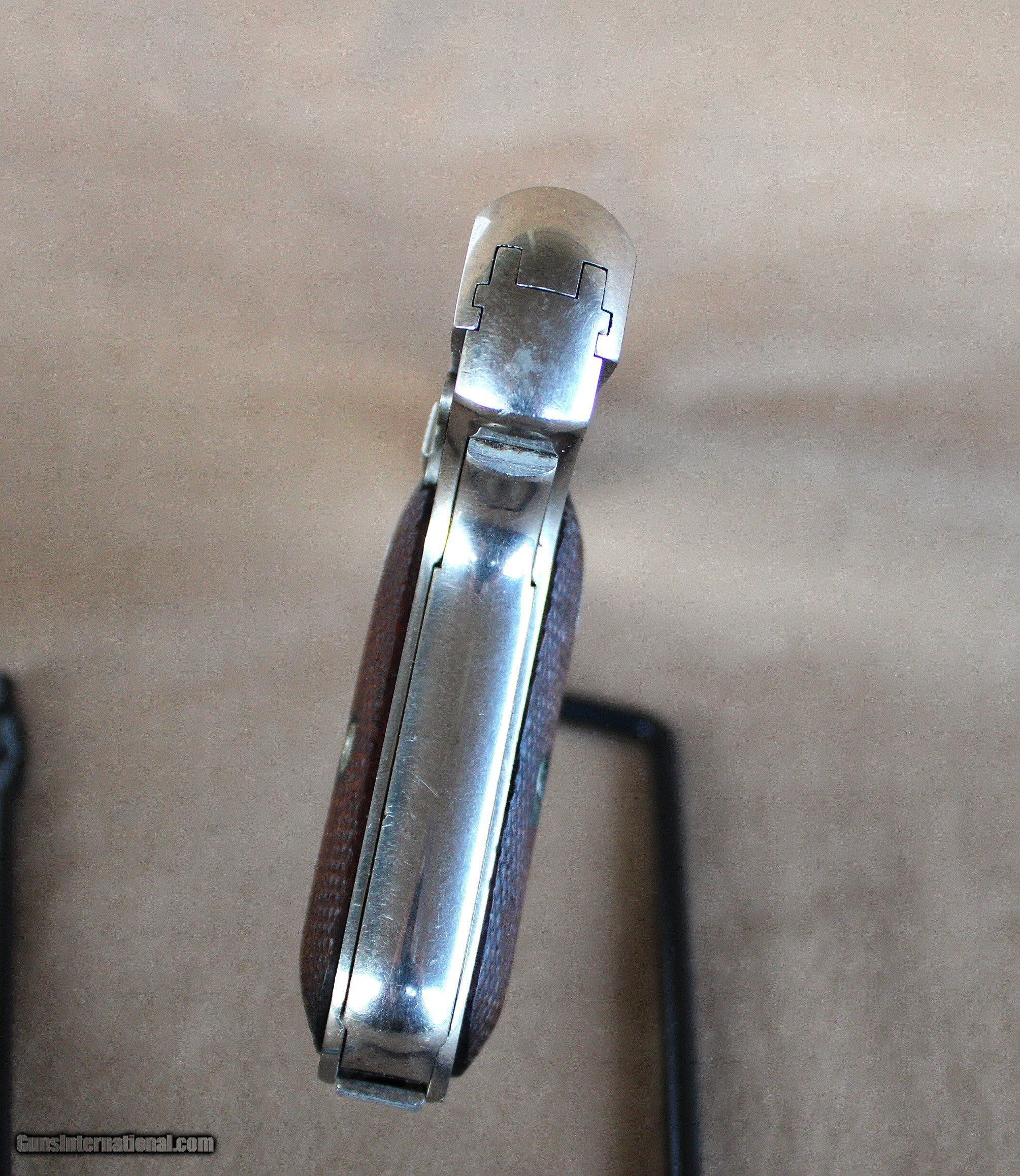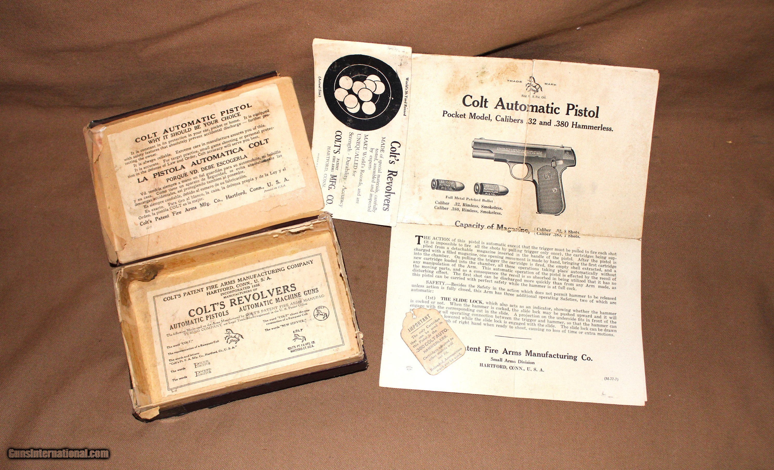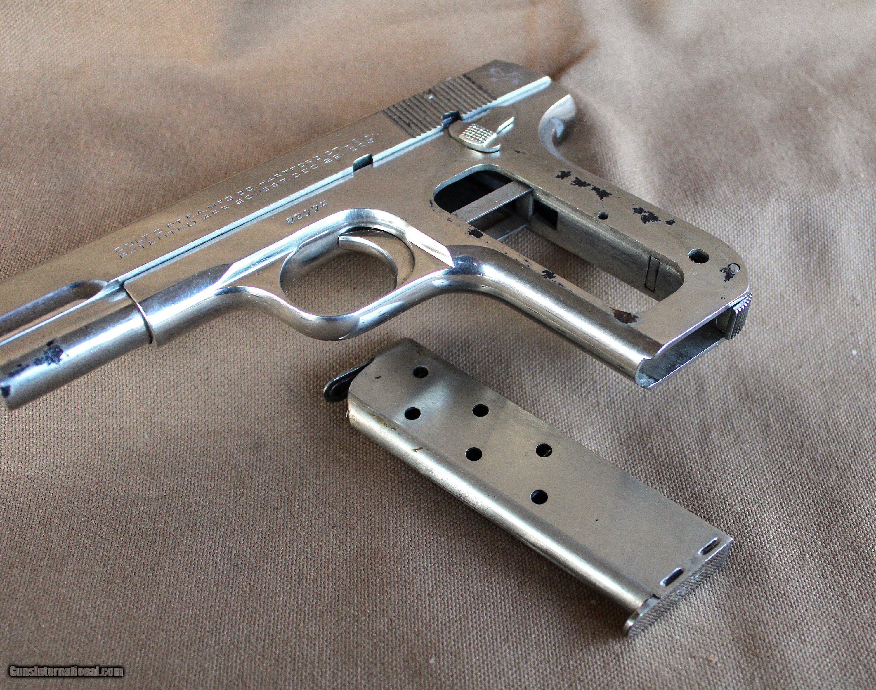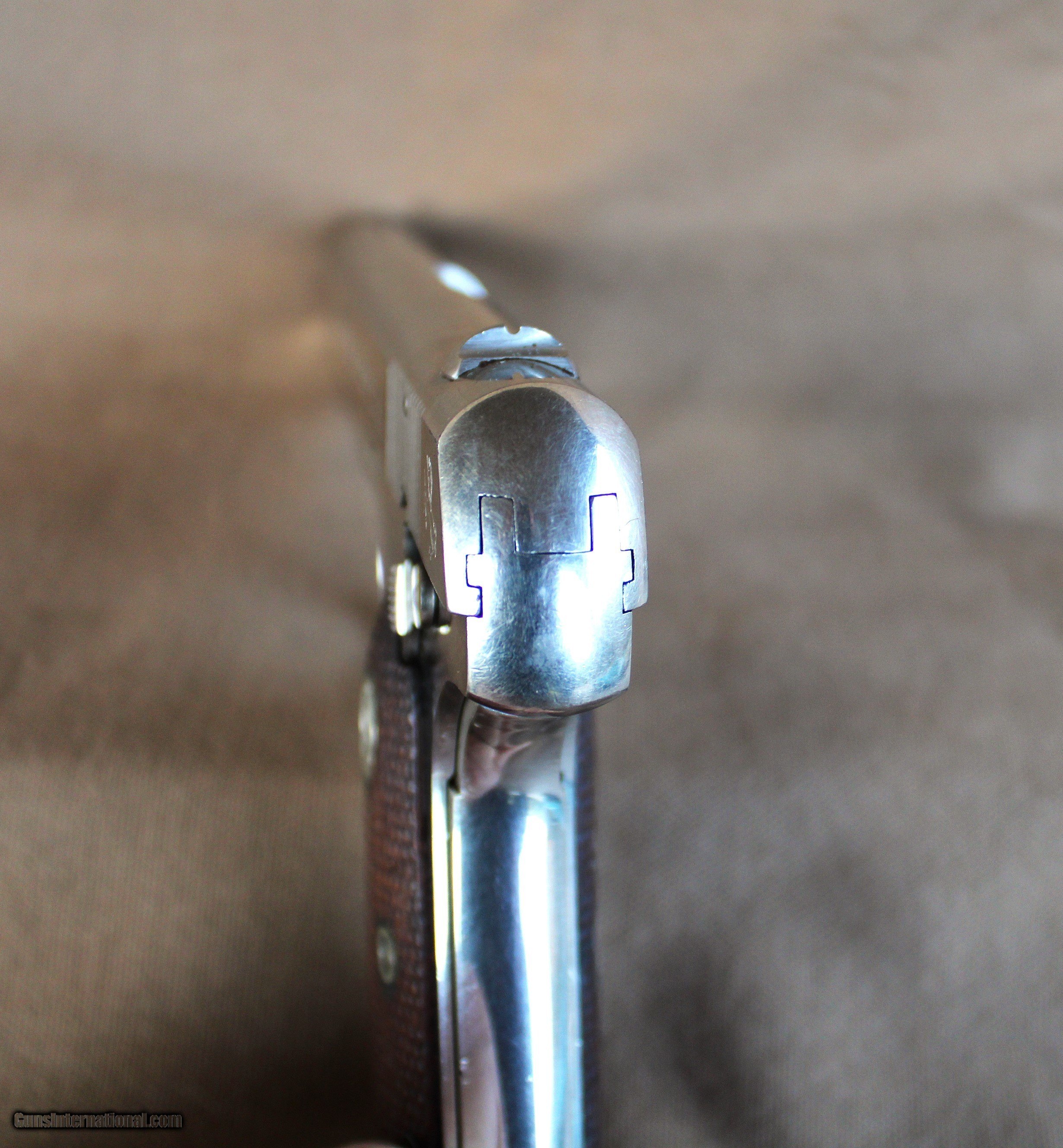 Description: This is a Colt model 1908 Hammerless Pocket Automatic pistol, chambered in the .380. It has the original factory nickel finish, wood grips and factory magazine. It was shipped to Stauffer Eshleman & Co., New Orleans, LA in 1925. This store, and it's founder have a very interesting history. The pistol is in excellent mechanical condition, showing only little signs of being fired. The bore is in very fine condition also. There is some cosmetic wear and errosion to the nickel finish, mainly under the grips and also a spot under the forward part of the slide. The checkered Colt grips are solid, showing some storage and carry wear. The box is in tattered shape, missing some pieces, held together with tape. The papers inside are very good considering it is 100 years old and was a New Orleans gun - overall a nice little Colt, and an above average survivor for the gulf coast climate. **** Must ship to a FFL, C&R okay. Please know your local laws before . Certified funds, check preferred, however i can accept a C.Card with an added 3% fee. **** Thank you Curio/Relic: Yes Handgun Caliber: .380 ACP (9x17mm Browning Short) Manufacturer: Colt Model: 1908 Serial Number: 82774 Barrel Length: 3 3/4 Condition: very good original Bore Condition: excellent Price: $1,625.00 Shipping: $50.00 Contact Seller |