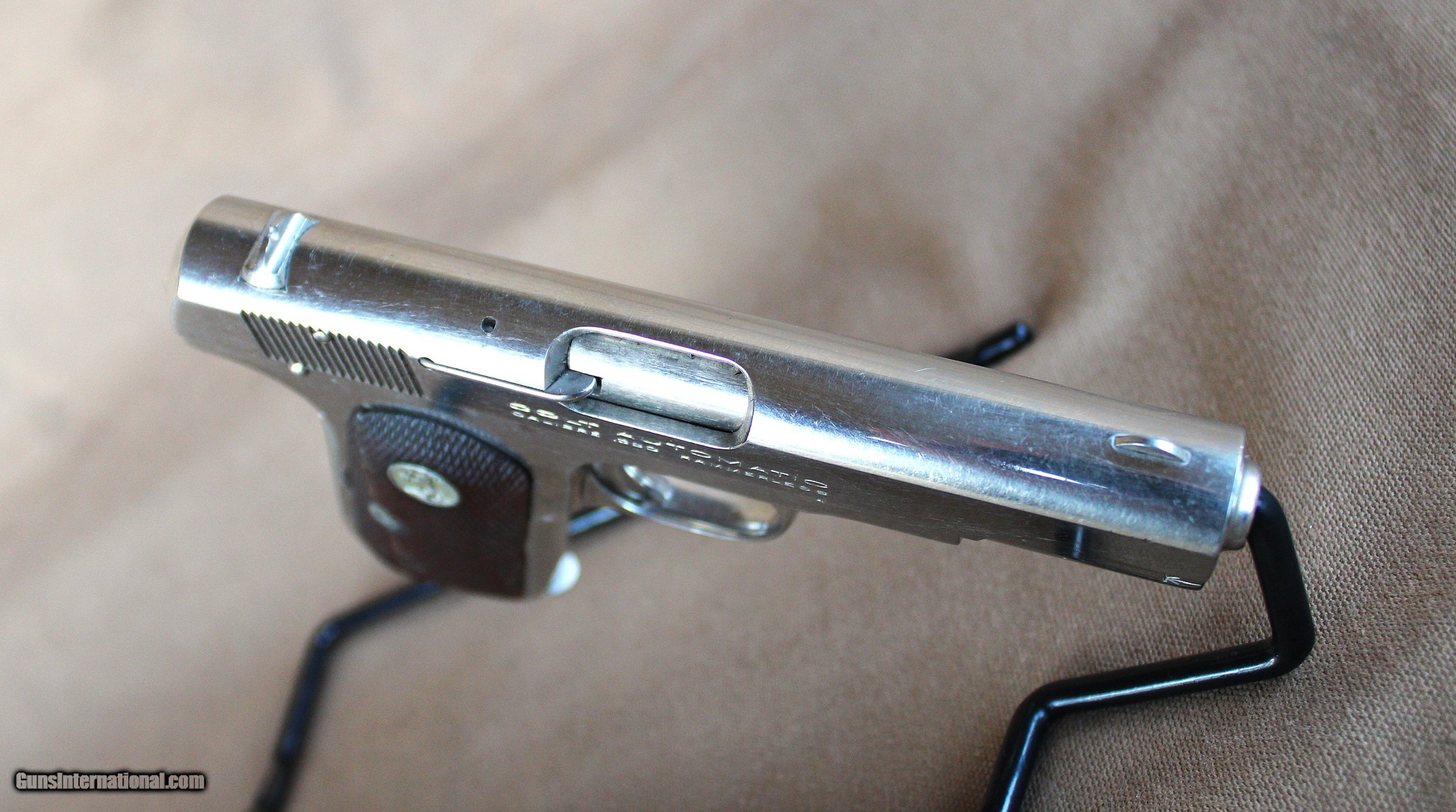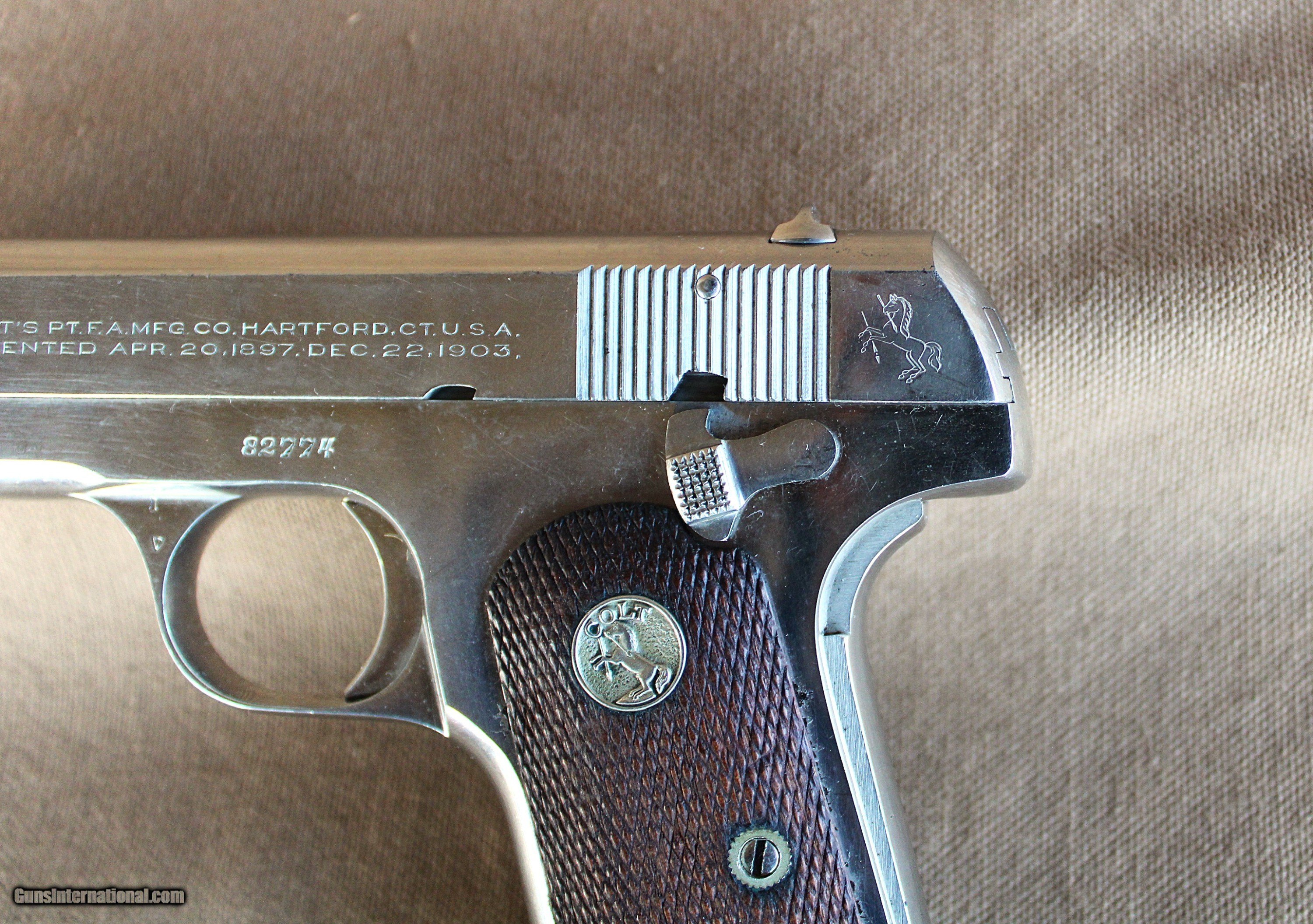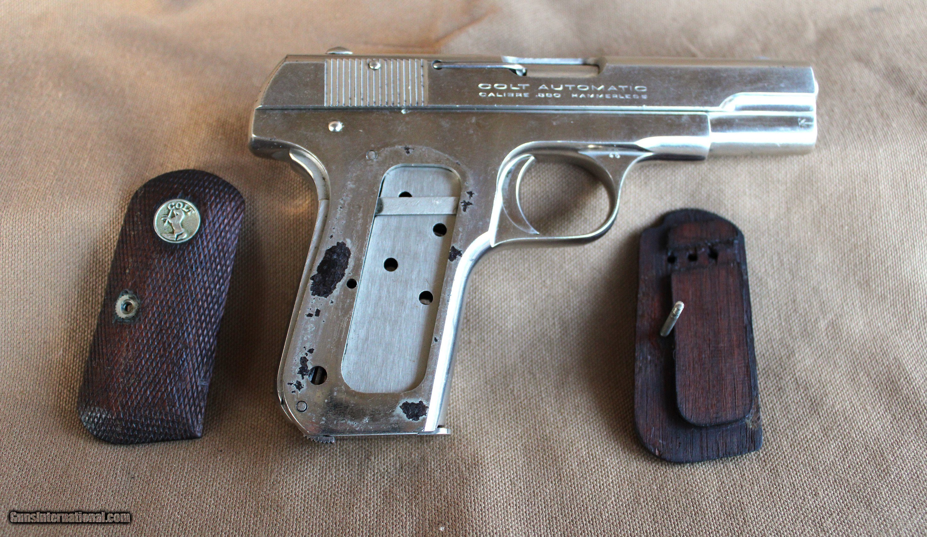 Description: This is a Colt model 1908 Hammerless Pocket Automatic pistol, chambered in the .380. It has the original factory nickel finish, wood grips and factory magazine. It was shipped to Stauffer Eshleman & Co., New Orleans, LA in 1925. This store, and it's founder have a very interesting history. The pistol is in excellent mechanical condition, showing only little signs of being fired. The bore is in very fine condition also. There is some cosmetic wear and errosion to the nickel finish, mainly under the grips and also a spot under the forward part of the slide. The checkered Colt grips are solid, showing some storage and carry wear. The box is in tattered shape, missing some pieces, held together with tape. The papers inside are very good considering it is 100 years old and was a New Orleans gun - overall a nice little Colt, and an above average survivor for the gulf coast climate. **** Must ship to a FFL, C&R okay. Please know your local laws before . Certified funds, check preferred, however i can accept a C.Card with an added 3% fee. **** Thank you Curio/Relic: Yes Handgun Caliber: .380 ACP (9x17mm Browning Short) Manufacturer: Colt Model: 1908 Serial Number: 82774 Barrel Length: 3 3/4 Condition: very good original Bore Condition: excellent Price: $1,625.00 Shipping: $50.00 Contact Seller |