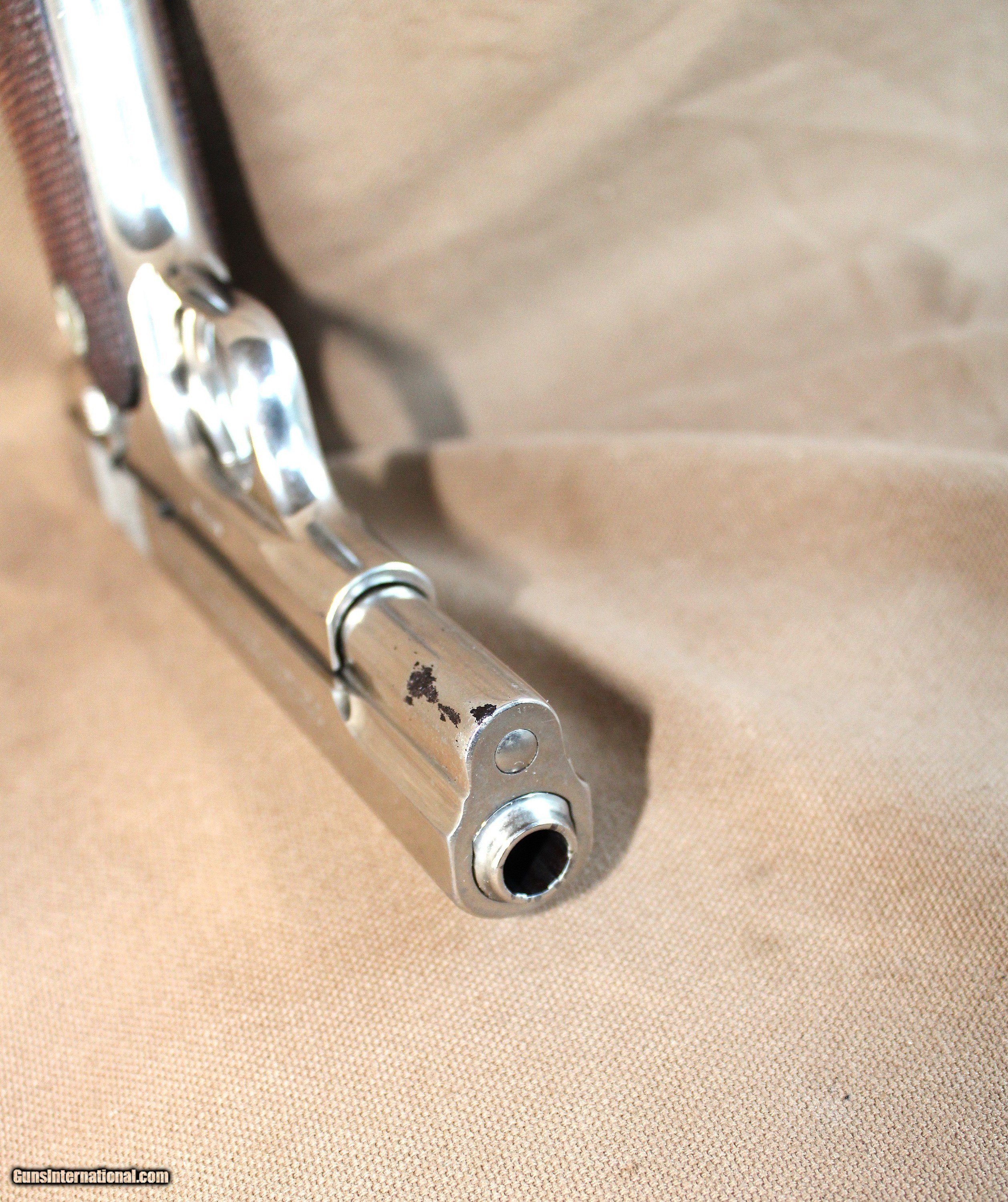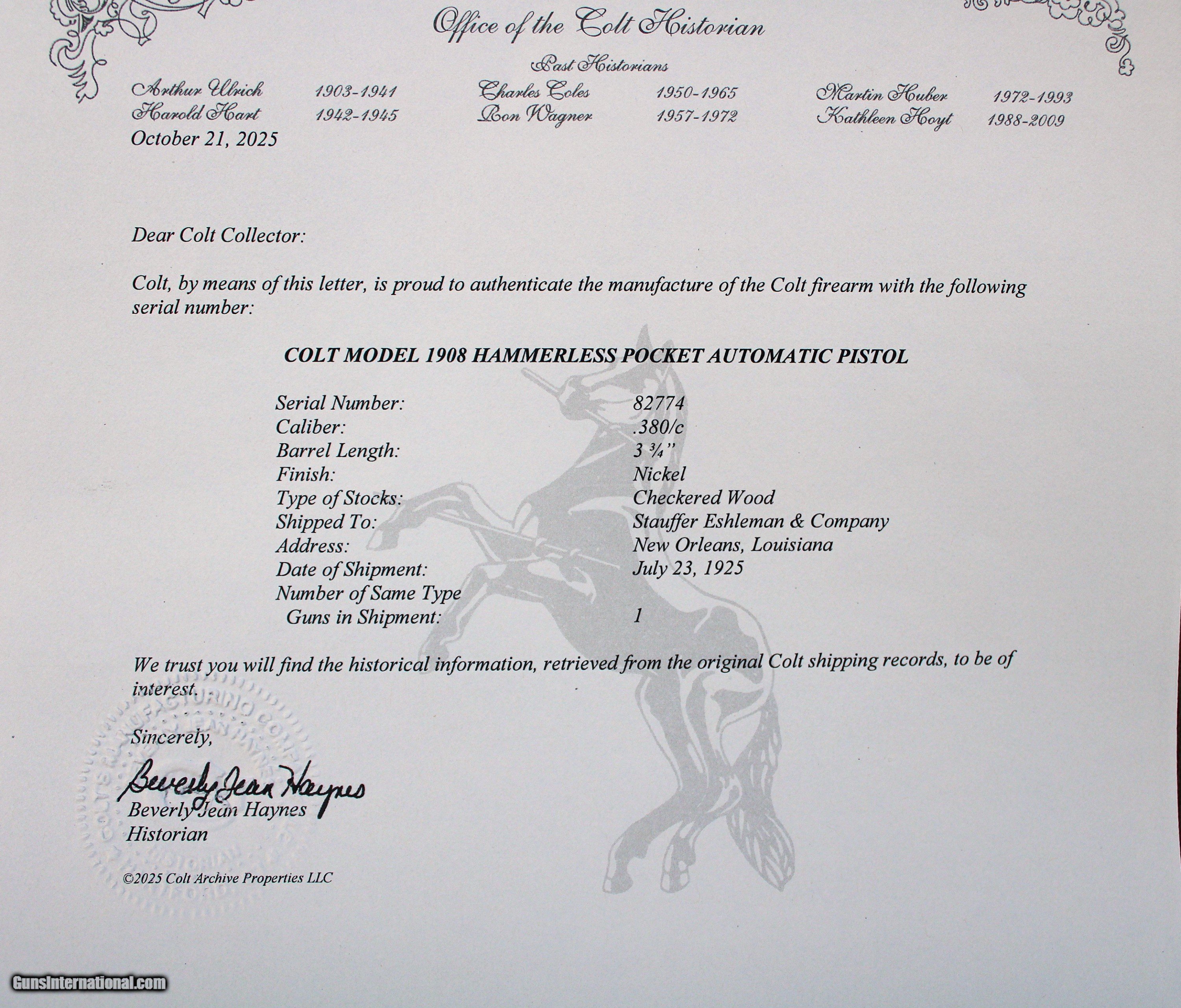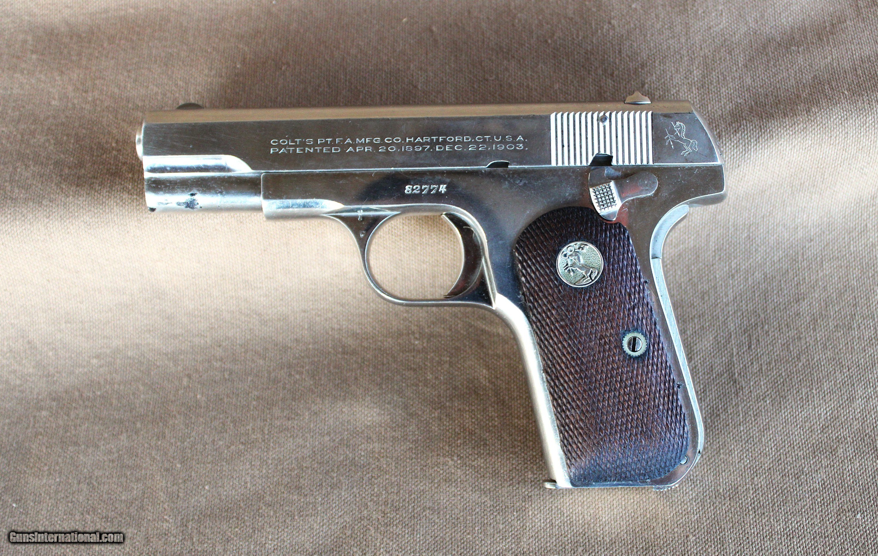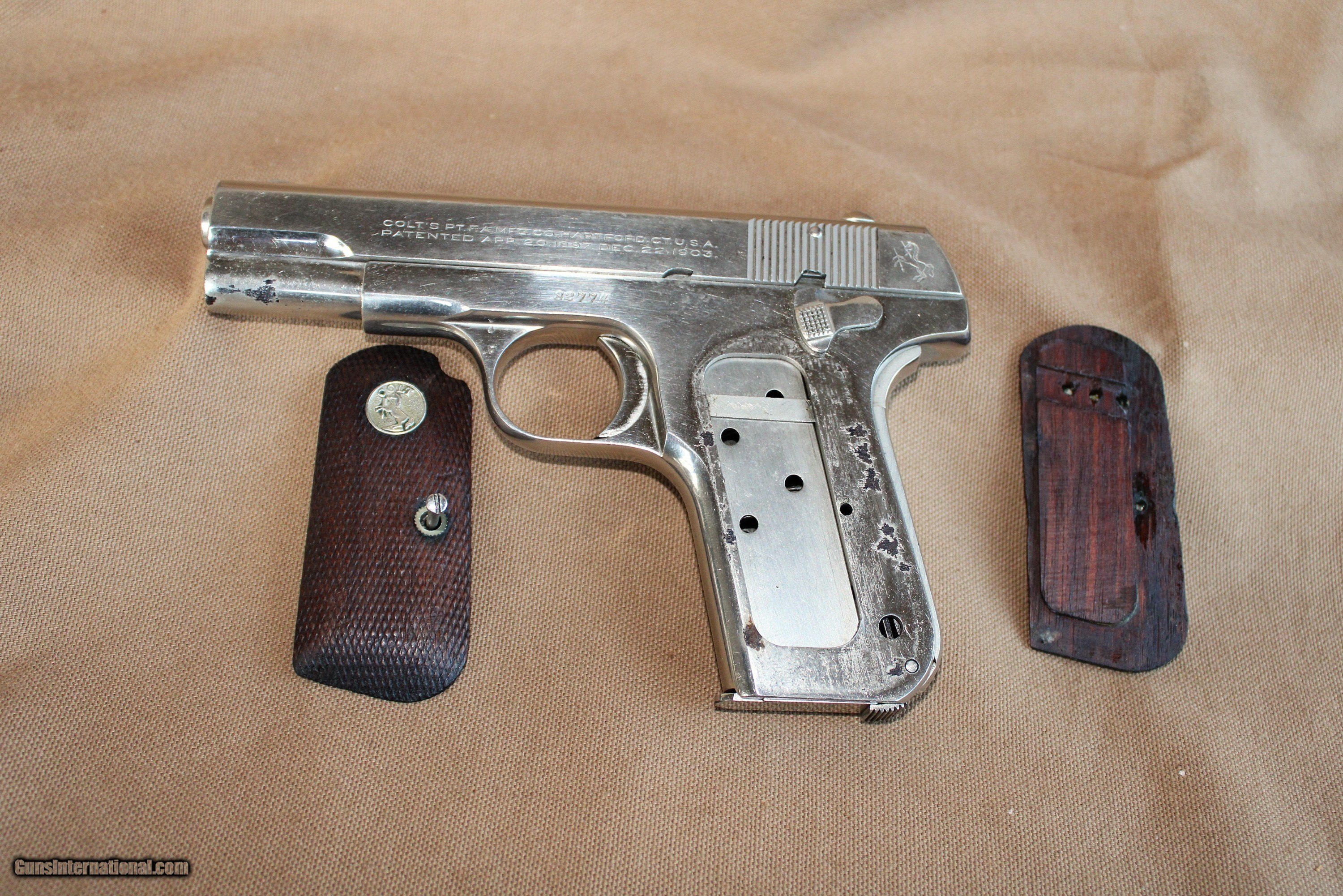 Description: This is a Colt model 1908 Hammerless Pocket Automatic pistol, chambered in the .380. It has the original factory nickel finish, wood grips and factory magazine. It was shipped to Stauffer Eshleman & Co., New Orleans, LA in 1925. This store, and it's founder have a very interesting history. The pistol is in excellent mechanical condition, showing only little signs of being fired. The bore is in very fine condition also. There is some cosmetic wear and errosion to the nickel finish, mainly under the grips and also a spot under the forward part of the slide. The checkered Colt grips are solid, showing some storage and carry wear. The box is in tattered shape, missing some pieces, held together with tape. The papers inside are very good considering it is 100 years old and was a New Orleans gun - overall a nice little Colt, and an above average survivor for the gulf coast climate. **** Must ship to a FFL, C&R okay. Please know your local laws before . Certified funds, check preferred, however i can accept a C.Card with an added 3% fee. **** Thank you Curio/Relic: Yes Handgun Caliber: .380 ACP (9x17mm Browning Short) Manufacturer: Colt Model: 1908 Serial Number: 82774 Barrel Length: 3 3/4 Condition: very good original Bore Condition: excellent Price: $1,625.00 Shipping: $50.00 Contact Seller |