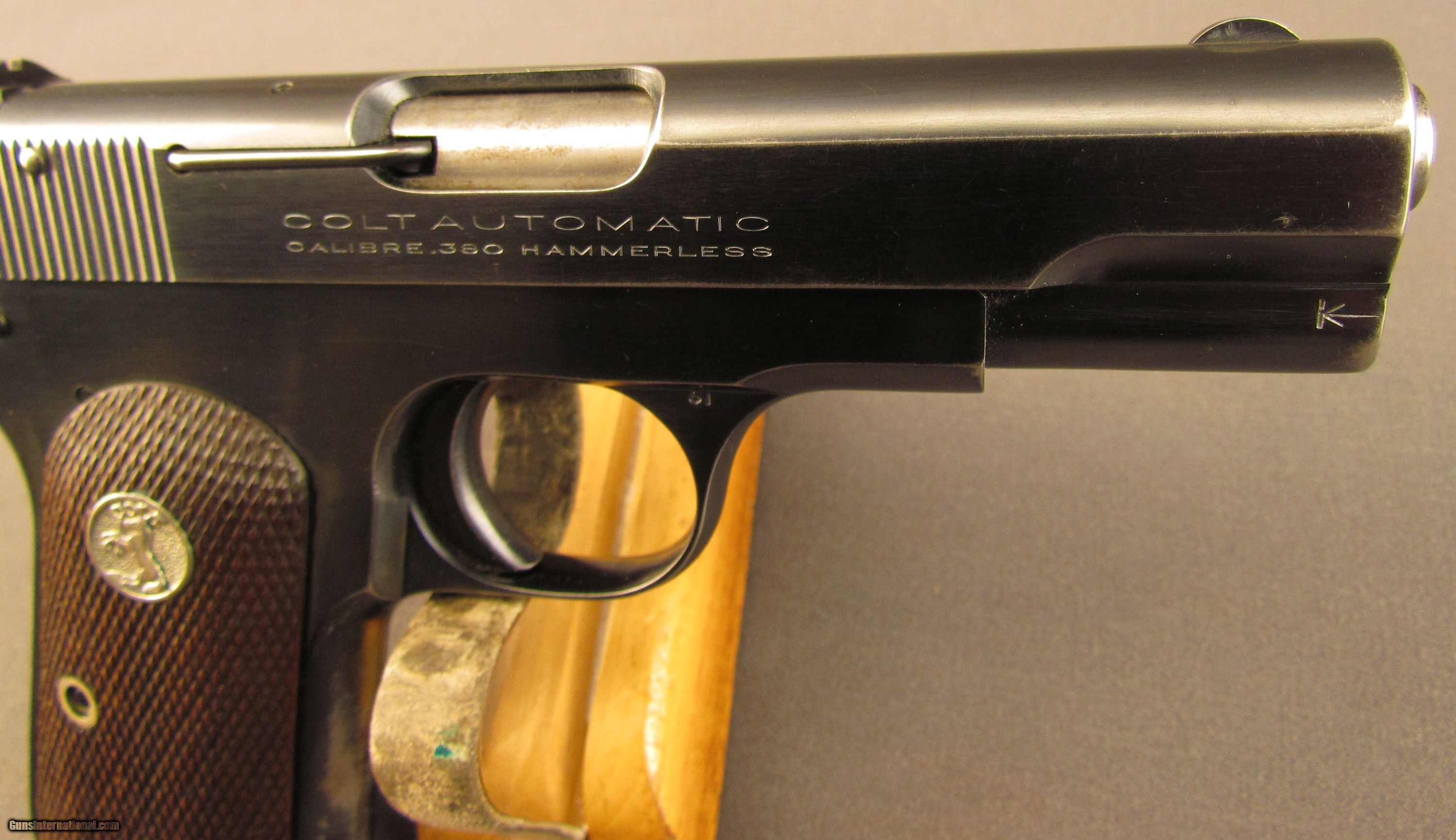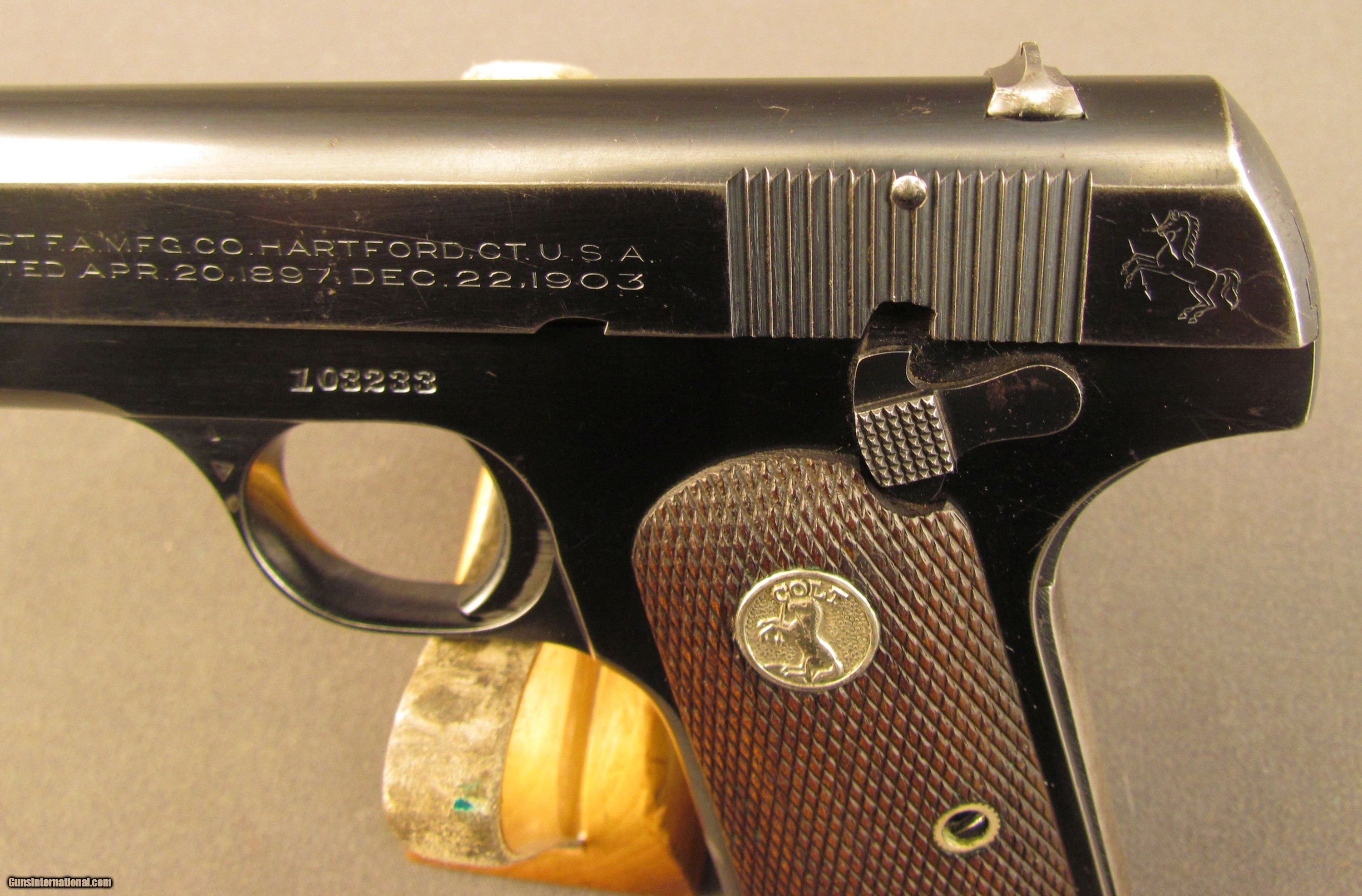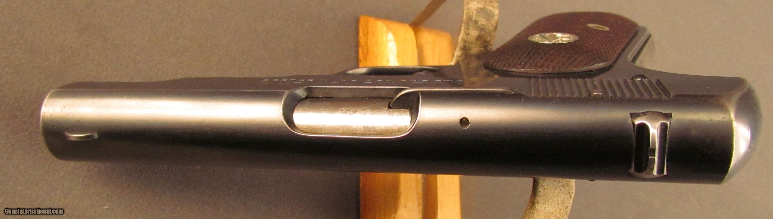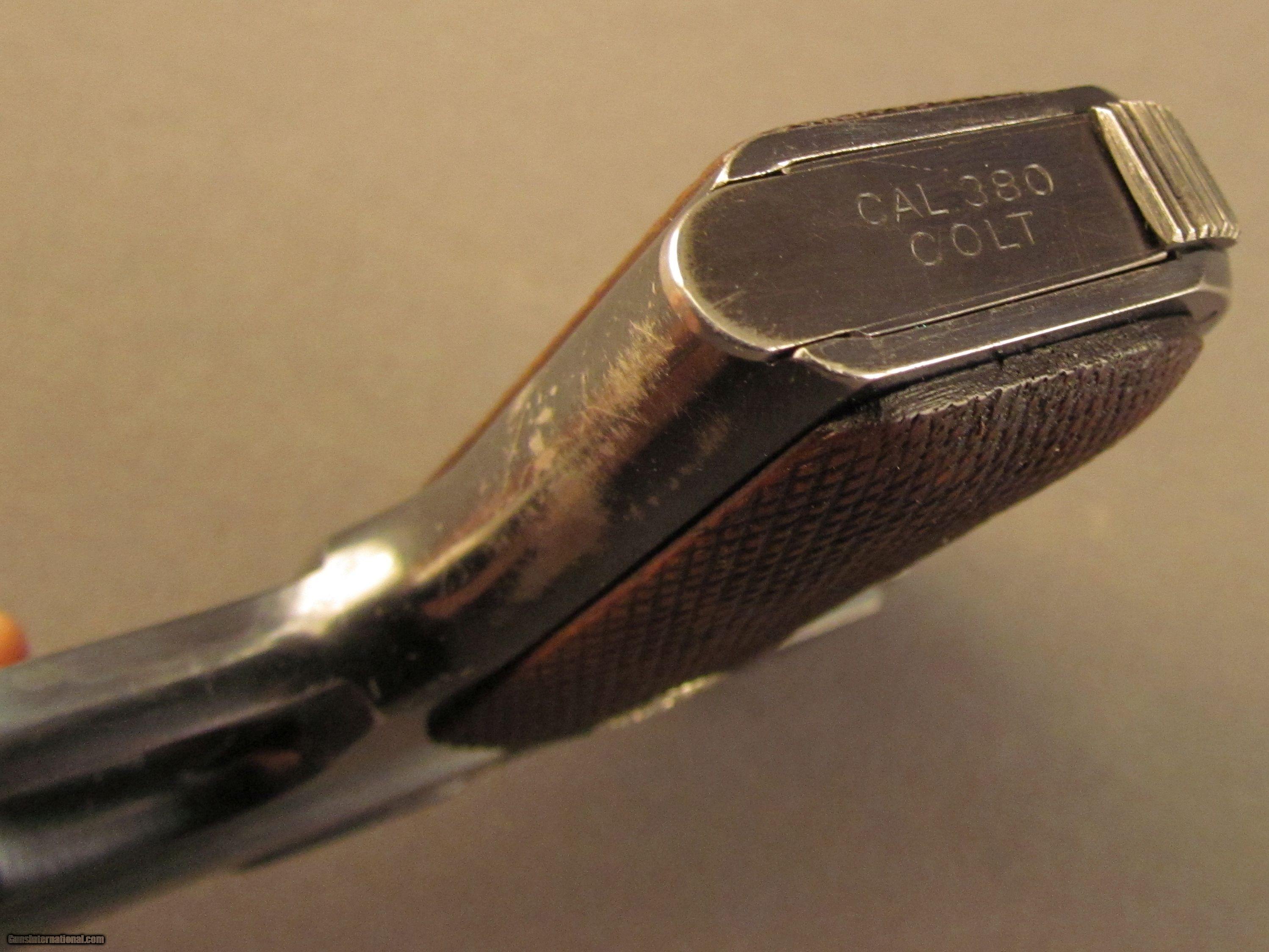 Description: Serial #103233, .380 ACP, 3 1/2” barrel with an excellent, bright bore. This is a 1930-made pistol that retains 92-95% of the original blue finish with some mild silvering and fading along the edges and projections. The fading is heaviest along the length of the grip safety, which has a SOLD Curio/Relic: Yes Manufacturer: Colt Model: 1908 Serial Number: 103233 Caliber Info: .380 ACP Gauge Info: .380 ACP |