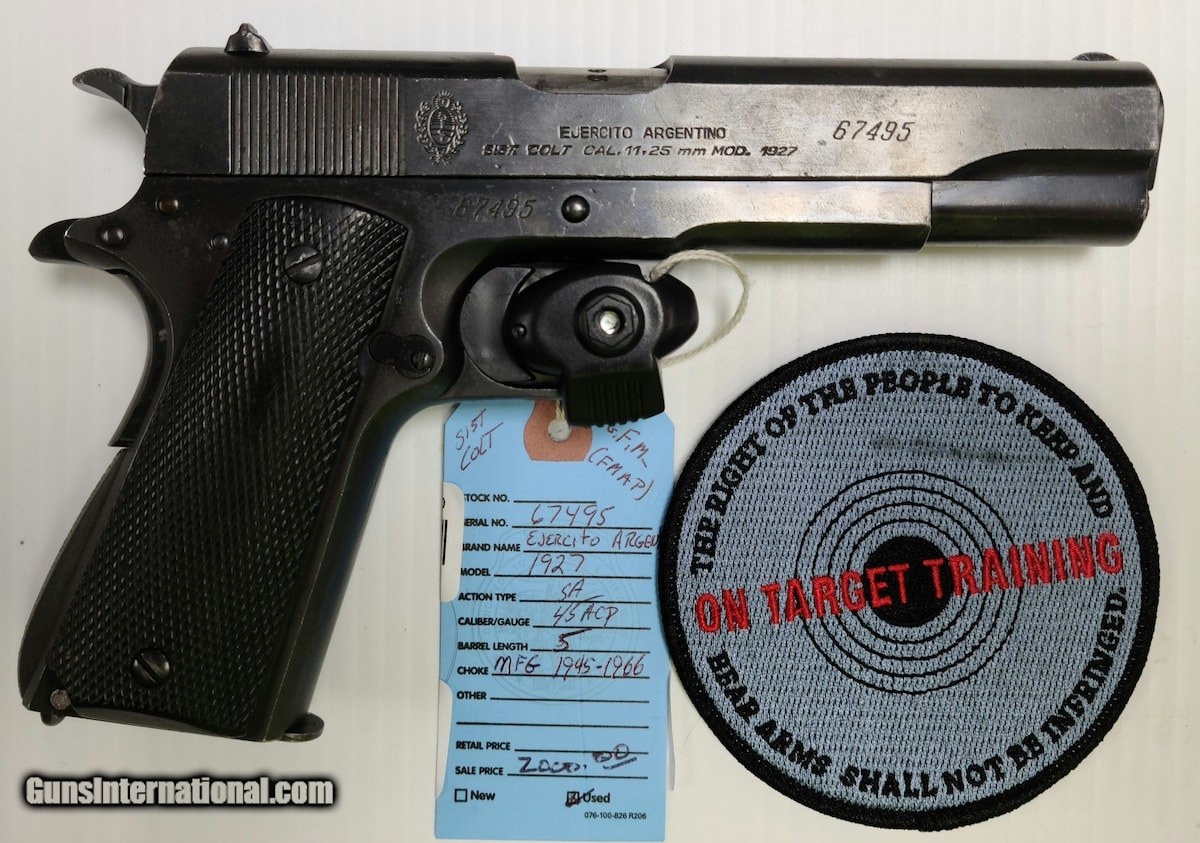 Description: Guns Listing ID: 634678 NICE PRE-OWNED ARGENTINE COLT 1911 45 CAL. THIS IS THE ARGENTINE CONTRACTED PISTOL MODEL OF 1927 MARKED DGFM MANUFACTURED 1945-1966, ALL MATCHING NUMBERS. We put all the information we have about these guns on the blue shop tags and the on-line listing. Not interested in trades, and PRICES ARE FIRM, NO OFFERS ACCEPTED. We do not offer layaway. We reserve the right to sell this item in our store at any time. Please be certain that you want this item as all sales are final. Used guns and parts almost always have some small degree of imperfection visually, and we do not have the ability to test fire, so we are never 100% certain the functionality. No warranty is stated or implied. SOLD Manufacturer: COLT Model: MODEL 1927 (1911 ARGENTINE CONTRACT) Caliber Info: 45 ACP Condition: Used - Non-Certified Barrels: 5 BARREL Finish: BLACK |