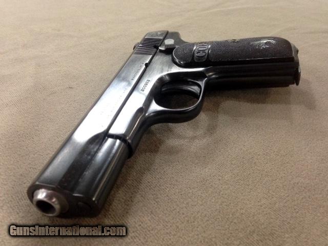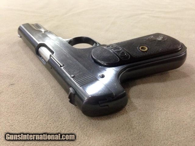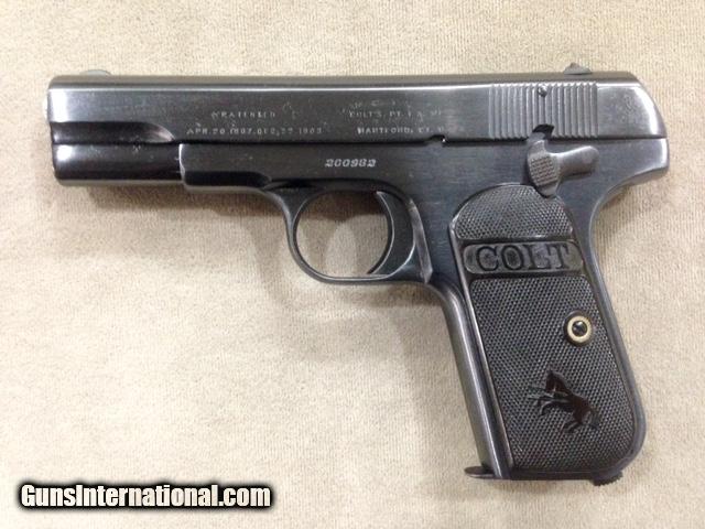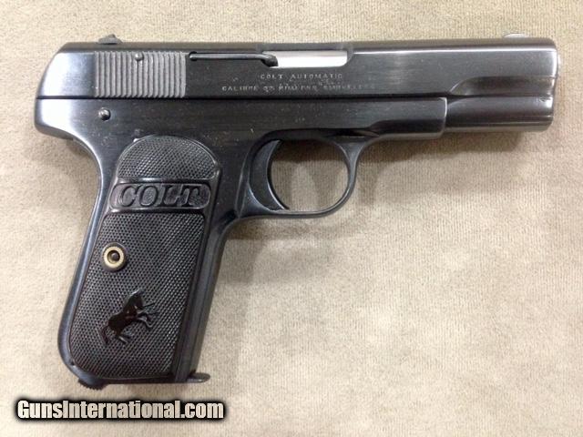 Description: What a nice little .32 auto shooter! This Colt Hammerless Pistol has been recently been refinished and is in excellent condition. Nice bright bore and chamber, etc. Original factory hard rubber grips are absolutely perfect in all respects including the heat blue on the attaching screw. A wonderful flat carry gun that won't break the bank - and still a classic pistola. Serial range 20098x. SOLD Curio/Relic: Yes |