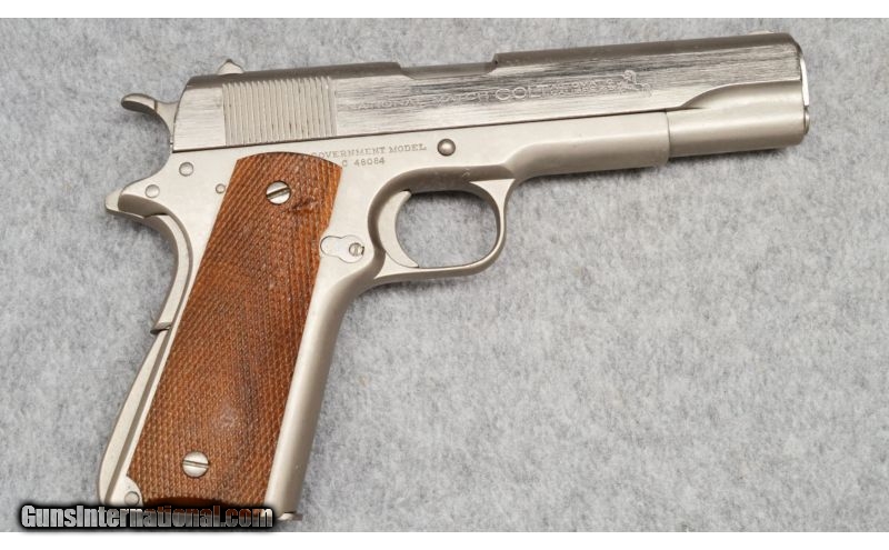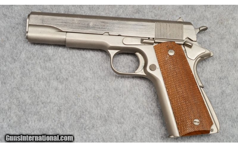 Description: SOLD Caliber Info: .45 ACP Metal Condition: Fair. Originally blued, has been electroless nickel plated. Scratches on the frame and slide. Wood Condition: Fair with handling marks. Bore Condition: Dull with pitting and good rifling. Barrels: 5 Stock: Checkered walnut grips. Weight: 37-ozs. Sights: Front blade, rear notch. Item Location: Fort Worth, TX |