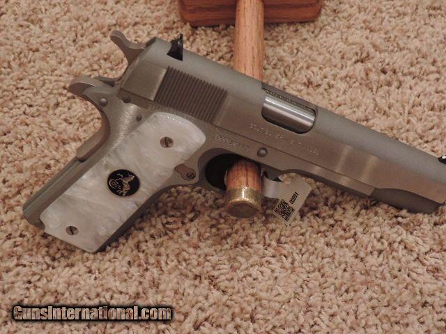 Description: COLT O2091 1911 STYLE GOVERNMENT 38 SUPER SINGLE ACTION SEMI AUTOMATIC PISTOL - STAINLESS FINISH, STEEL FRAME, WHITE PEARLITE GRIPS WITH SILVER RAMPANT HORSE & COLT INSIGNIA IN DEEP BLUE BACKGROUND, (2) 9 RD MAGS, 5 INCH BARREL, WHITE DOT SIGHTS, STANDARD GRIP/THUMB SAFETY. NEW IN BOX. SUBJECT TO PRIOR STORE SALE. SHIP TO FFL ONLY. BUYER RESPONSIBLE TO DETERMINE IF FIREARM IS LEGAL IN HIS/HER STATE. BUYER PAYS 3% FOR CREDIT CARD. BUYER PAYS $30.00 SHIPPING TO LOWER 48 STATES. ARIZONA RESIDENTS PAY 6.712% SALES TAX. SOLD Manufacturer: COLT Model: O2091 Serial Number: 38SS10112 Caliber Info: 38 SUPER Condition: New in Box |