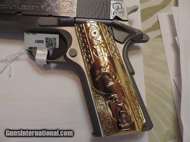 Description: COLT GOVERNMENT MODEL O2091 CUSTOM ENGRAVED 38 SUPER SEMI AUTO PISTOL. BRUSHED STAINLESS STEEL - CUSTOM METAL GOLD PLATED GRIPS WITH GOLD COLT SCREWS- SINGLE ACTION - 5 INCH BARREL - MANUAL & GRIP SAFETY - FRONT HIGH PROFILE 1-DOT SIGHT - REAR HIGH PROFILE 2-DOT SIGHT ONE (1) CAPACITY 9+1 - STAINLESS STEEL RECEIVER, SERVICE HAMMER, FLAT MAINSPRING HOUSING, LONG TRIGGER. SUBJECT TO PRIOR STORE SALE. SHIP TO FFL ONLY. BUYER RESPONSIBLE TO DETERMINE IF FIREARM IS LEGAL IN HIS/HER STATE. NO CREDIT CARD FEE. FREE SHIPPING TO LOWER 48 STATES. SOLD Manufacturer: COLT Model: O2091 Serial Number: 38SS10241 Caliber Info: 38 SUPER Condition: New in Box |