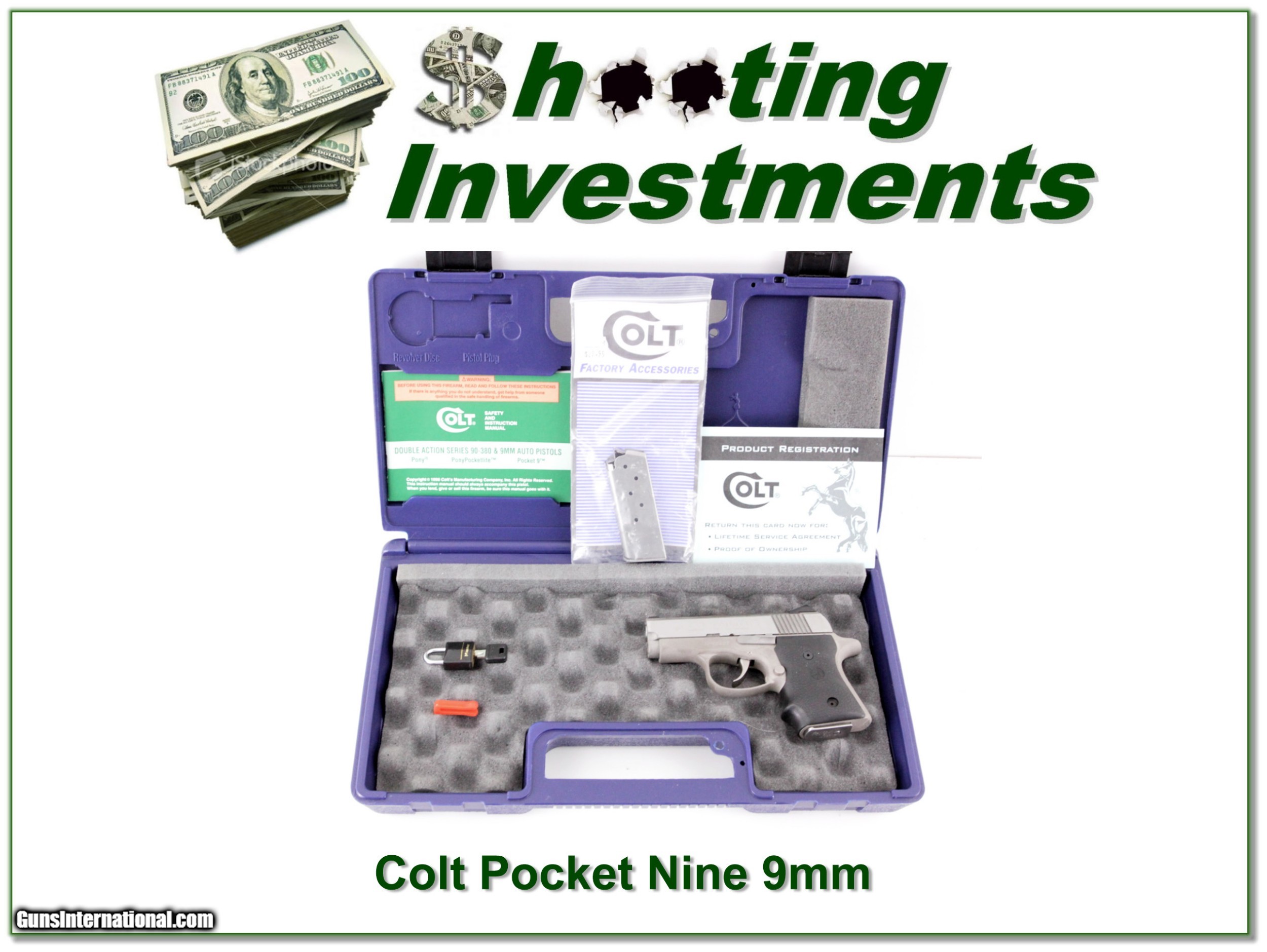 Description: This is a new and unfired Colt Pocket Nine Series 90 Stainless in 9mm. It comes as seen in case with 2 magazines. I am selling this one on consignment and as such lay-a-way can’t be used. It does of course have the standard 3-day inspection. Shipping with insurance is $39. Please email me with any questions or larger pictures. (Consign your quality firearms with Shooting Investments for only 12%! Let me know if you have any you would like to sell!) 18-1216 Payment: Payment is by Money Order, Cashiers Check or Personal Check. I can now also accept MasterCard and Visa with a 3% convenience fee. PayPal can be used for some items but never firearms. Please let us know if you would like to pay via PayPal. Shipping: The shipping charge will be listed in each description. It is $39 for most firearms. Some heavy guns or those insured for over $2000 will be higher. Shipments to Alaska and Hawaii are higher because air shipment is required. Most firearms are shipped on Tuesday and Thursday and usually in 5 days of receipt of payment. We package all shipments carefully and insure them. Optics are shipped Priority Mail and most other non-firearm shipments are shipped First Class. Returns: Our return policy is simple. If for any reason you are not pleased with your purchase, you may return your item for a full refund of purchase price. Ammunition cannot be returned. It is important to us that you are happy. Guns cannot be fired or dissembled before returning them and they must be returned in the same condition as received. Notification of a return must occur with-in 3 days of receipt at your dealer. Shipping, convenience and dealer fees are not refundable and are the responsibility of the buyer. Lay-a-way: If needed, we offer a 60 day lay-a-way option on most firearms. It is 1/3 now, 1/3 in 30 days and 1/3 in 60 days. Lay-a-way firearm sales are final and if not completed the first payment cannot be returned. Consigning your firearms with Shooting Investments: We will help you get top dollar for your firearms. While most local guns shops charge 20% or more, our fee is only 12% with a minimum of $75. At your local gun shop it might take months to sell. Selling on-line provides instant access to thousands of interested buyers. You won’t find any other on-line dealer willing to sell your firearms for only 12% or listing every gun on 3 separate s. Selling through an House typically costs the seller 15% and the buyer an addition 15% (so 30%) and you have to wait several months to sell and longer to receive funds. If properly priced, we will sell your firearms in a few weeks. Send us an email or give us a call and we’ll explain how easy it is for you to get top dollar. Trading: Trading for use is really just buying your gun to re-sell. If you have a gun you want to trade, please email a picture and we will let you know what we can give or it. You will always get more if we sell it for you on consignment. Help for California Buyers: We are happy to ship to California. It is the buyer’s responsibility to make sure any item you buy is legal in your state. We are also happy to help with your purchase of a firearm from someone other than us. If you see a gun you would like to buy but the seller can’t or won’t ship to California they can ship to use and we’ll then ship it to your California dealer. The cost for this service is only $30 + shipping. Let us know if we can help! SOLD |