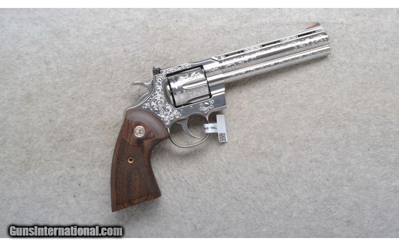 Description: This Colt Model Python (SP6WTS) is a 6 shot double action stainless steel revolver in .357 Magnum Cal. It has a 6 inch ventilated rib barrel. A blade front sight with orange and an adjustable notch rear sight. The grip is a checkered walnut with silver Colt horse medallions. This gun is uniquely and very nicely engraved in scroll. Serial Number PY231465. .357 Magnum SOLD Chambers: 6 shot. Metal Condition: Excellent. Wood Condition: Excellent. Bore Condition: Excellent. Barrels: 6 inch ventilated rib stainless steel barrel. Triggers: SA/DA Weight: 46 oz. Sights: Blade front with orange. Adjustable notch rear. Item Location: Richfield, WI |