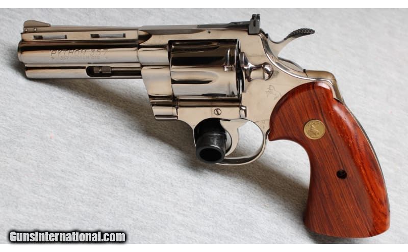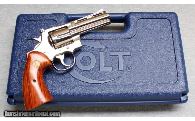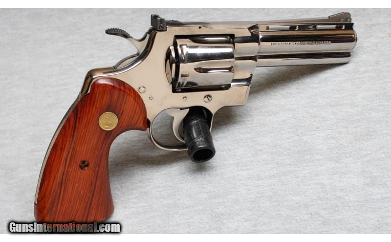 Description: Appears as new, with factory hard case. Classic Colt magnum revolver, 4" ribbed barrel with full underlug and shrouded ejector, polished nickel finish, 6 shot fluted cylinder, adjustable rear & ramp front sights, and Colt factory smooth hardwood grips. Manufactured in 1975, an excellent choice for Colt collectors. .357 Magnum SOLD Metal Condition: As new Wood Condition: Very good Bore Condition: Bright Triggers: Double and single action Fore End: N/a Sights: """Adjustable rear, ramp front sights"" Chokes: N/a Item Location: Rossford, OH |