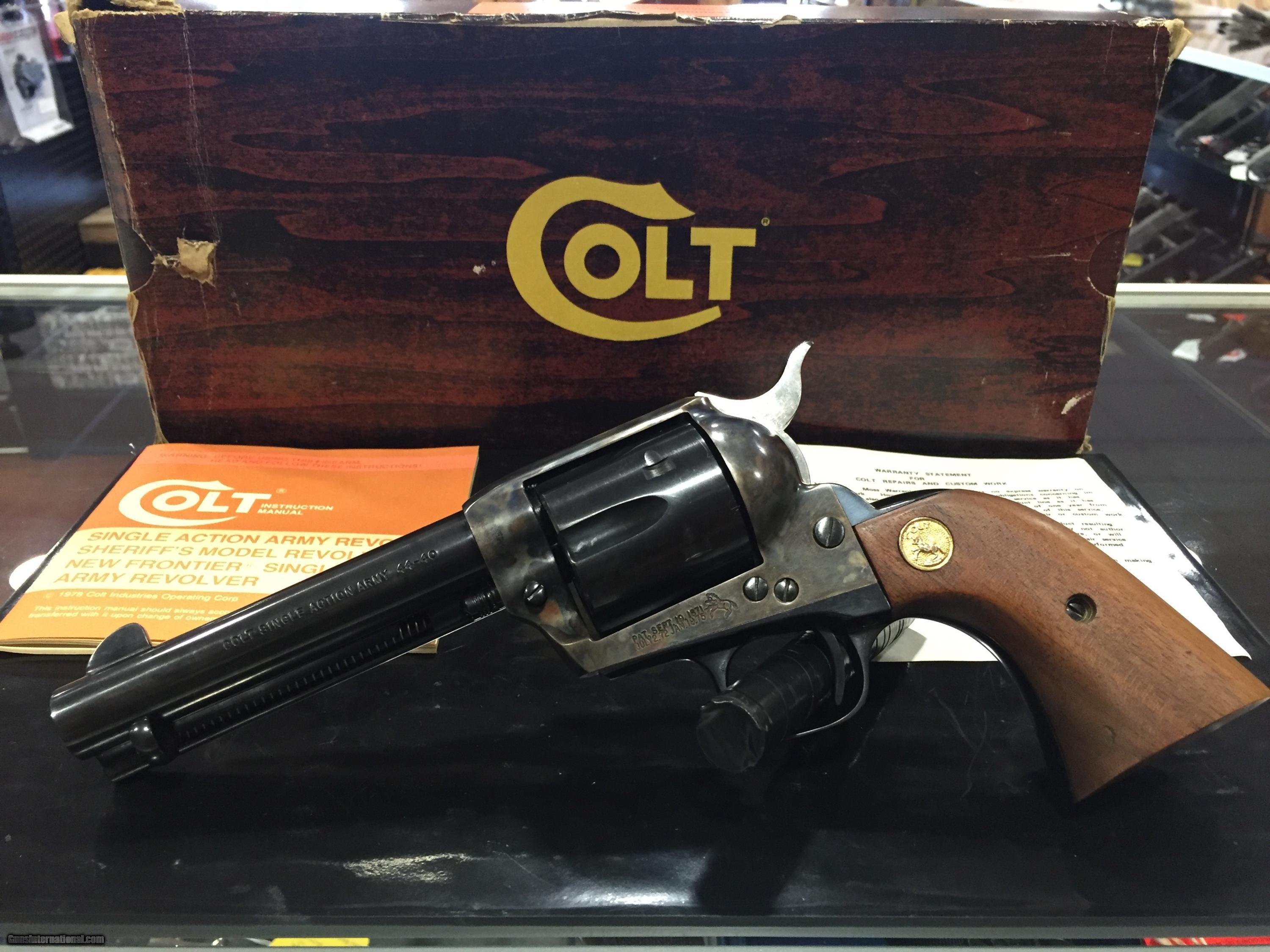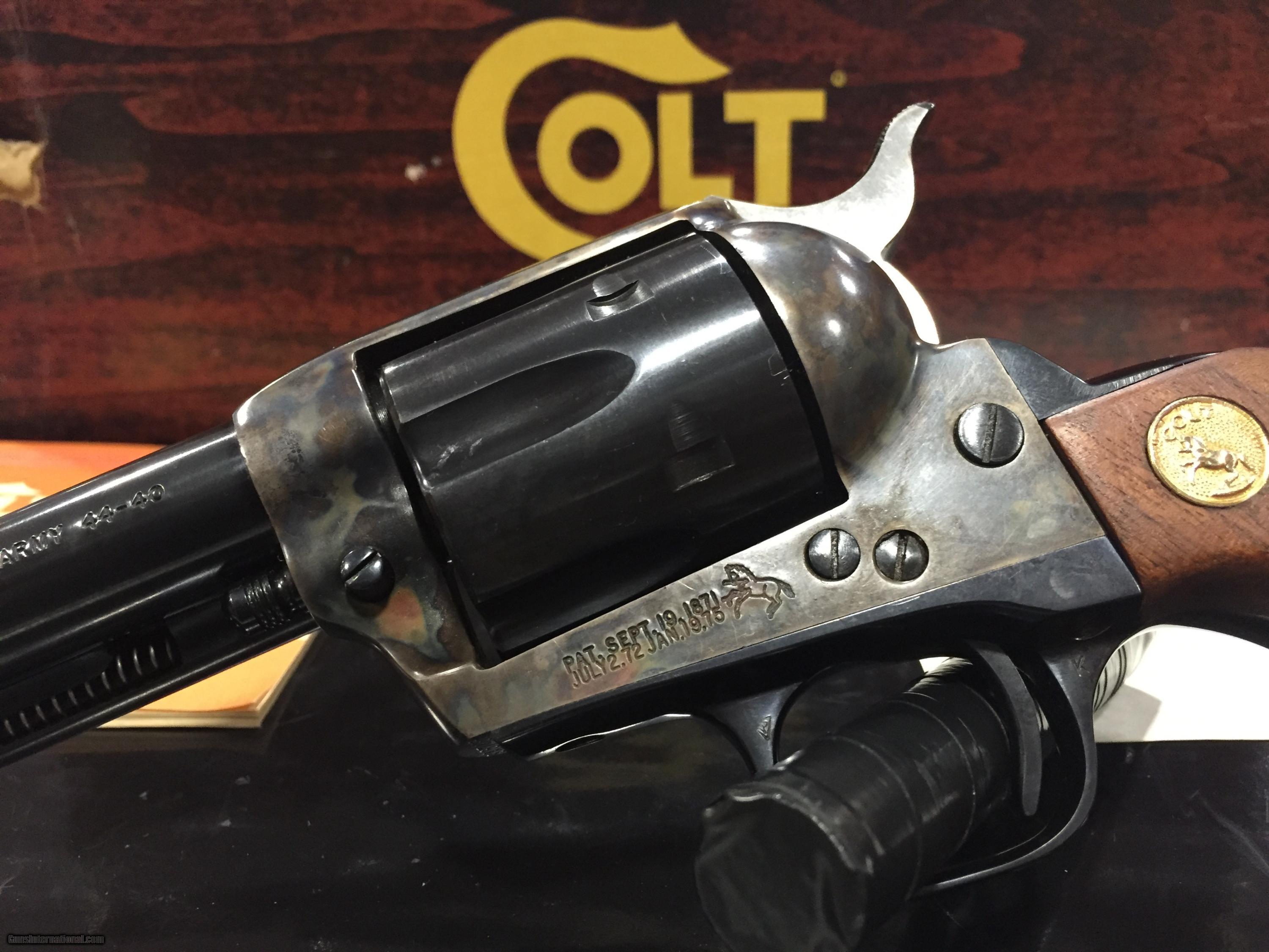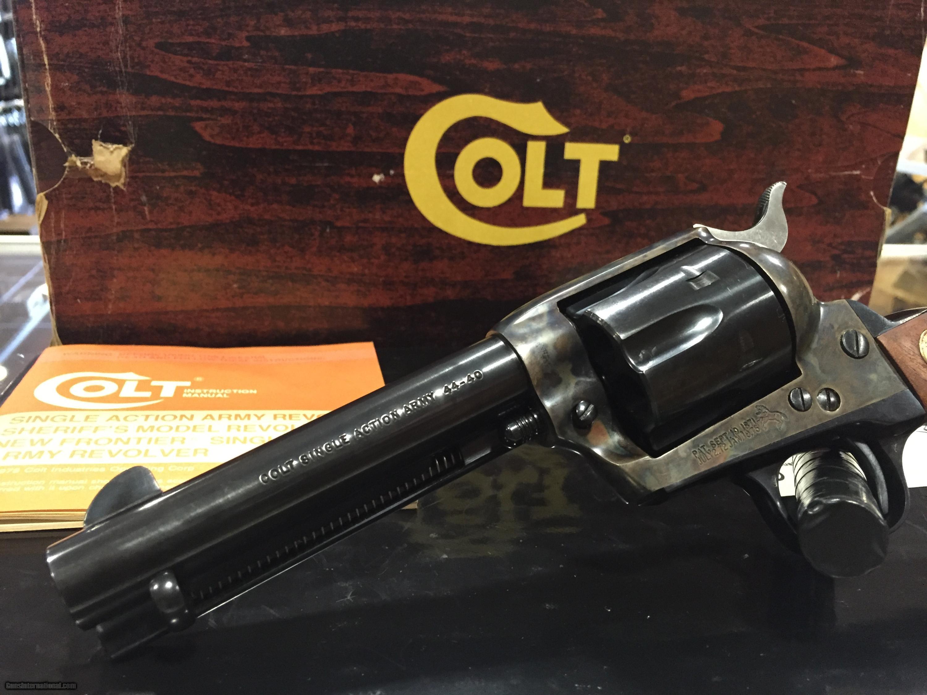 Description: THIS IS A BEAUTIFUL COLT SINGLE ACTION 44-40 CALIBER. THIS COLT IS A 3RD GENERATION AND IS IN IMMACULATE CONDITION. THIS GUN COMES WITH THE ORIGINAL BOX AND PAPERWORK. + $25.00 SHIPPING CHARGE ***SORRY, NO SALE TO CALIFORNIA*** SOLD |